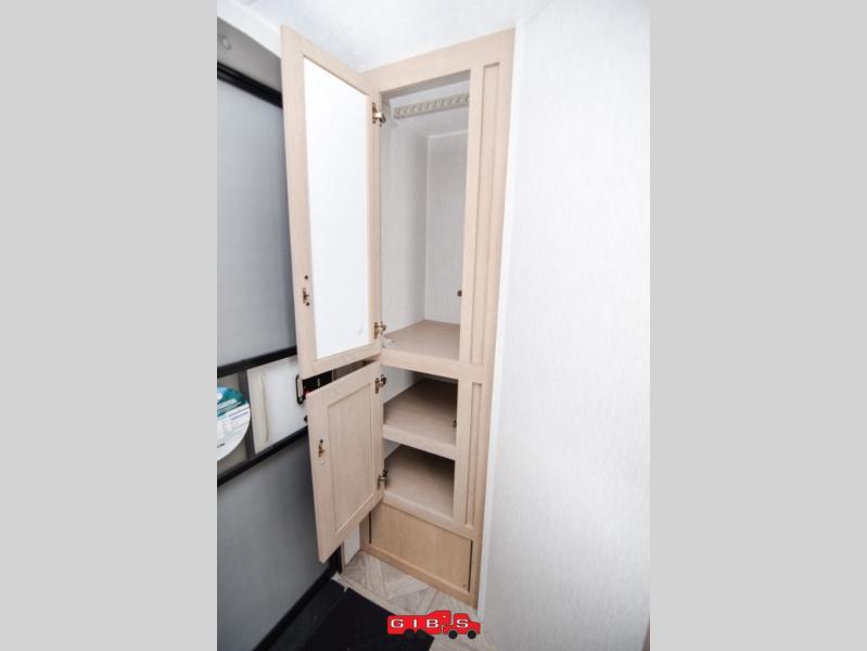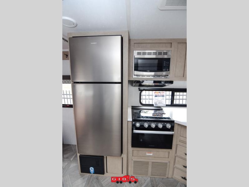 This is a great couples trailer with a semi-private front bedroom with a queen bed and dual wardrobes, plus windows for great views and ventilation when you want fresh air while you relax. There is a slide out U-shaped dinette for dining, and a galley kitchen and a full bathroom with a space savings radius shower. Yet a family of four would also love this spacious yet compact trailer by utilizing the dinette as sleeping space. And don't forget about the 14' power awning that offers protection from the elements while relaxing outside on your camping chairs.