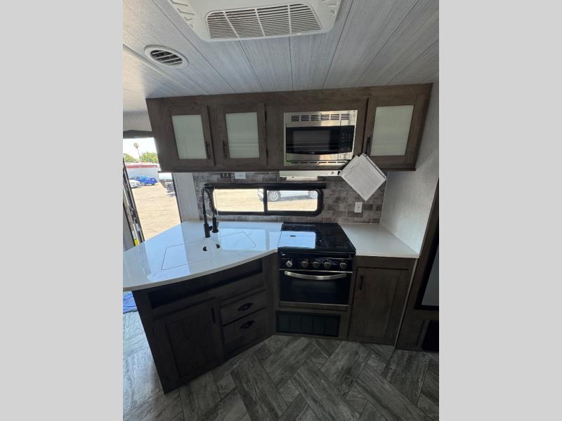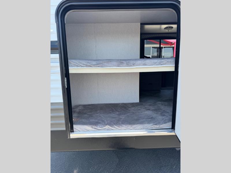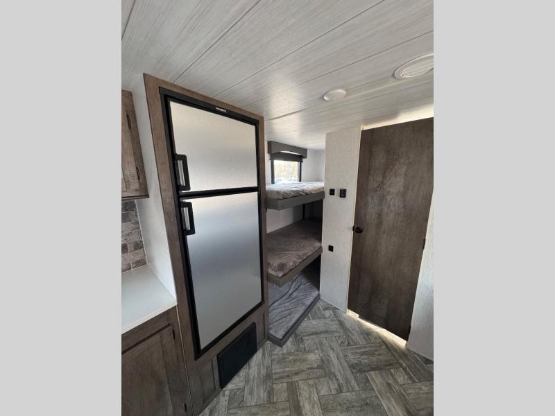 You can't pass up this spacious travel trailer that can sleep nine people each night! The little ones will love the triple bunks in the back, and you'll have an RV king bed in the front private bedroom. Any other guests can sleep on the U-shaped dinette and sofa, and the large slide here will provide everyone space to stretch out. This model includes a three burner range, a microwave oven, plus a 17" oven to cook all of your meals, and the 8 cu. ft. double door refrigerator will keep your perishables fresh.