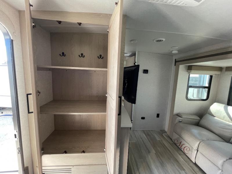 This Flagstaff Micro Lite travel trailer is going to make your camping dreams come true! With a queen bed slide and a large wardrobe in the private bedroom, you will have all that you need for sleeping and storing your belongings. Plus, the second exterior entry door leads right into the bedroom so that you can escape for an early morning run without running through the entire trailer to get outside. The front kitchen is open and accommodating with its helpful tools, and the 67" theater seat is right next to the double-door refrigerator on the slide out. Right next to the front entry door is a coat closet so that you can keep your jackets readily available, and there is also a linen closet in the walk-through bath so that you can keep your towels ready for your shower.