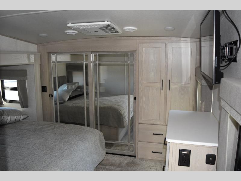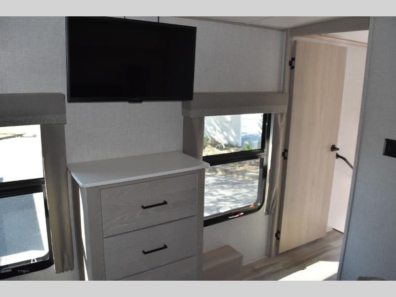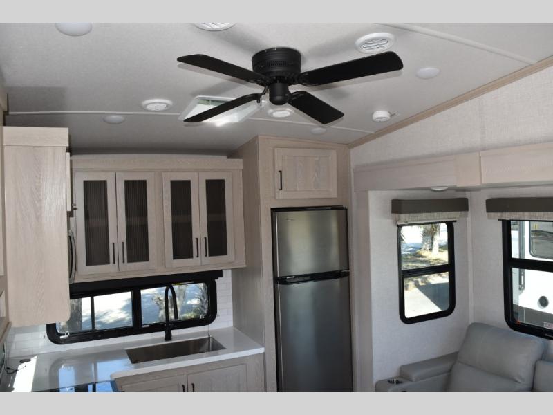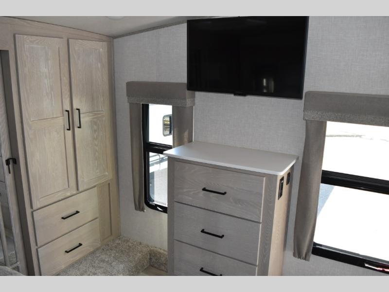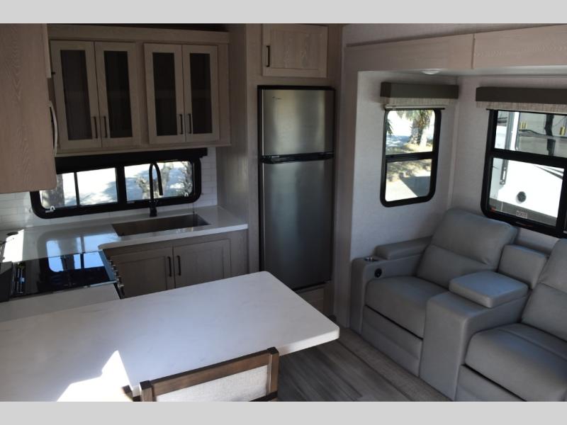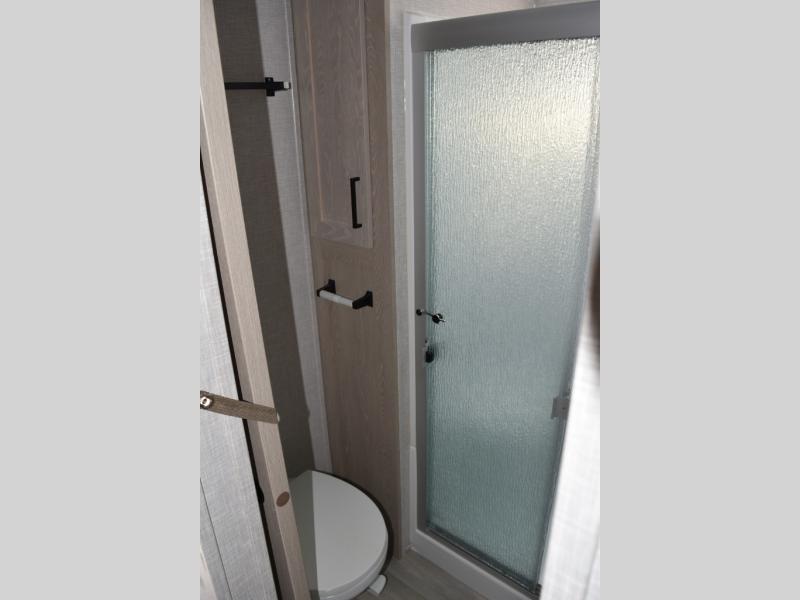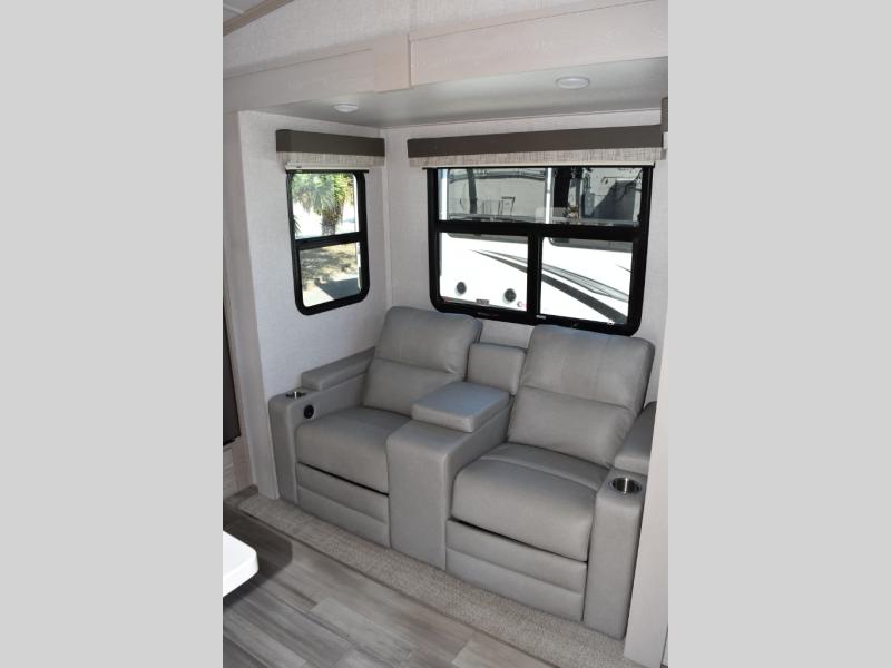Camp in comfort with your favorite person or your friends in this spacious bedroom and bathroom fifth wheel! From the shower with a seat and linen storage to the slide out queen bed or choose a king option, you will feel right at home. The bedroom also offers a dresser, a front wardrobe with shelves, and an optional TV. The main living area provides a hide-a-bed sofa that sleeps two or choose the theater seating option, a rear kitchen with a 11 cu. ft. refrigerator to store lots of food, and a bar top with seating to dine at. You can watch the LED TV before going to bed or each morning. And the 20' awning gives you even more living space outdoors protected from the outside elements.