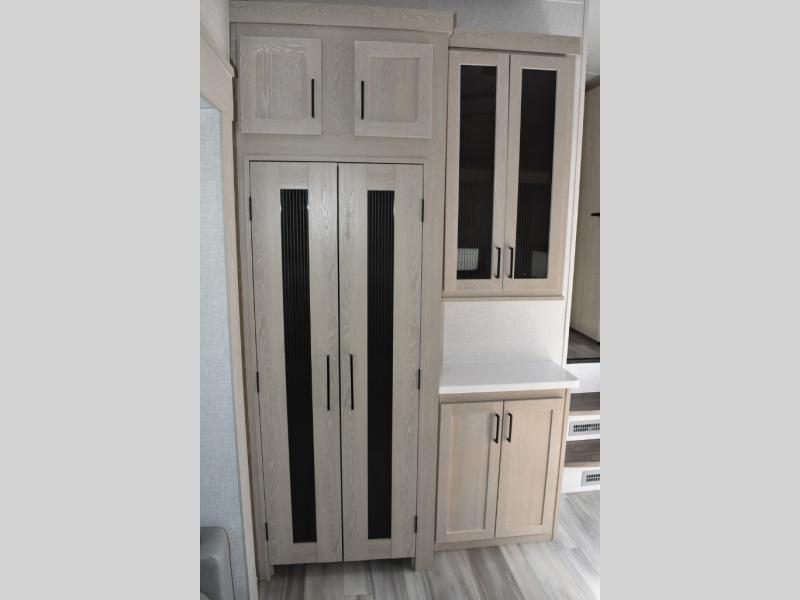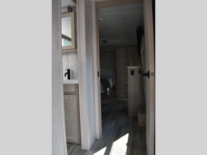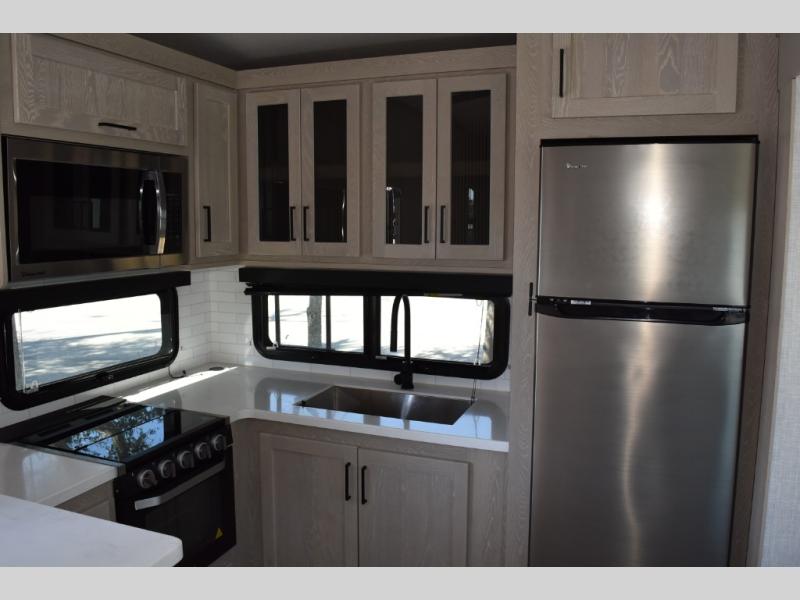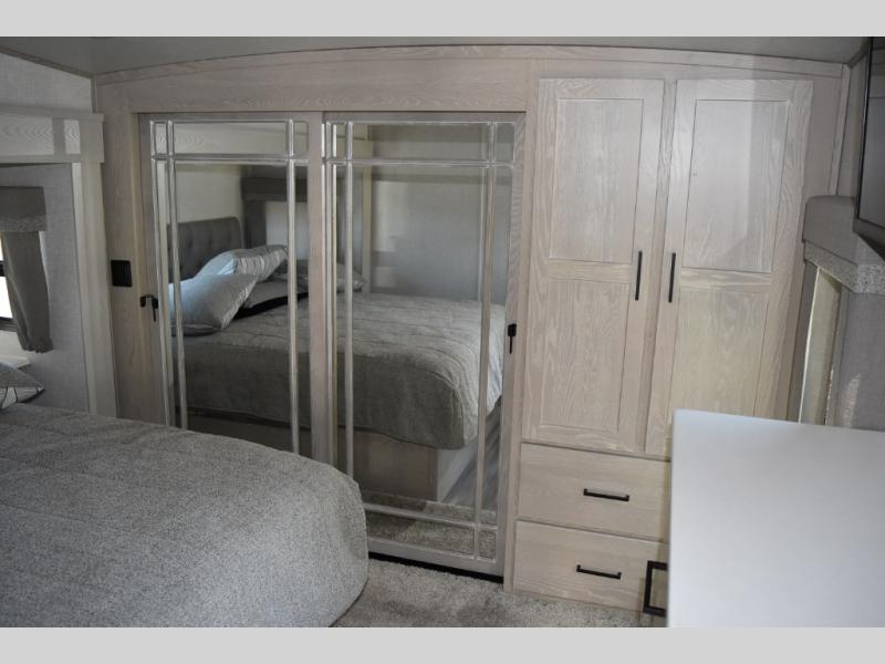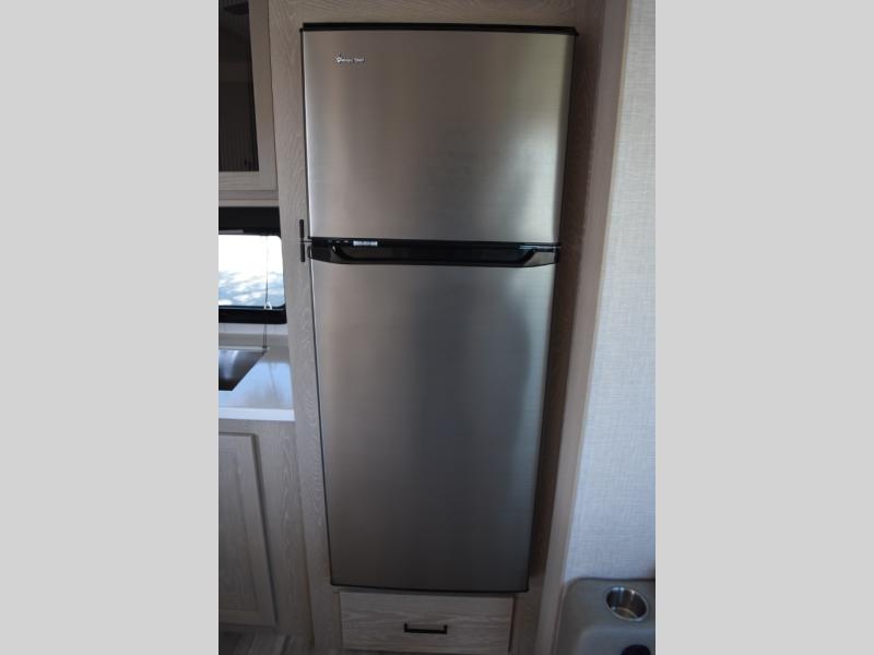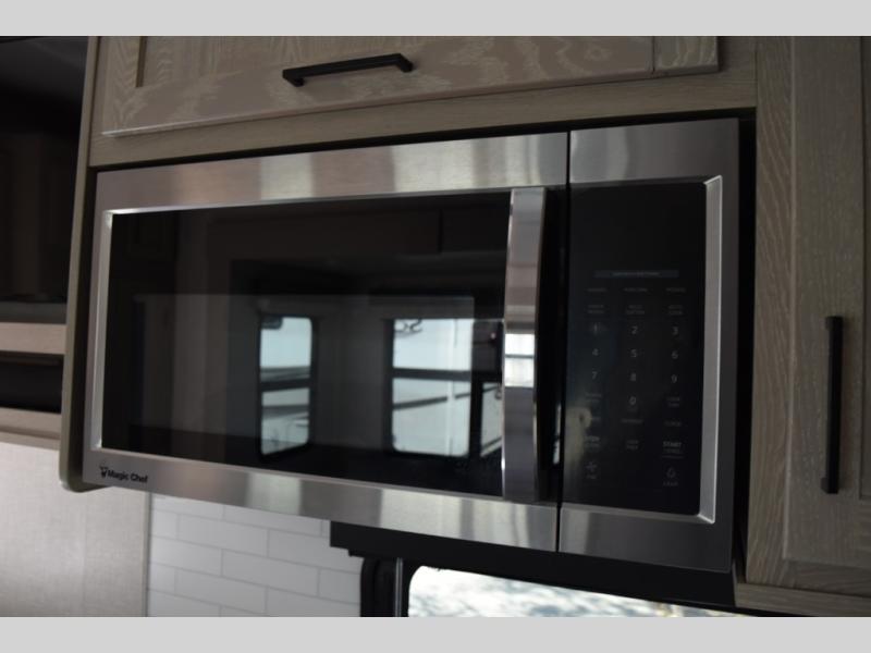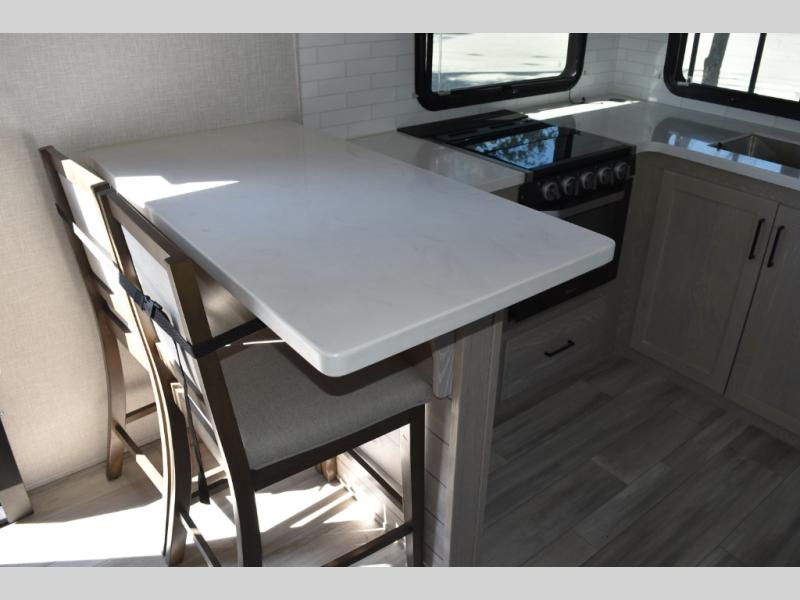 Camp in comfort with your favorite person or your friends in this spacious bedroom and bathroom fifth wheel! From the shower with a seat and linen storage to the slide out queen bed or choose a king option, you will feel right at home. The bedroom also offers a dresser, a front wardrobe with shelves, and an optional TV. The main living area provides a hide-a-bed sofa that sleeps two or choose the theater seating option, a rear kitchen with a 11 cu. ft. refrigerator to store lots of food, and a bar top with seating to dine at. You can watch the LED TV before going to bed or each morning. And the 20' awning gives you even more living space outdoors protected from the outside elements.