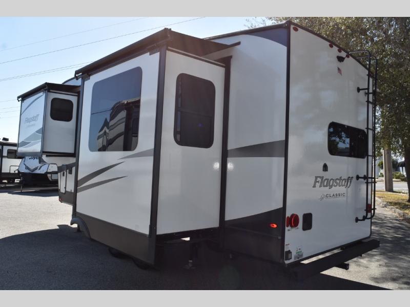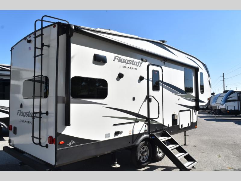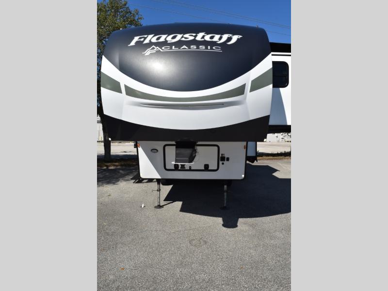 Each one of these Forest River Flagstaff Classic fifth wheels or travel trailers will be your home on wheels! Their quality craftsmanship and attention to detail shines through the surface-coated steel I-beam frame on fifth wheels, the enclosed underbelly, the radius roof with vaulted interior ceilings, and six-sided fully aluminum-framed floor, walls, and roof. Towing your unit will be easy with the torsion axle, Rubber-Ryde suspension, power tongue jack, and nitrogen-filled Goodyear Endurance tires. You will even reduce your use of water with the Showermiser water saving system in the bathroom. A few other convenient features you will enjoy include a control panel with WeRV app control, an upgraded backlit headboard, and an outside shower with hot and cold water. Come choose your favorite one today!