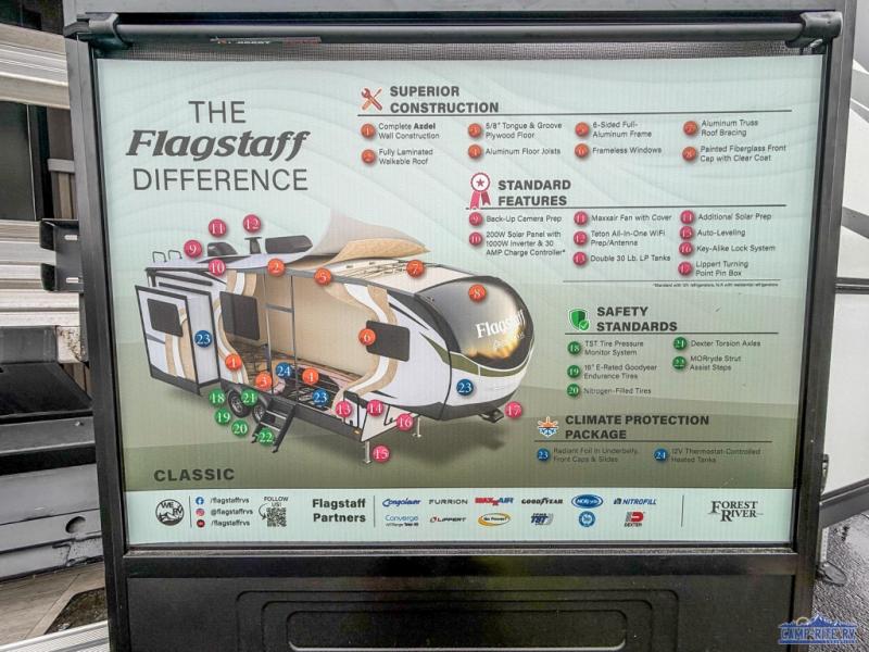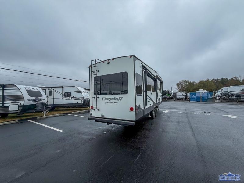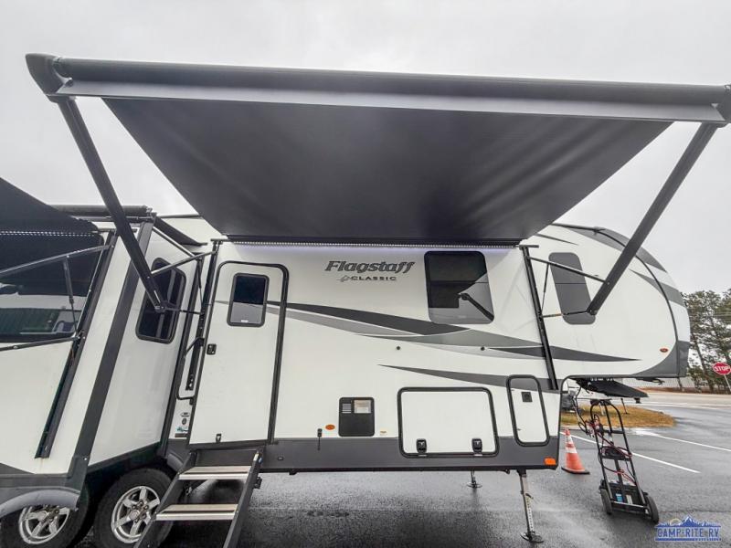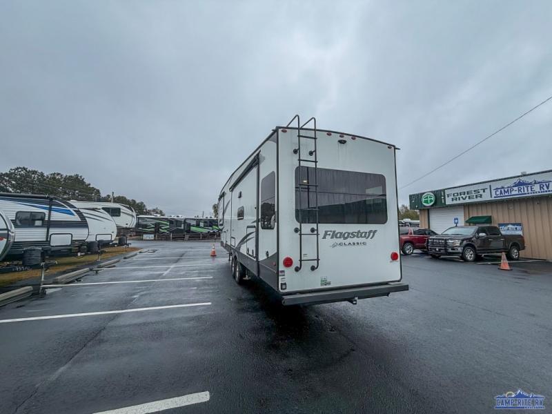 Each one of these Forest River Flagstaff Classic fifth wheels or travel trailers will be your home on wheels! Their quality craftsmanship and attention to detail shines through the surface-coated steel I-beam frame on fifth wheels, the enclosed underbelly, the radius roof with vaulted interior ceilings, and six-sided fully aluminum-framed floor, walls, and roof. Towing your unit will be easy with the torsion axle, Rubber-Ryde suspension, power tongue jack, and nitrogen-filled Goodyear Endurance tires. You will even reduce your use of water with the Showermiser water saving system in the bathroom. A few other convenient features you will enjoy include a control panel with WeRV app control, an upgraded backlit headboard, and an outside shower with hot and cold water. Come choose your favorite one today!