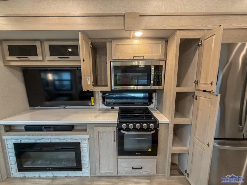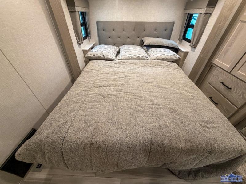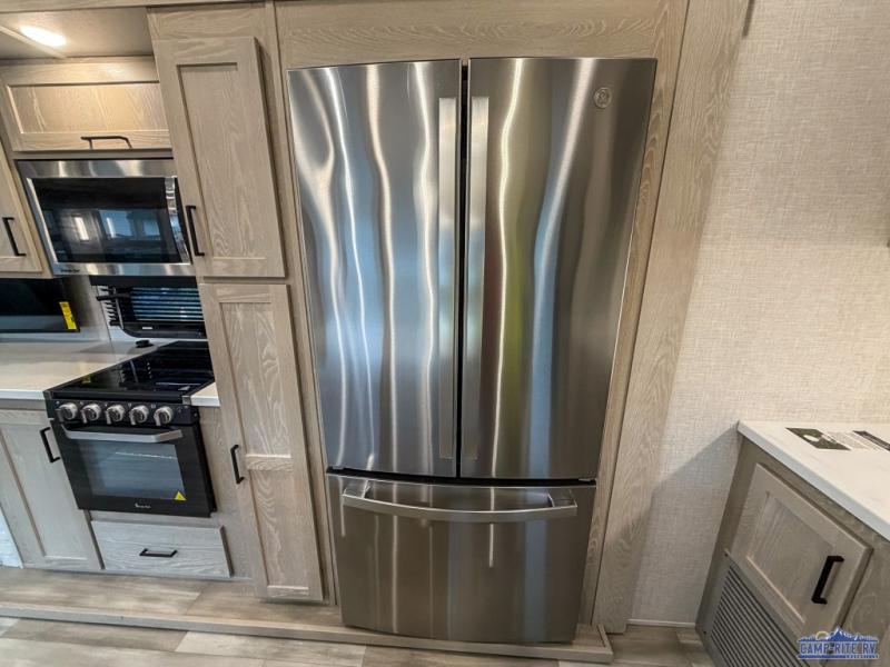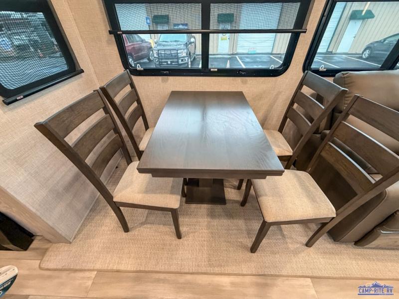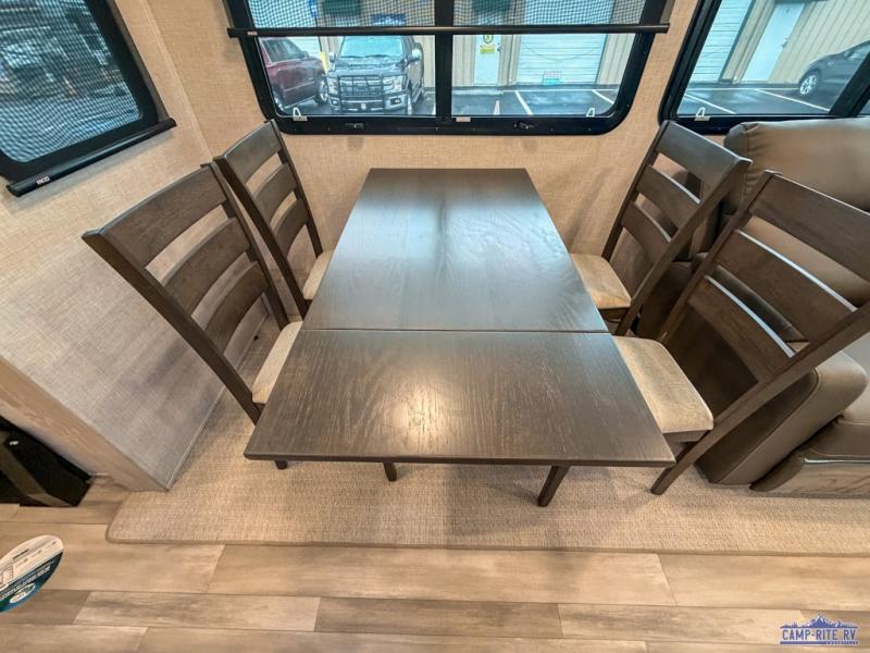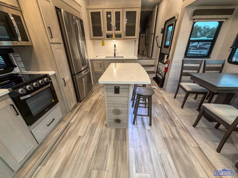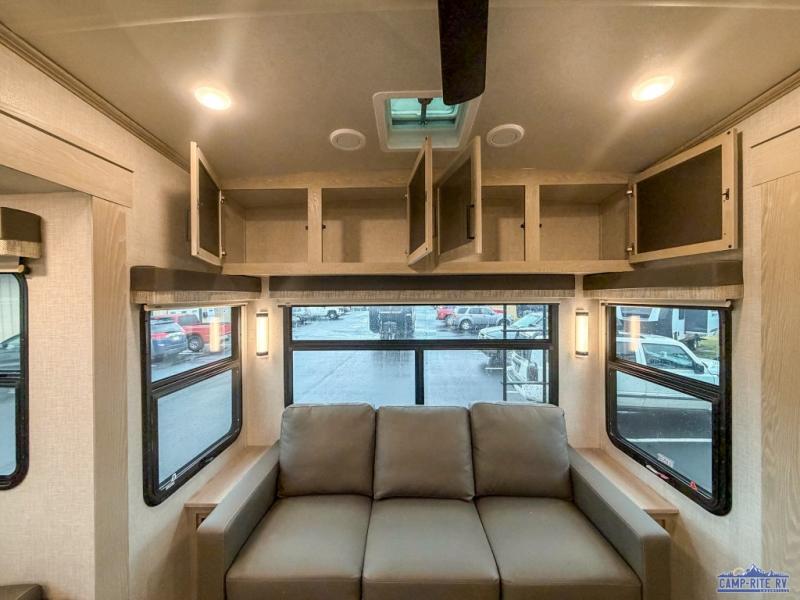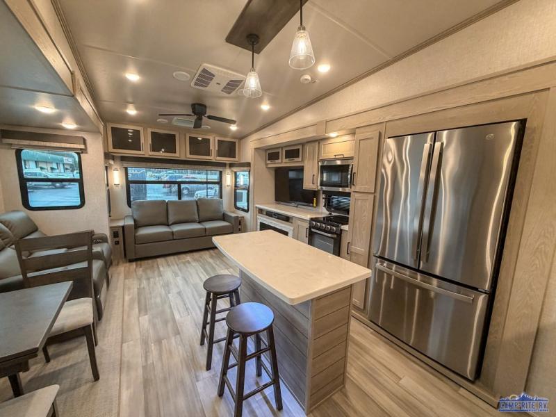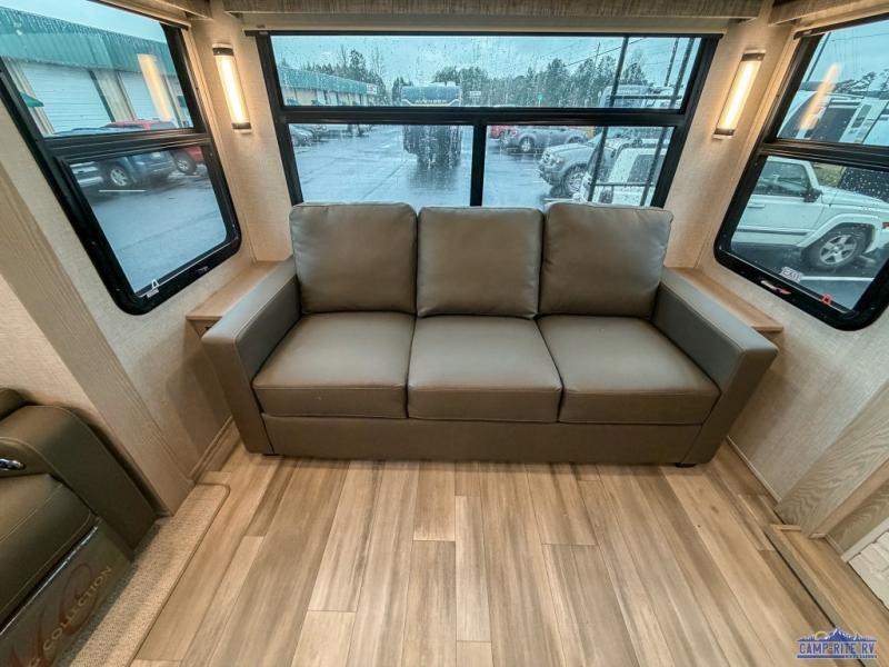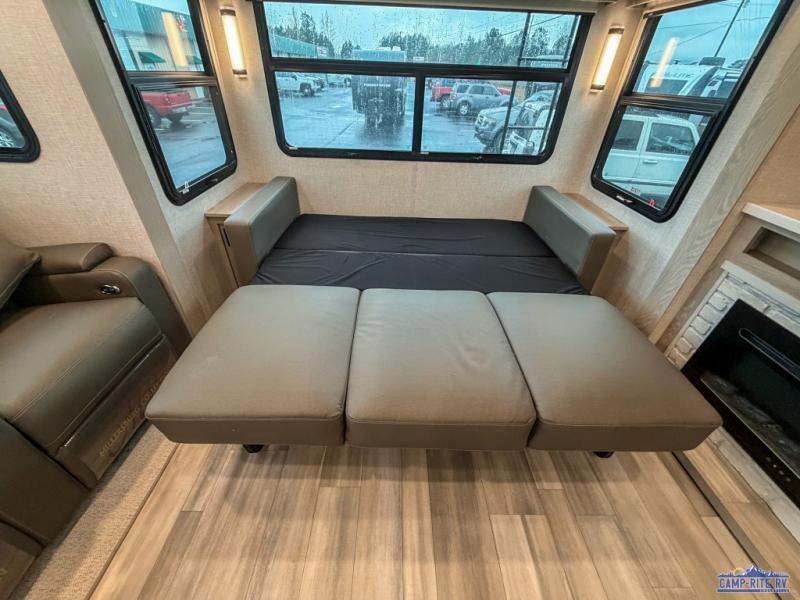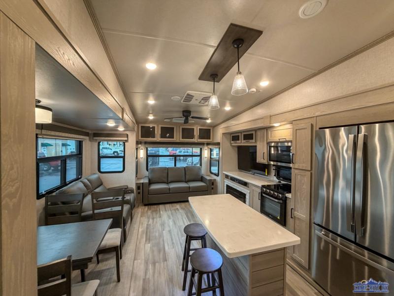 Get ready to enjoy the outdoors while inside with the enormous windows in both the rear, and the door side slide of this fifth wheel. The spacious main living area offers dual opposing slides giving you a great place to invite other RVers over to visit, eat and even play cards. There is seating for nine from the booth dinette, the theater seats and the rear hide-a-bed sofa. The cook will have a residential refrigerator to store lots of drinks and cold food, plus a pantry, and the center island offers extra counter space plus seating. After everyone has left, retire to the front bedroom with a queen bed slide, a shirt closet, a wardrobe with washer/dryer prep, plus more storage and a TV option. You might even like to choose a king bed option.