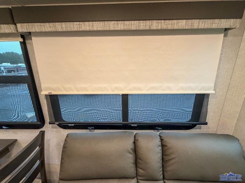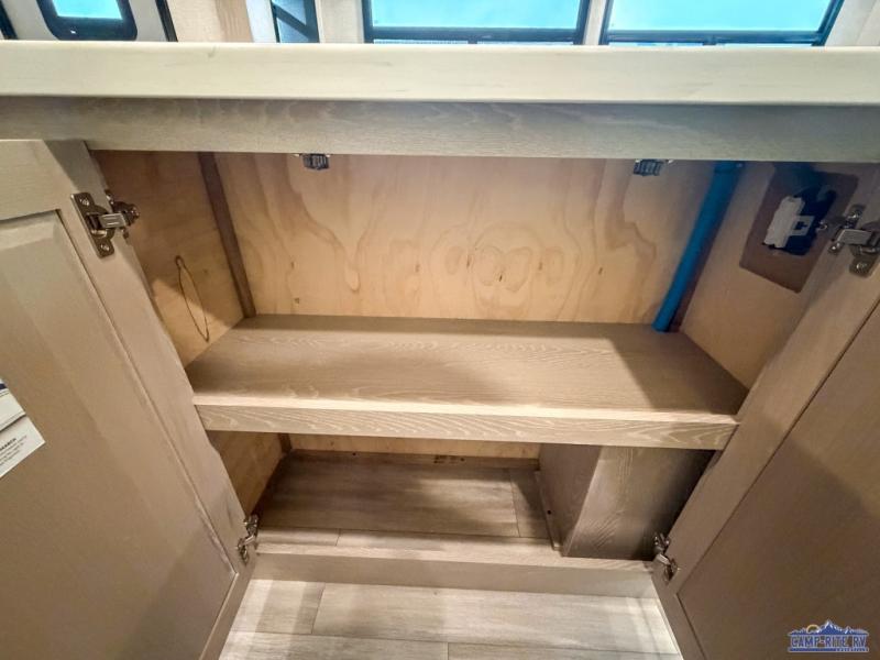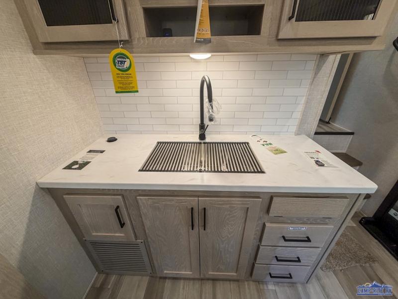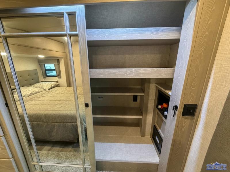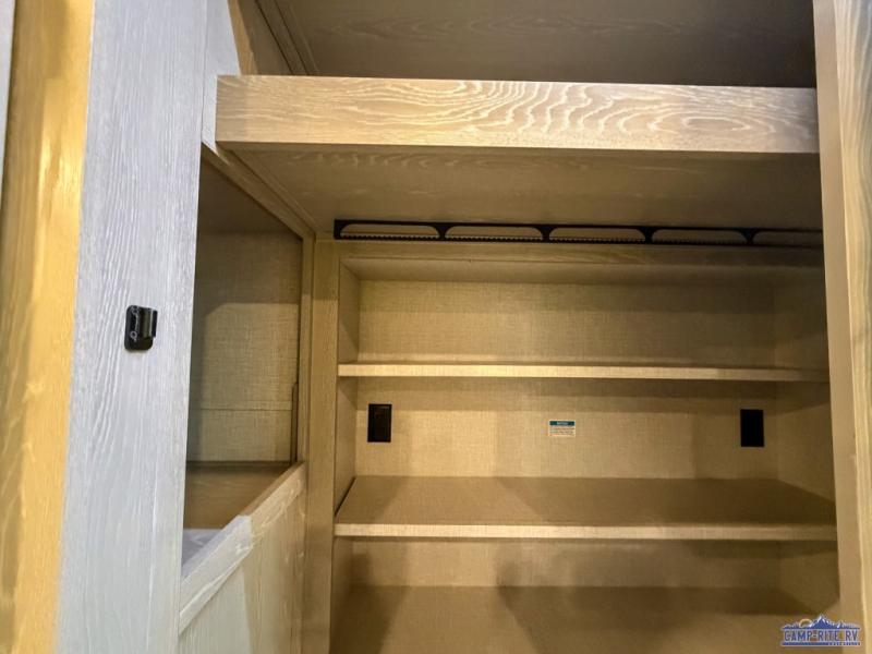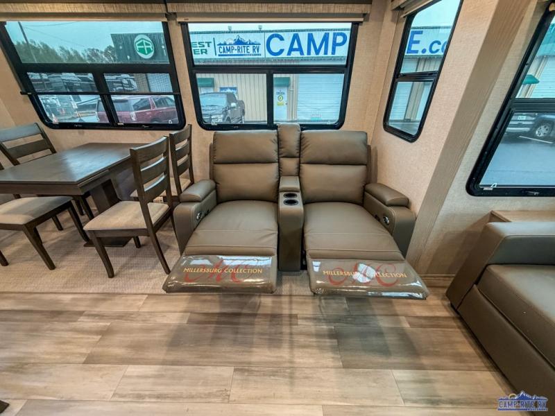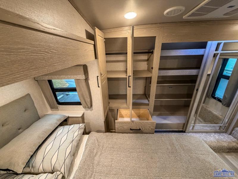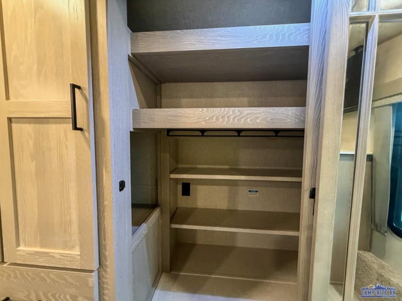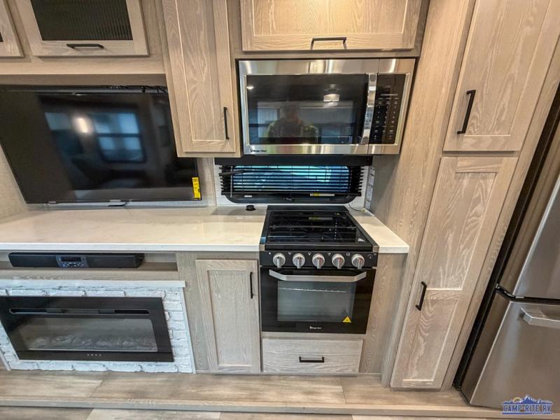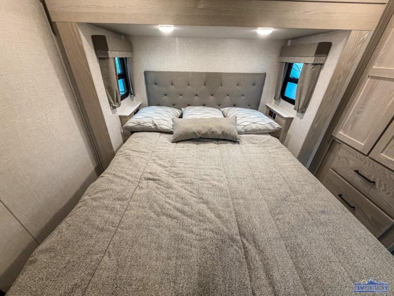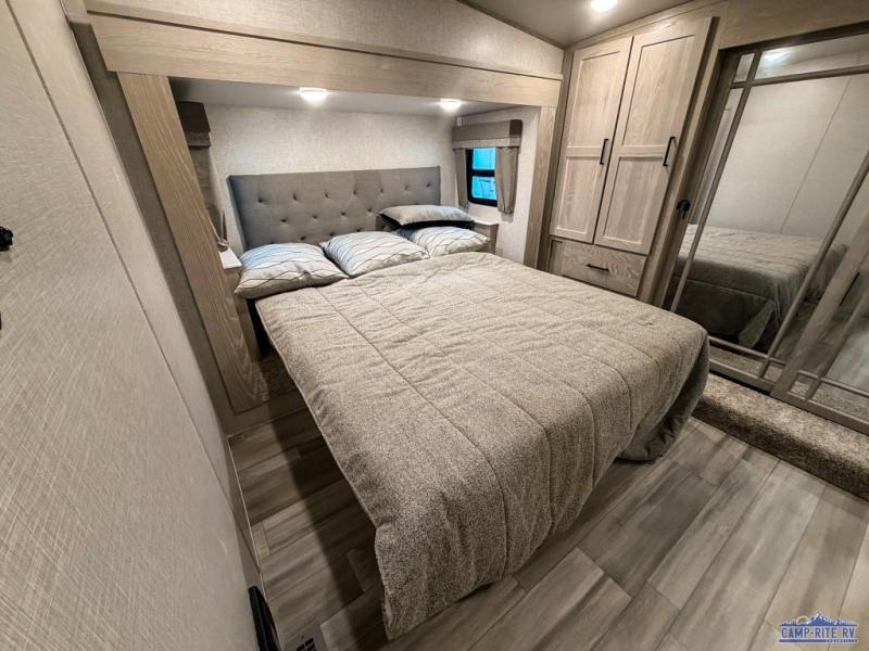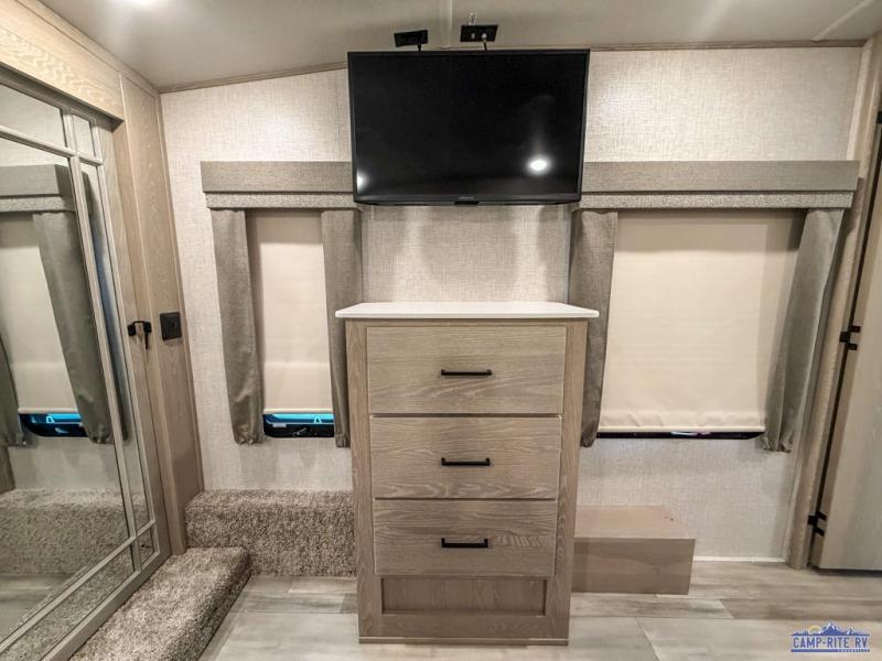 Get ready to enjoy the outdoors while inside with the enormous windows in both the rear, and the door side slide of this fifth wheel. The spacious main living area offers dual opposing slides giving you a great place to invite other RVers over to visit, eat and even play cards. There is seating for nine from the booth dinette, the theater seats and the rear hide-a-bed sofa. The cook will have a residential refrigerator to store lots of drinks and cold food, plus a pantry, and the center island offers extra counter space plus seating. After everyone has left, retire to the front bedroom with a queen bed slide, a shirt closet, a wardrobe with washer/dryer prep, plus more storage and a TV option. You might even like to choose a king bed option.