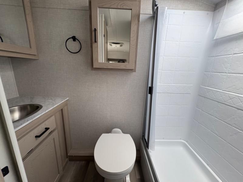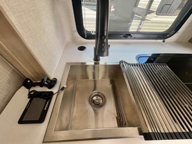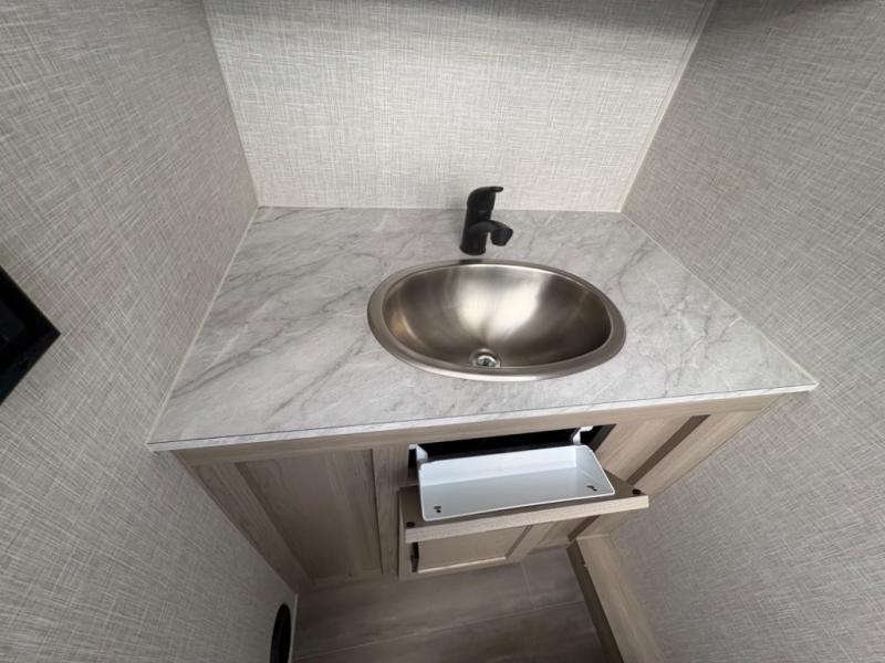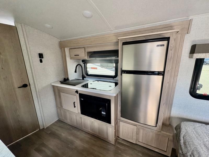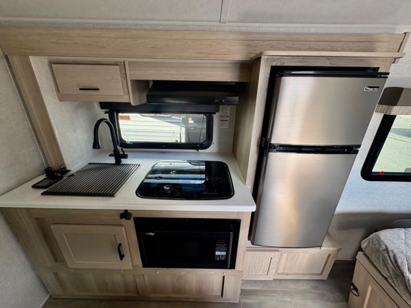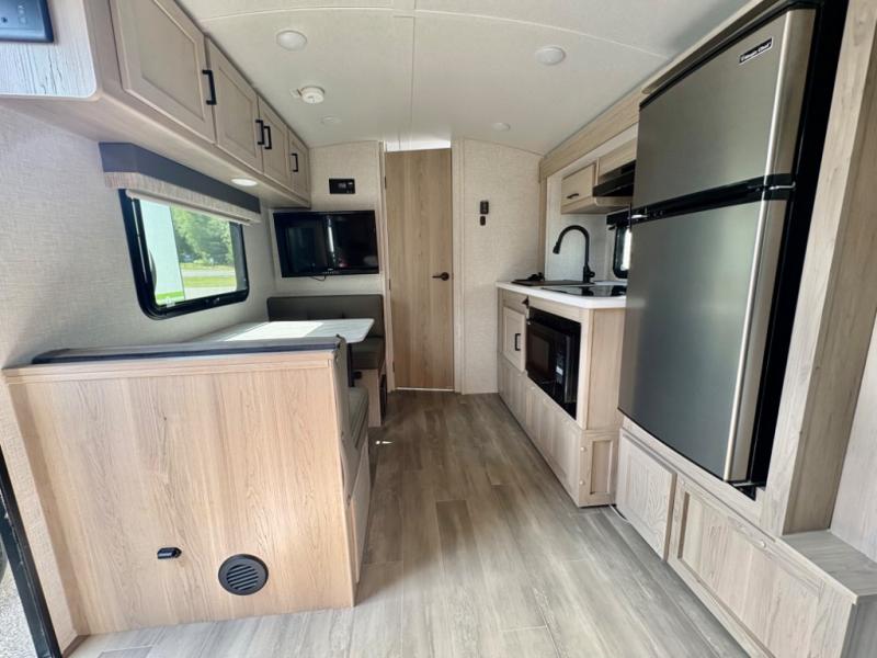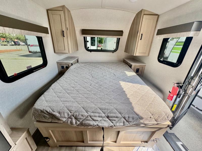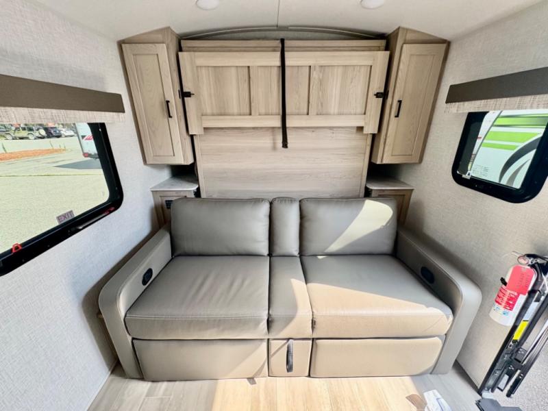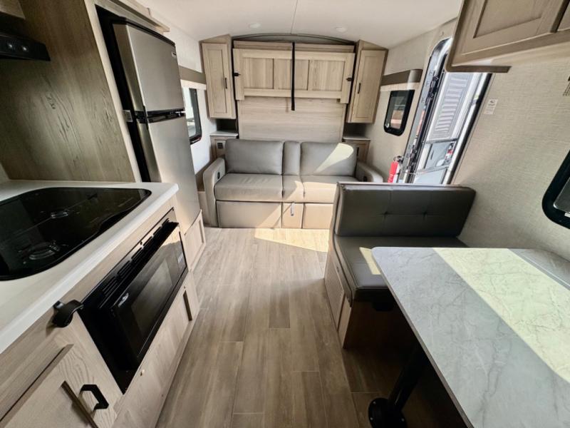 Camp with your favorite person in this trailer with the versatile Murphy bed/sofa combo up front giving you both a living area and a bedroom when you so choose. If you need sleeping space for one more, the dinette will provide that once easily setup. The large window gives you great views while dining or playing games, and the front windshield gives you more views. There is extra floor space in this trailer with the kitchen slide out that offers full amenities plus a sink to keep everything clean. And the full-length rear bathroom offers a spacious area to change your clothes in privacy and get cleaned up in the large shower.