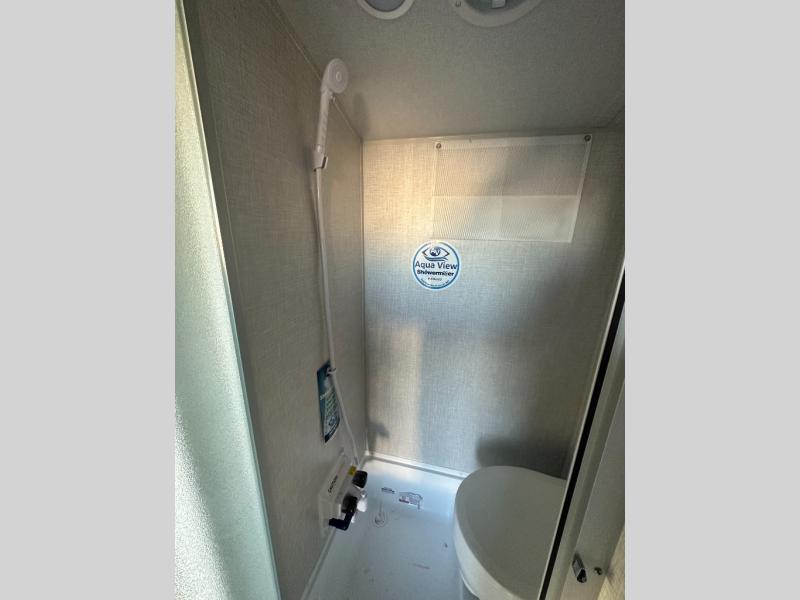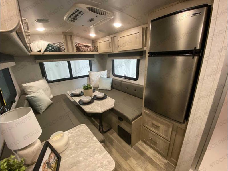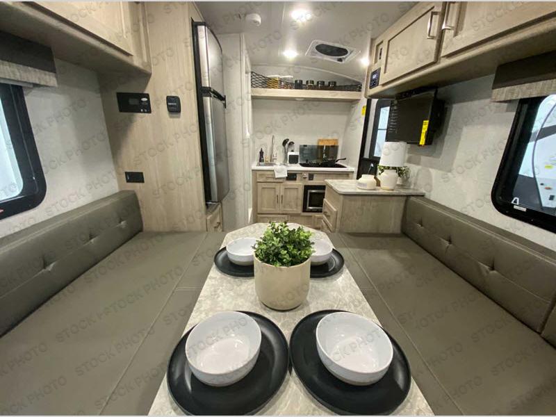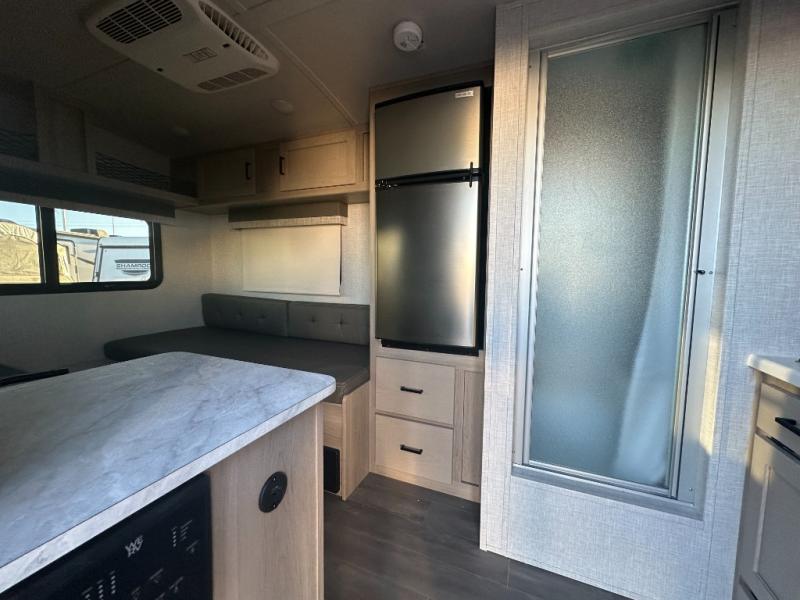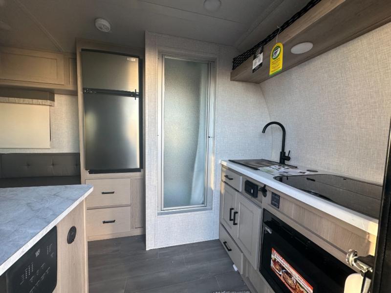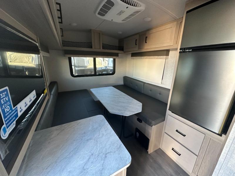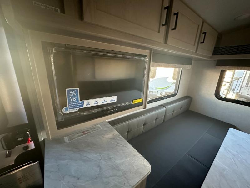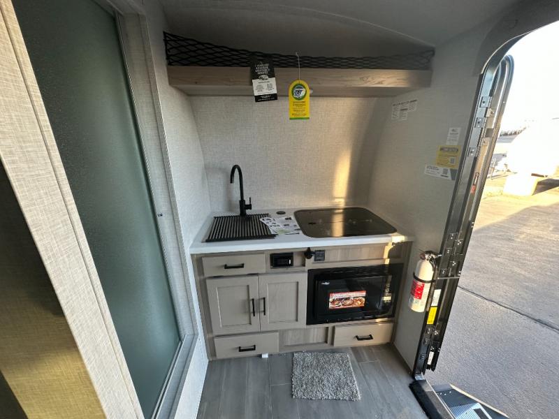 It's time to hit the road in this small, yet walkable travel trailer that is versatile to your needs and offers everything you will want to stay comfortable at a campground or off-grid. You can make meals using the cooktop and microwave up front and store your cold items in the 12V refrigerator. Take turns getting cleaned up in the wet bath so you can skip the public facilities, and store your clothing in the overhead cabinets. You can watch the 32" TV while dining or sleeping on the twin beds that offer a table top to help you convert this area into a king bed. And the 10' power awning will give you a place to hang out while you use the outdoor griddle.