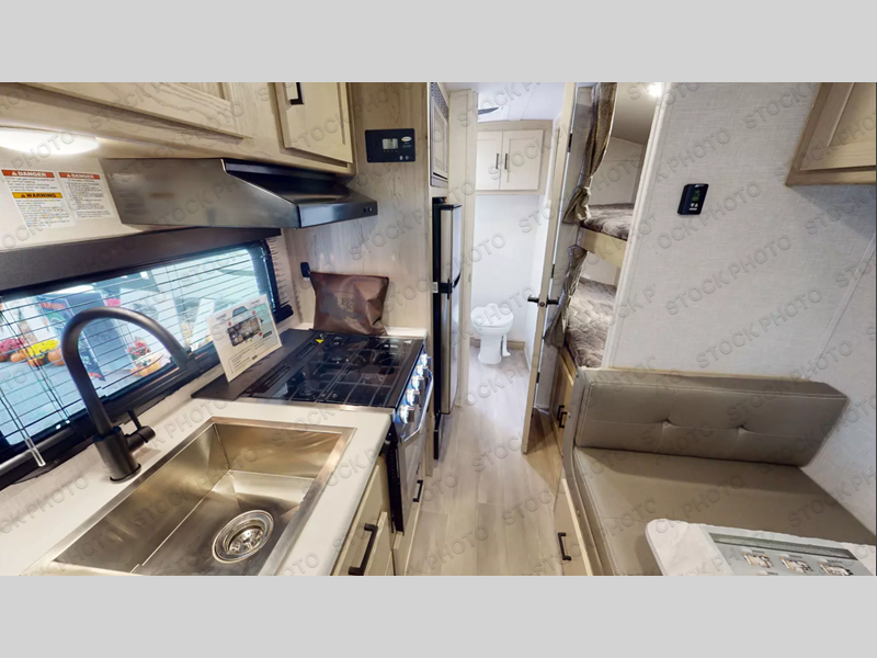 Enjoy moving from campgrounds to campgrounds easily in this trailer thanks to not having a slide out, you can hitch up and go when you are ready. Just don't forget to push the button to the 14' power awning. Your kids or friends will enjoy having their own bunk bed to sleep on while you have a full bed up front, and the 32" dinette sleeps one more. Convenience is appreciated in the rear toilet and shower/bath giving you a place to change in privacy and get cleaned up. The bike door allows you to store bicycles or totes easily inside for traveling, and the exterior storage compartments give you extra space for outdoor gear, camping chairs and such.