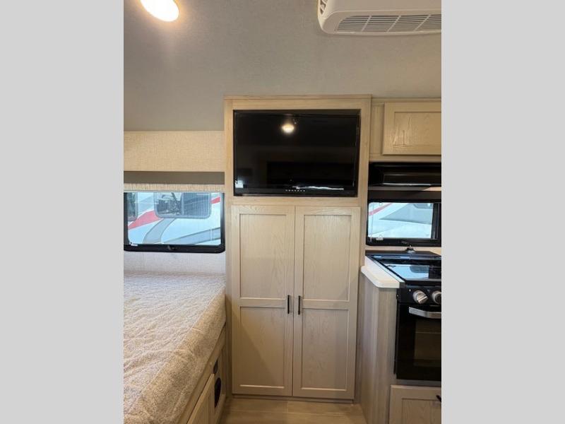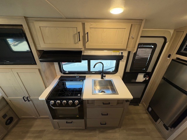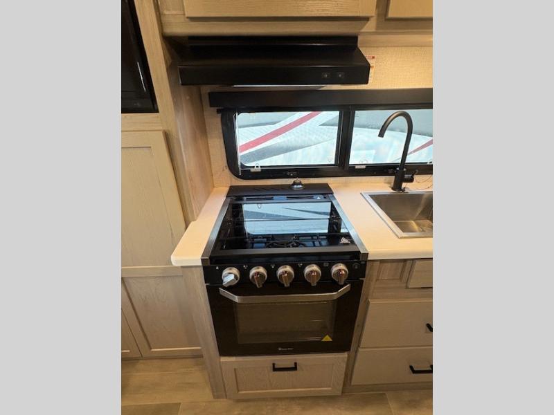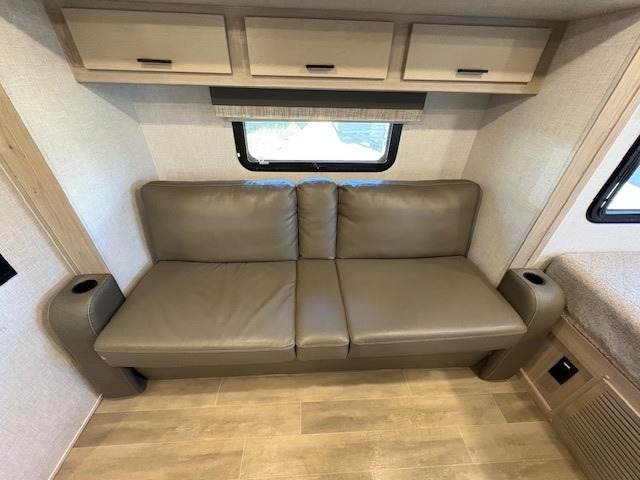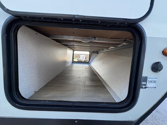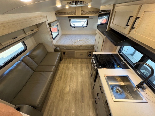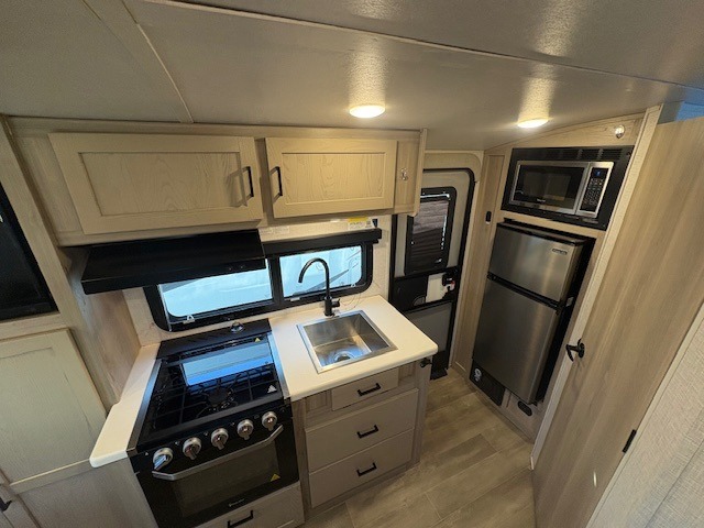 This can be the perfect couples trailer for you or your own RV with more floor space to move around thanks to the slide out sofa with a table which offers sleeping space for friends. You will have a queen bed to lay your head up front, and everyone can watch the 32" TV. The wardrobe and overhead cabinets give you clothing storage, and the kitchen cooktop and microwave allow the cook to make warm meals. And the 12V refrigerator is conveniently next to the entry so you can grab a drink on your way out to relax under the 11' power awning.