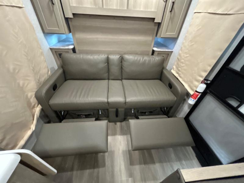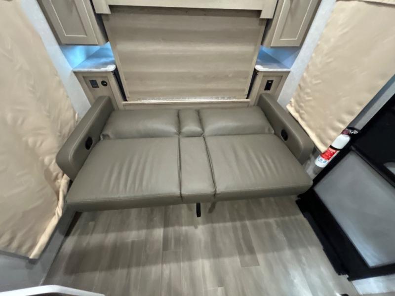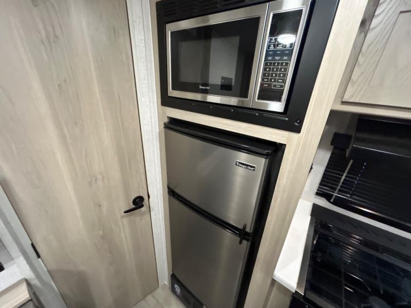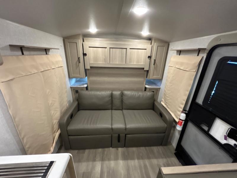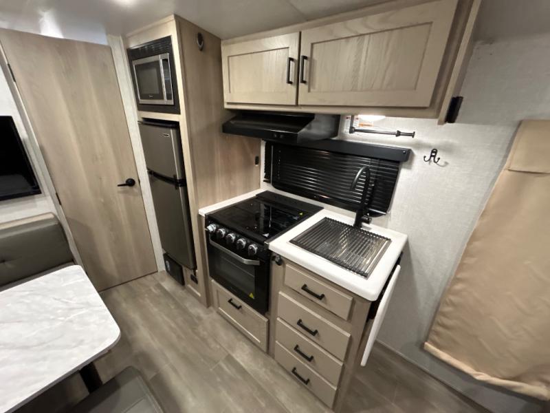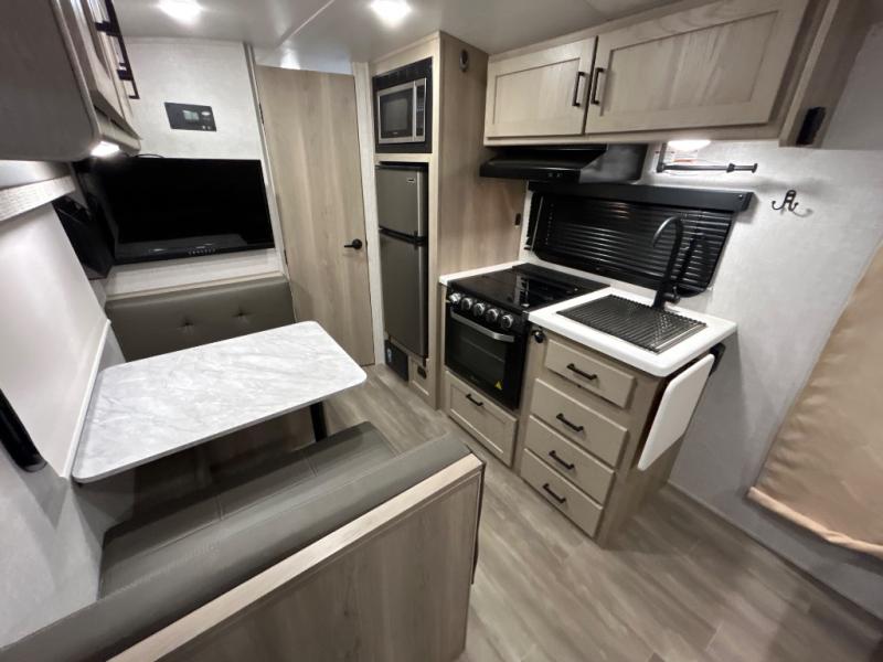 Whether you enjoy staying at the campground for a weekend or longer and/or you enjoy off-grid camping, this 20'2" long trailer gives you lots of interior space and versatility to enjoy each and every trip. From the Murphy bed/sofa combo up front offering sleeping space and seating depending on which you prefer at the time, to the full rear bathroom which also offers linen storage, you will have everything you need. And the kitchen cooktop, microwave and 12V refrigerator allow you to make meals and store leftovers. Two can dine at the booth dinette or you can eat outdoors under the 14' power awning.