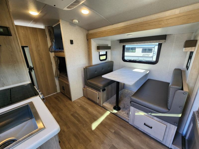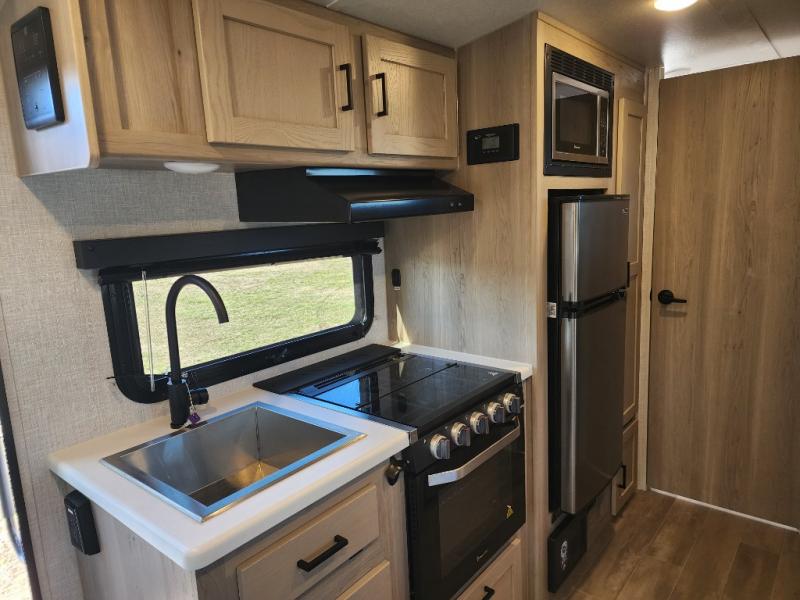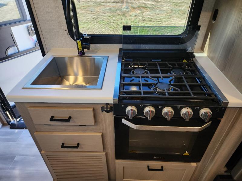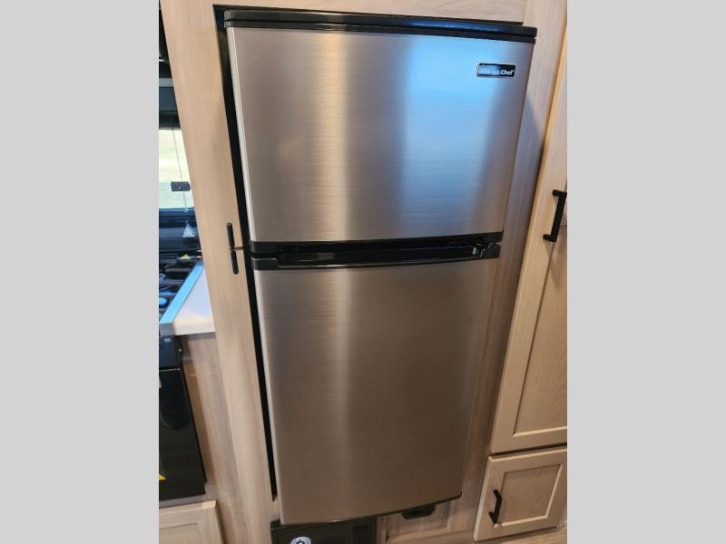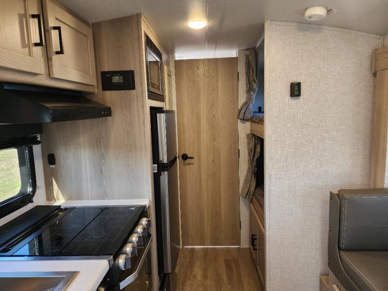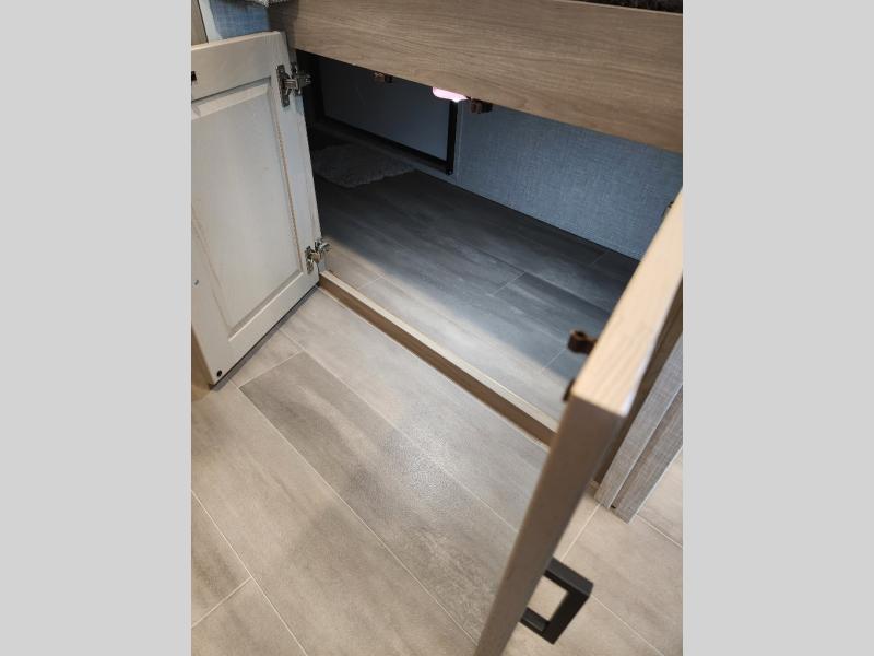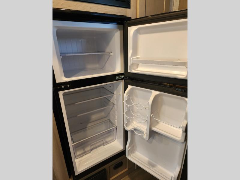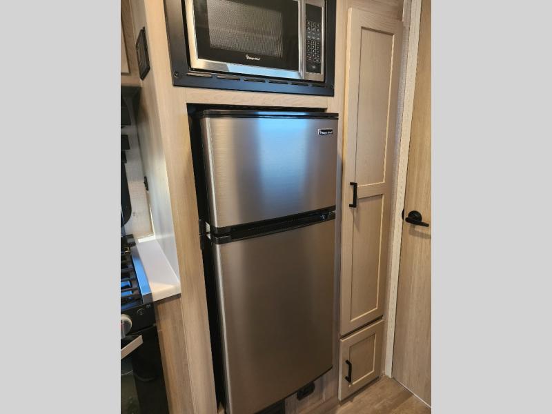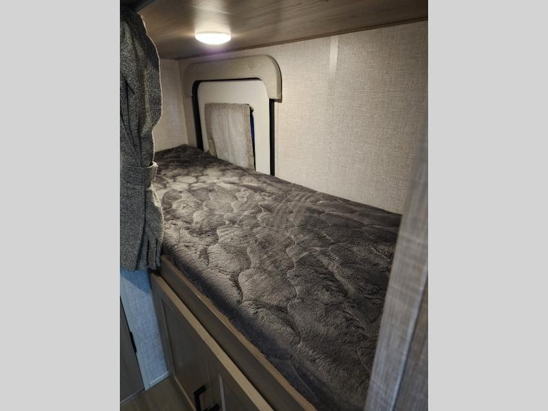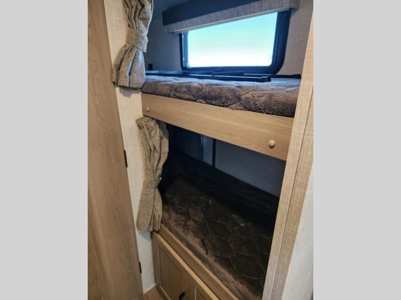 The largest bunk trailer in the E-Pro lineup will work perfectly for a family or friend group that enjoys their own sleeping space, plus more floor space with the dinette slide out that can sleep one to two. The bottom bunk even flips up so you can stow away your bikes, totes and such through the bike door for secure travels. There is exterior storage for more outdoor gear, and interior storage found throughout. The cook will love having a pantry and overhead cabinets for snacks, canned goods, dishes and more. After making a warm meal, the 12V refrigerator can hold the leftovers. The private toilet and shower/tub room gives you privacy and a place to get cleaned up after a fun day outdoors.