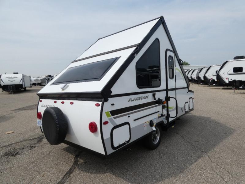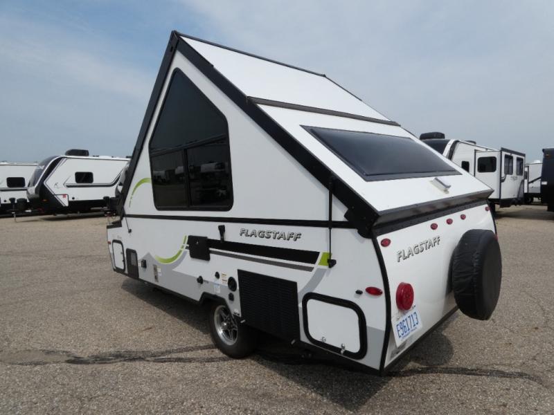 Don't miss out on your chance to own the perfect blend of tent camper and trailer! The Forest River Flagstaff Hard Side A-frame allows you to effortlessly tow and store, yet it also provides you with the sturdiness of a solid exterior. The durable diamond plate front adds protection for traveling down terrain that is less than smooth, and the four stabilizer jacks with sand pads will hold your unit in place once you are all set up. You will also find electric brakes, 13" radial tires, an installed door step, and a fiberglass laminated roof. There is a spare tire with carrier and cover for those unforeseen circumstances, and each unit comes ready for cable TV and a Wi-Fi booster with LTE.
