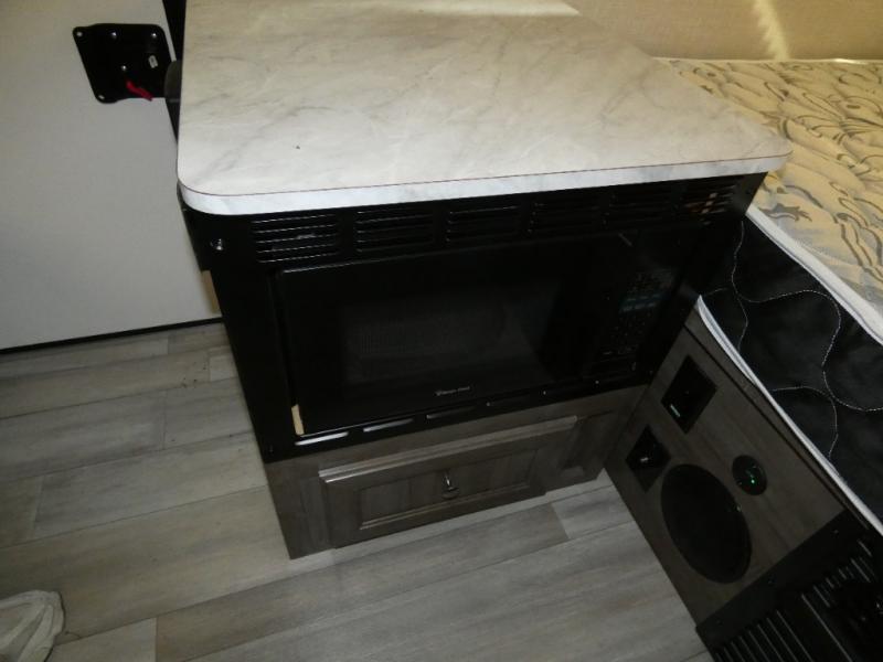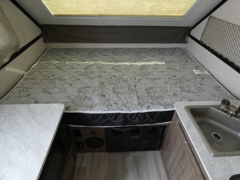 What a treat it will be to spend a weekend in this Flagstaff Hard Side A-frame! You will be able to create some more interior living space by repositioning the flip-up bed after you wake up, and the booth dinette can also maneuver out of a bed and back into a dining space easily. There is a three-burner range with cover that can be used to fry up a hearty batch of pancakes without even starting a fire, and if you prefer some instant oatmeal, just use the microwave. Another place you can make food is outside at the exterior griddle which is perfect for cooking those foods with strong odors that would linger on the interior. The Create-A-Breeze roof vent fan is helpful for keeping fresh air circulating throughout the interior, and the stereo with exterior speakers can be fun for all.