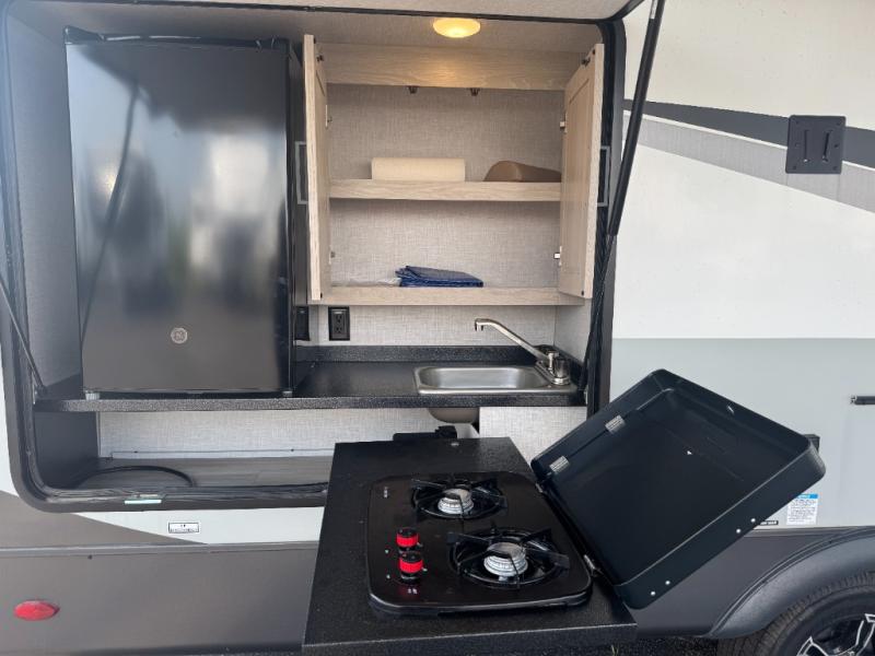 Outdoor Kitchen and Griddle: Keep your campsite active with an exterior kitchen setup that includes a mini fridge and a propane griddle, perfect for burgers, pancakes, or late-night snacks under the stars.