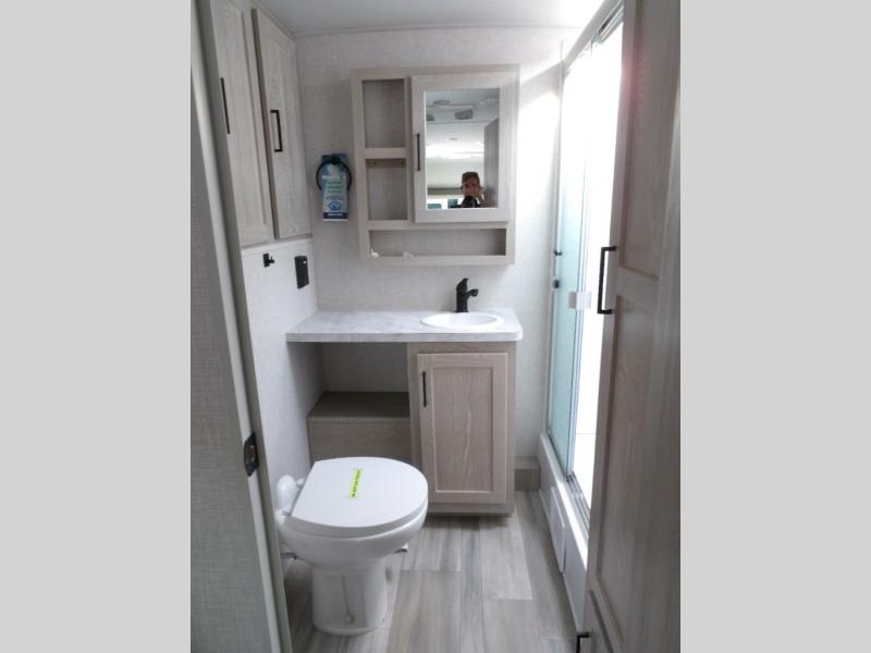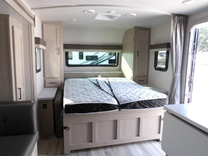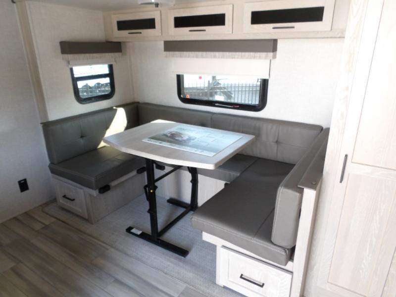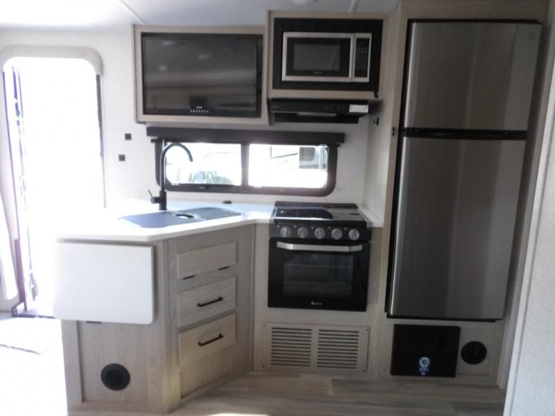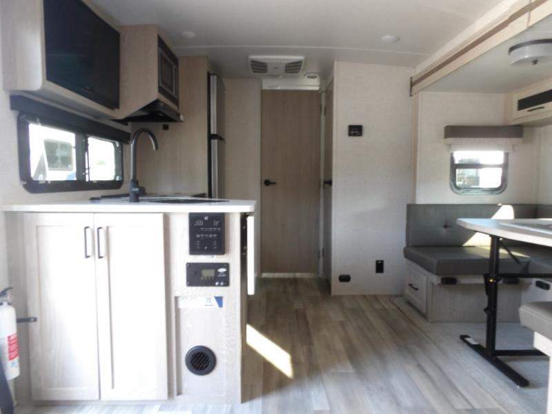 Each Flagstaff Micro Lite travel trailer by Forest River features laminated fiberglass sidewalls, sleek tinted frameless windows, and Azdel composite panels for added strength and support. You can easily tow these travel trailers with an SUV since they are so lightweight, and there is a power tongue jack for quick and easy set up. Some of the convenient amenities you will enjoy are the Teton All-In-One WiFi booster/LTE prep and antenna, the double battery boxes, Key-Alike locks, plus a Maxxair fan with a cover to keep the fresh air moving in your RV. You will love the modern look of the Newport Ash or Autumn Wood cabinetry, plus there are solid wood cabinet doors, solid surface kitchen countertops, and a Showermiser water saving system in the bathroom. Choose a Flagstaff Micro Lite travel trailer and you won't be disappointed!