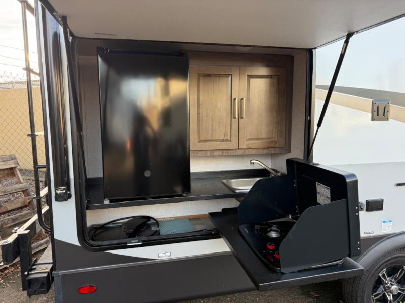 Are you ready to camp at your leisure? If so, then this Flagstaff Micro Lite travel trailer is ideal for you! There is sleeping space for four people in this unit, so you can camp with your kids or even an overnight guest or two. The single slide opens up the floor space so that you won't feel cramped. You'll enjoy a sofa in this model that conveniently converts into a Murphy bed for a good night's rest. This trailer features a kitchen with a three-burner cooktop, a countertop extension, and a double sink which makes clean-up a breeze. Enjoy the evening air when you cook outdoors using the outside kitchen that includes a two-burner cooktop, a sink, and a refrigerator.