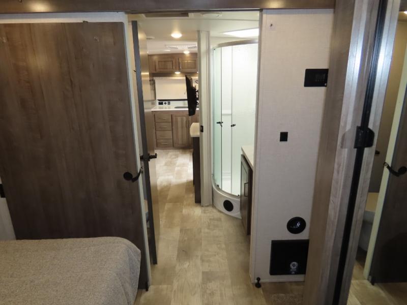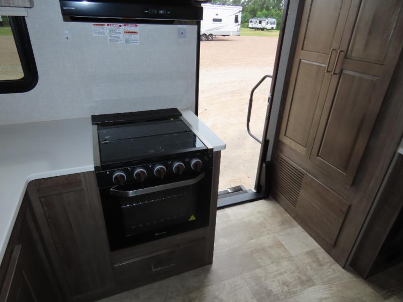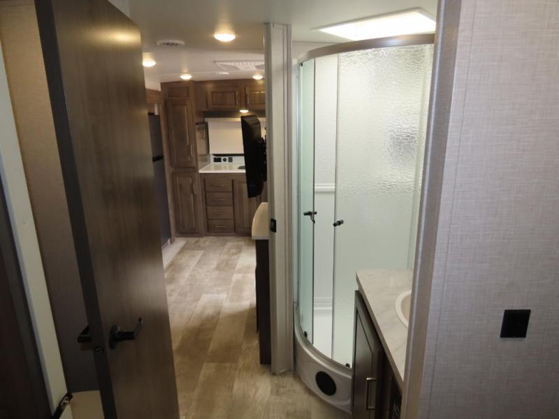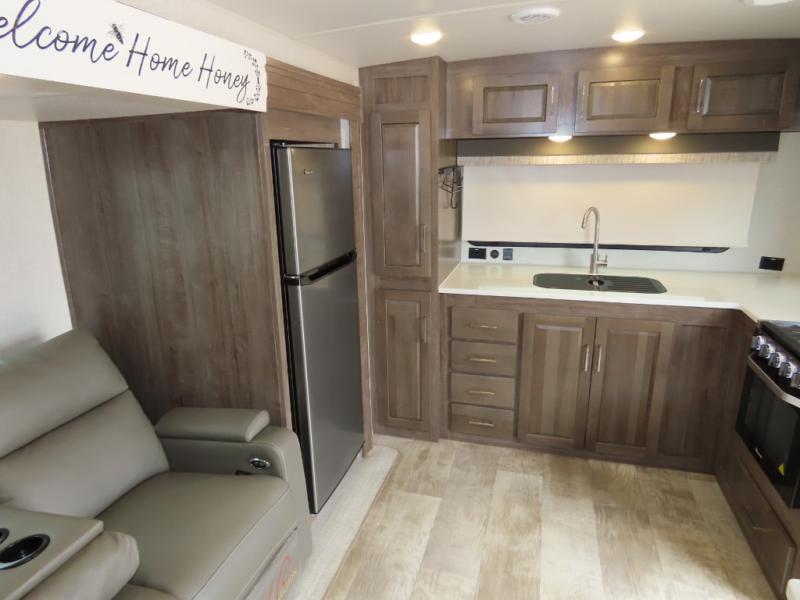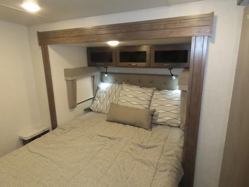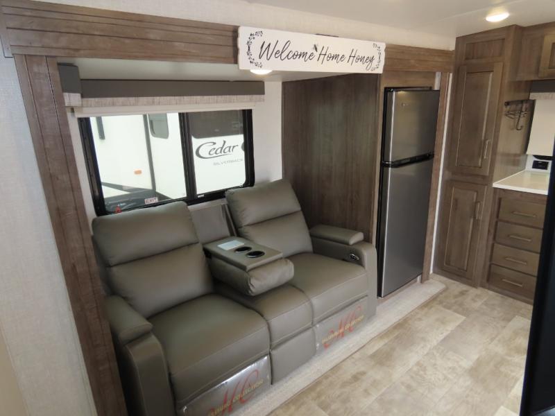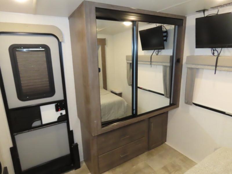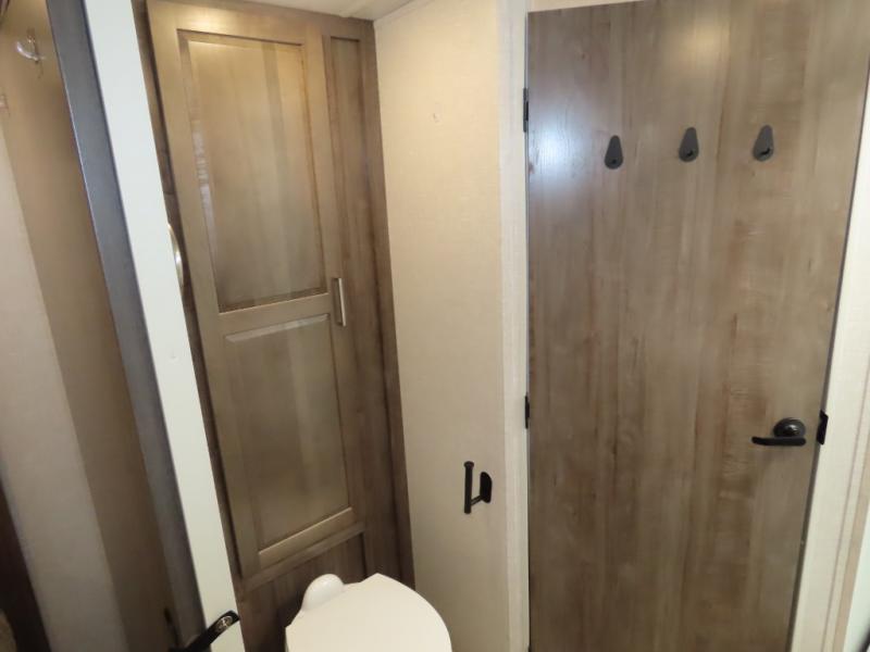 With a queen bed slide and a large wardrobe in the private bedroom, you will have all that you need for sleeping and storing your belongings. Plus, the second exterior entry door leads right into the bedroom so that you can escape for an early morning run without running through the entire trailer to get outside. The front kitchen is open and accommodating with its helpful tools, and the 67" theater seat is right next to the double-door refrigerator on the slide out. Right next to the front entry door is a coat closet so that you can keep your jackets readily available, and there is also a linen closet in the walk-through bath so that you can keep your towels ready for your shower.