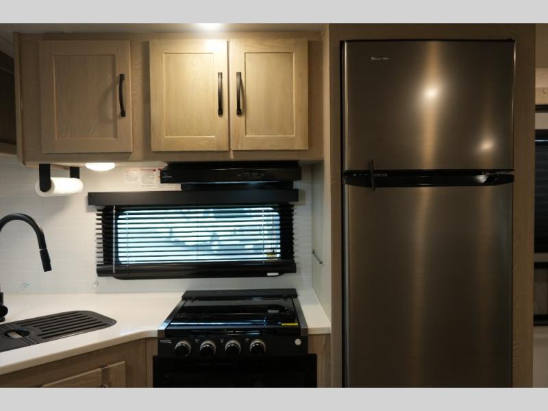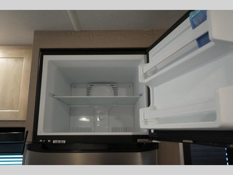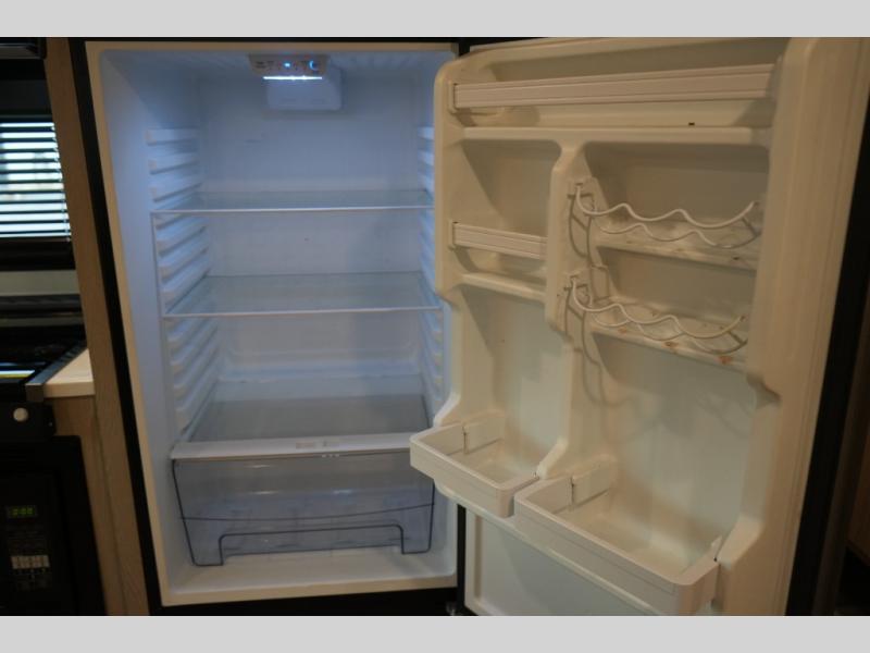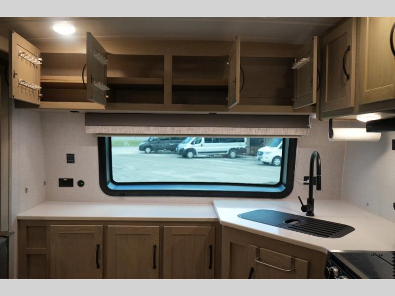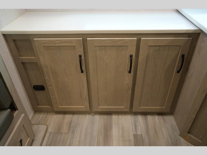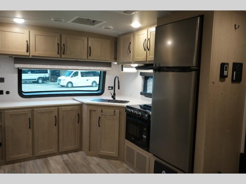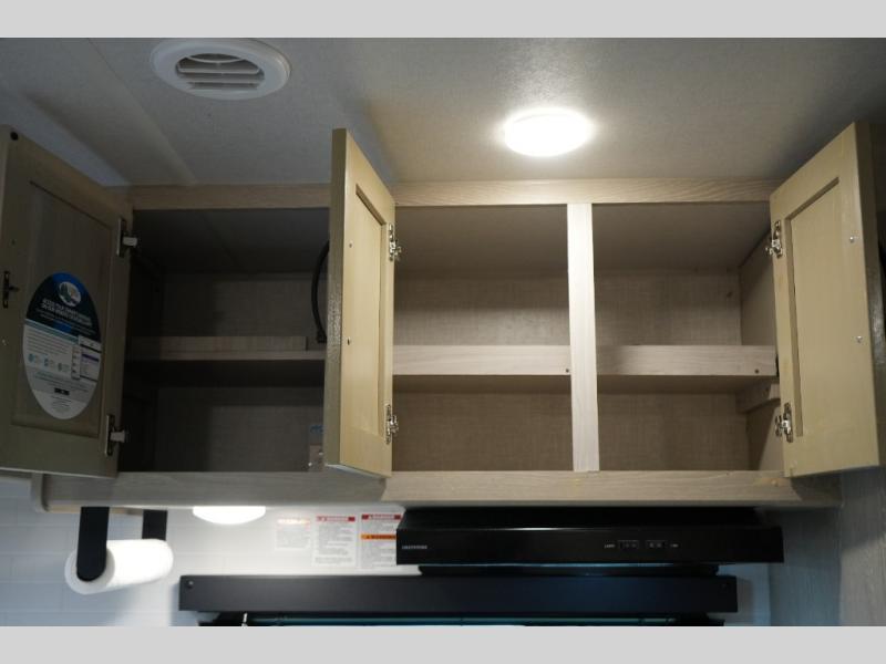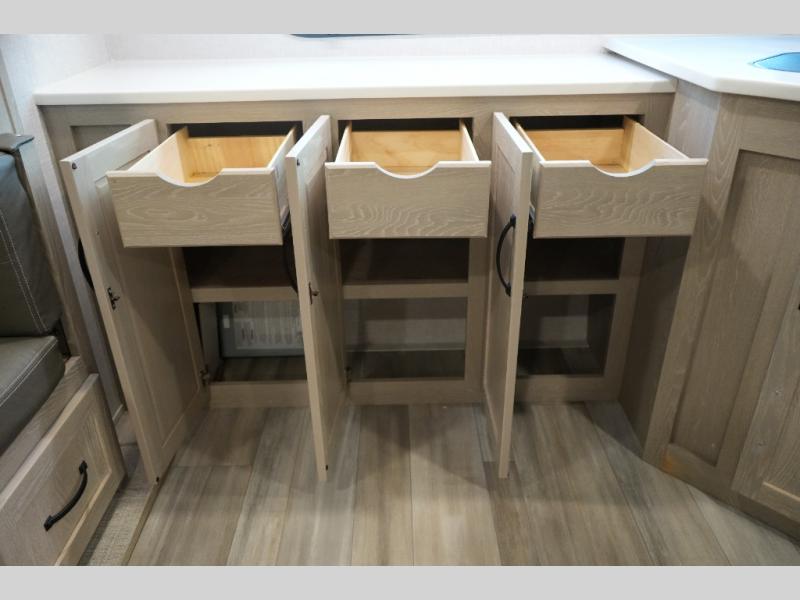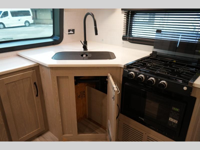 Enjoy ample counter space, upper and lower cabinetry, and full kitchen appliances – perfect for preparing home-cooked meals on the road. -