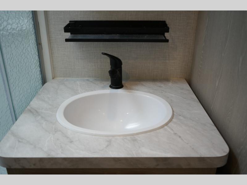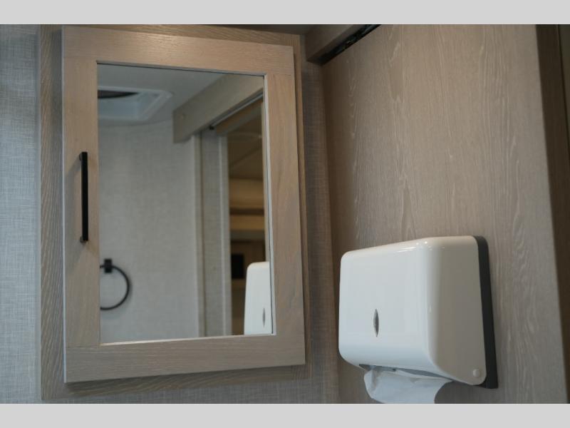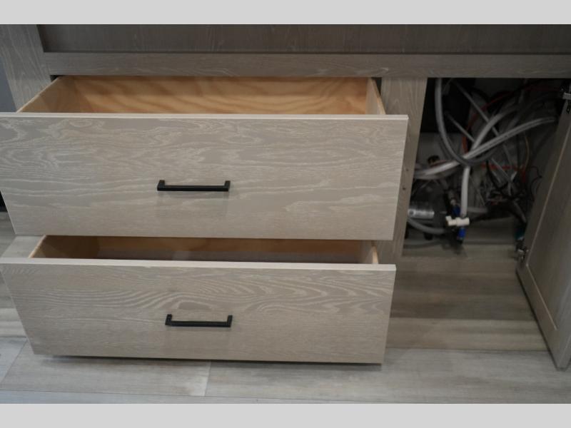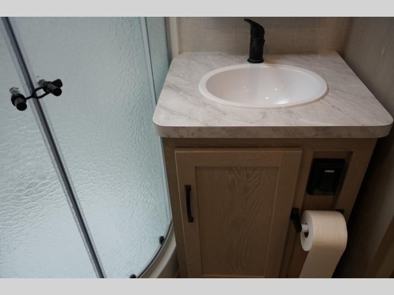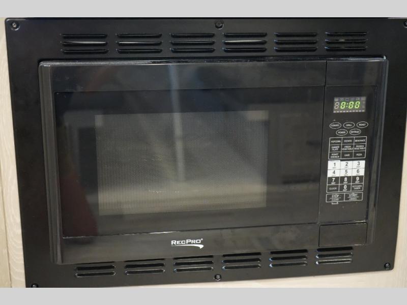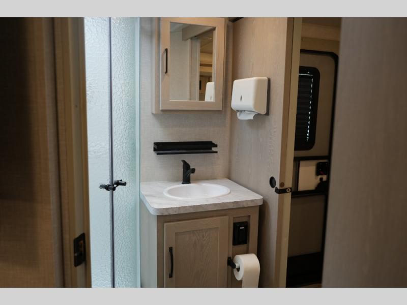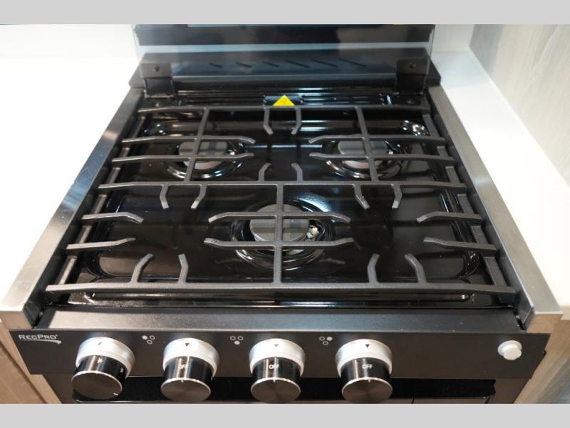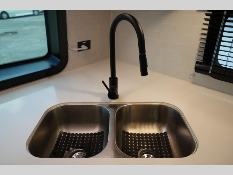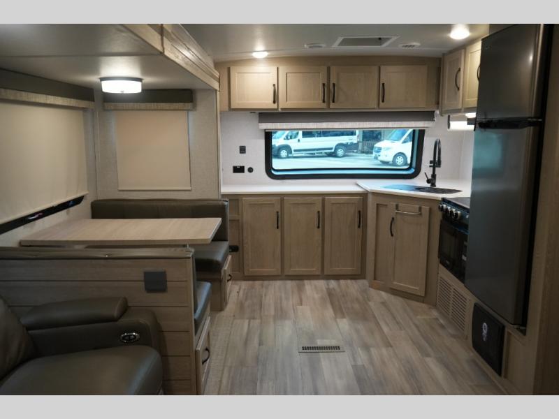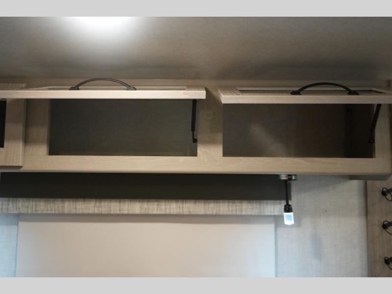 Enjoy ample counter space, upper and lower cabinetry, and full kitchen appliances – perfect for preparing home-cooked meals on the road. -
