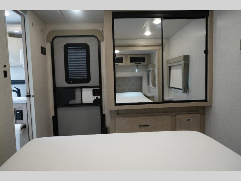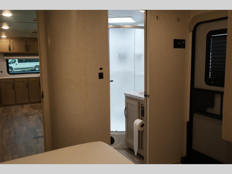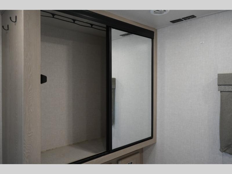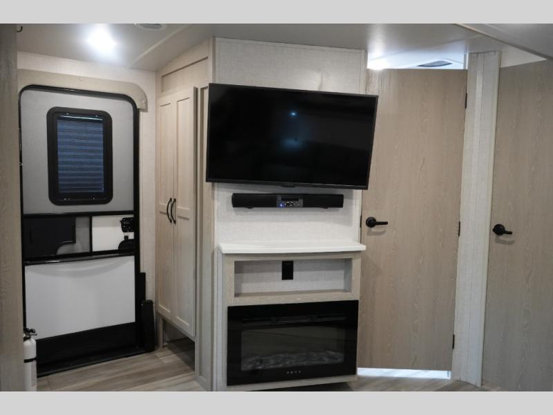 The slide-out queen bed creates a roomy sleeping area, complete with wardrobe storage and an optional TV setup. Direct access to the bathroom and a second exterior door add privacy and convenience. -