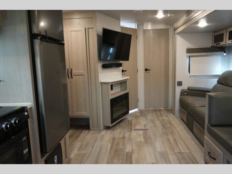 The Flagstaff Super Lite 26FKBS offers a spacious front kitchen, private rear bedroom with dual entry, cozy theater seating, fireplace, and premium construction built for all-season travel. Call Today! 352.787.7744