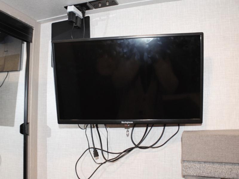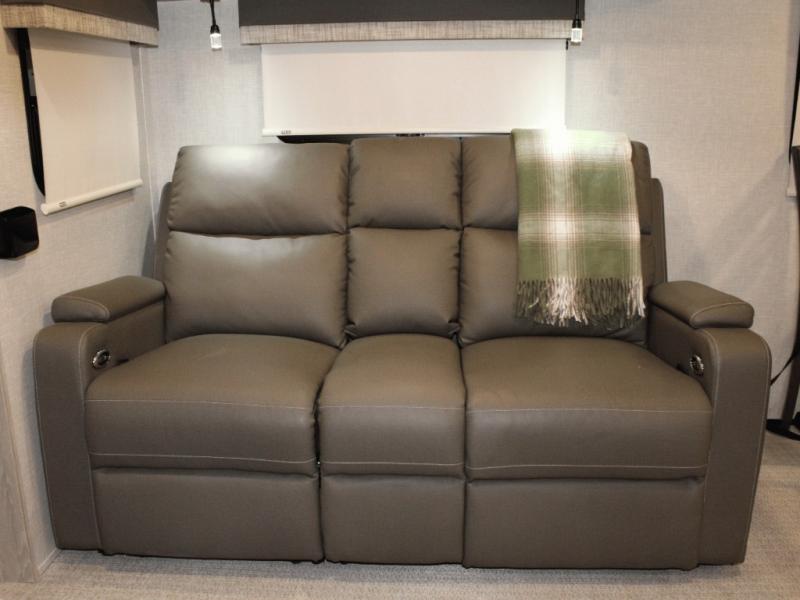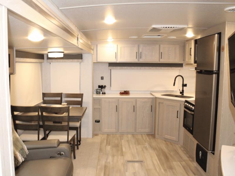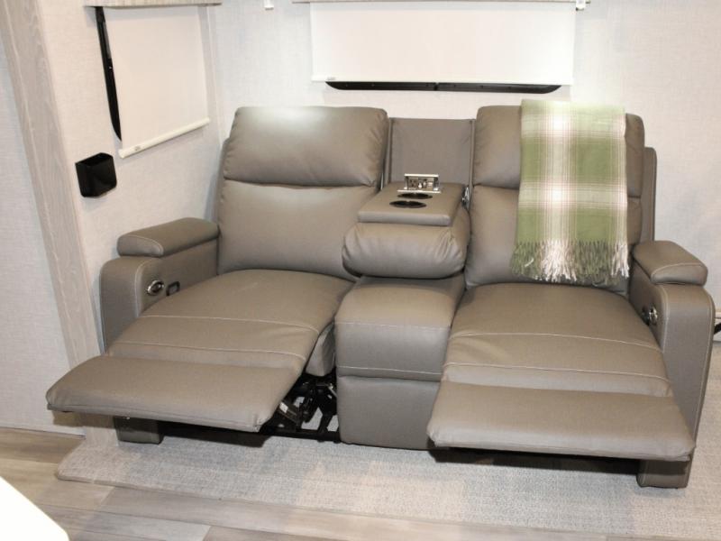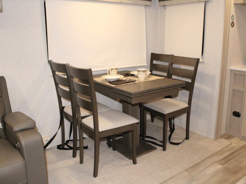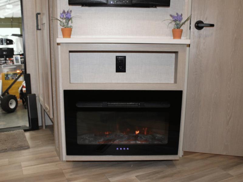 In the living area, unwind on cozy 67-inch theater seating, gather at the booth dinette, and enjoy entertainment on the LED TV paired with a warm, inviting fireplace. This open-concept space creates a relaxing atmosphere perfect for evenings inside or hosting guests.