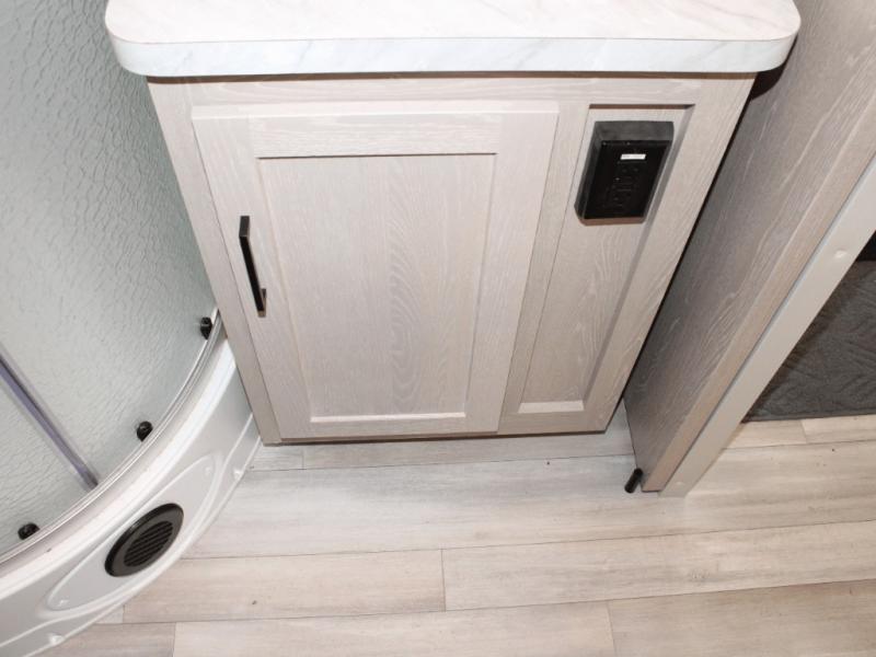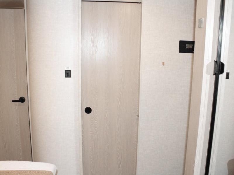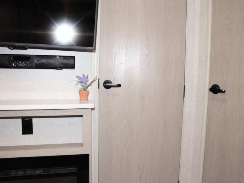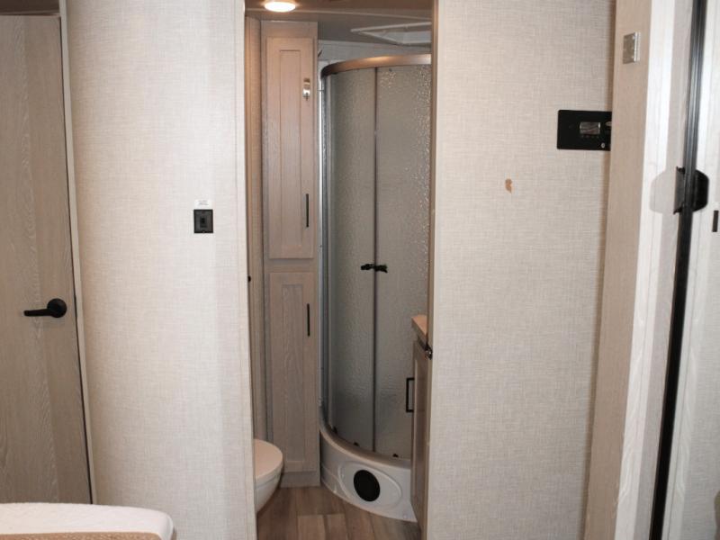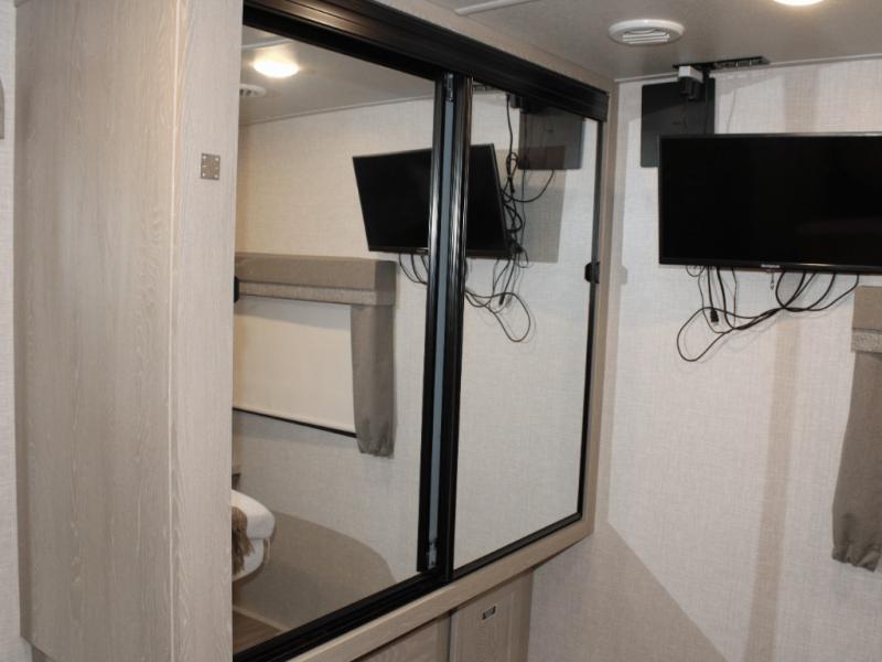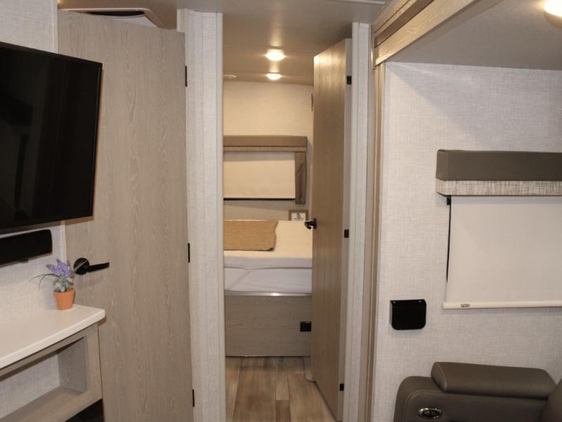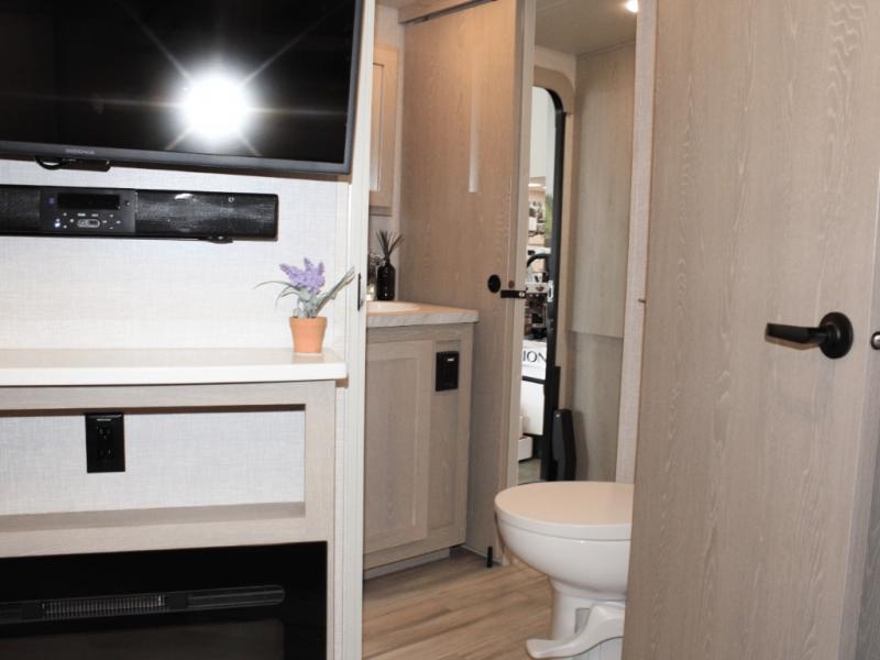 At the heart of this floorplan is a luxurious rear bedroom featuring a second exterior entry door, perfect for quick access and added convenience. Enjoy a peaceful night’s rest on the slide-out queen bed, store essentials in the large wardrobe, and enhance your downtime with an optional bedroom TV. Large windows bring in abundant natural light and connect the space directly to the double-entry bathroom, offering privacy and smooth flow throughout the unit.