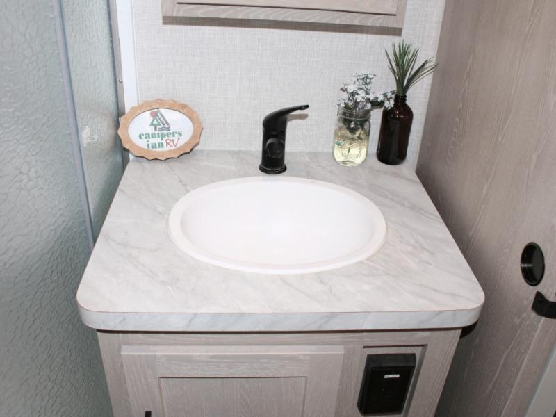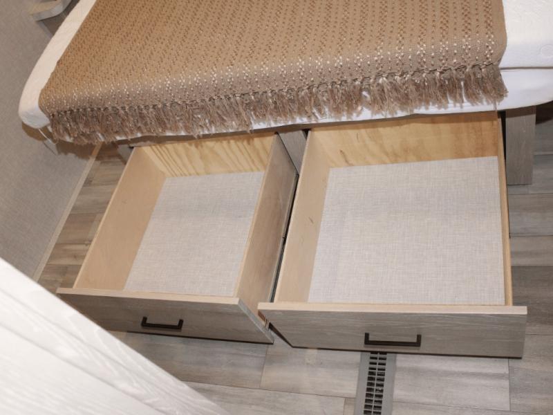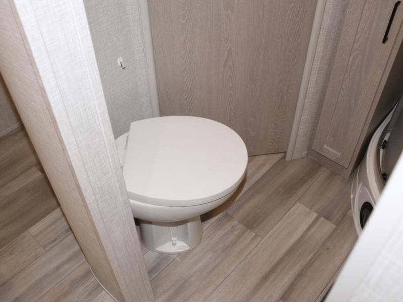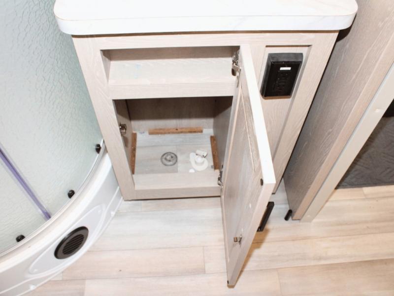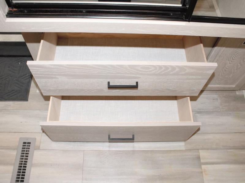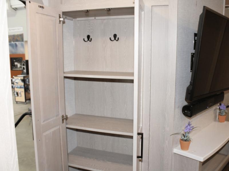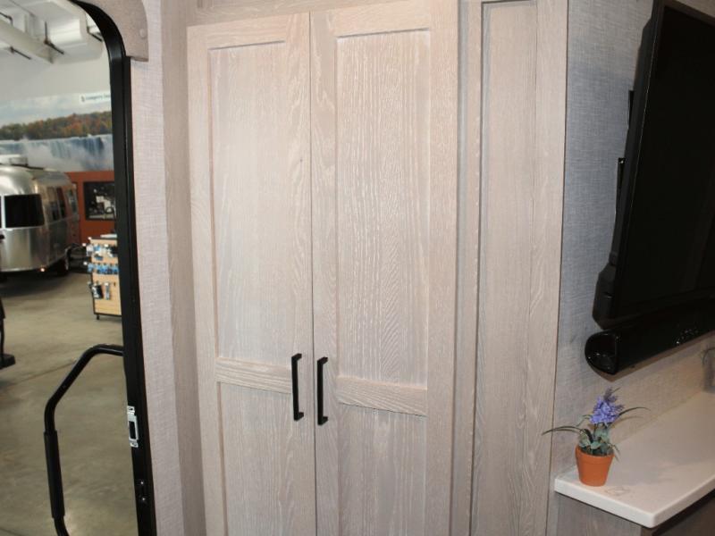 At the heart of this floorplan is a luxurious rear bedroom featuring a second exterior entry door, perfect for quick access and added convenience. Enjoy a peaceful night’s rest on the slide-out queen bed, store essentials in the large wardrobe, and enhance your downtime with an optional bedroom TV. Large windows bring in abundant natural light and connect the space directly to the double-entry bathroom, offering privacy and smooth flow throughout the unit.