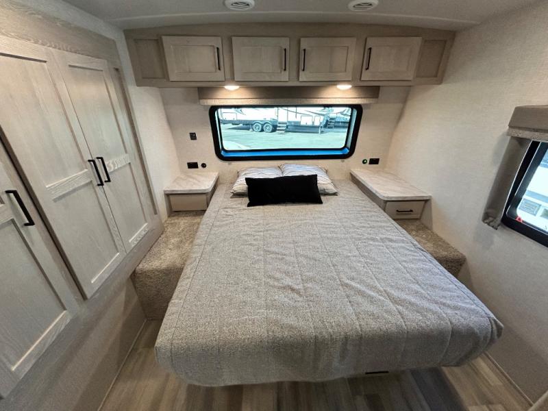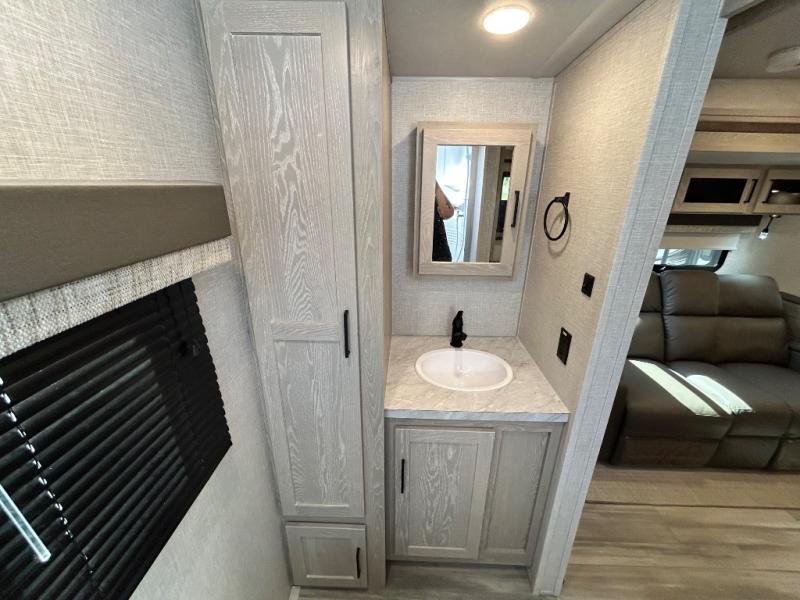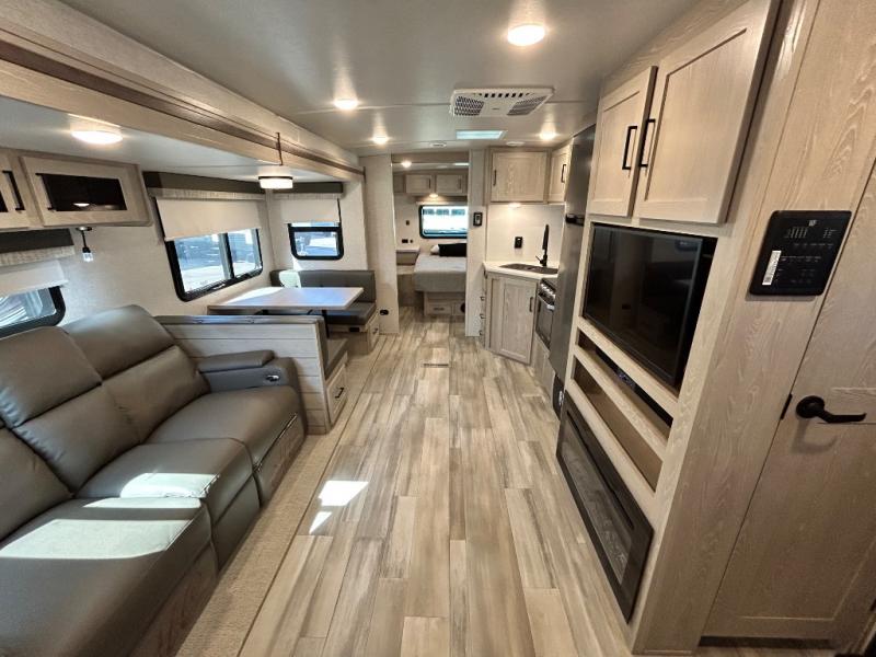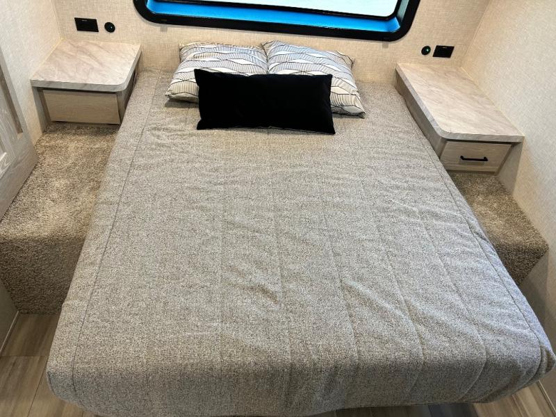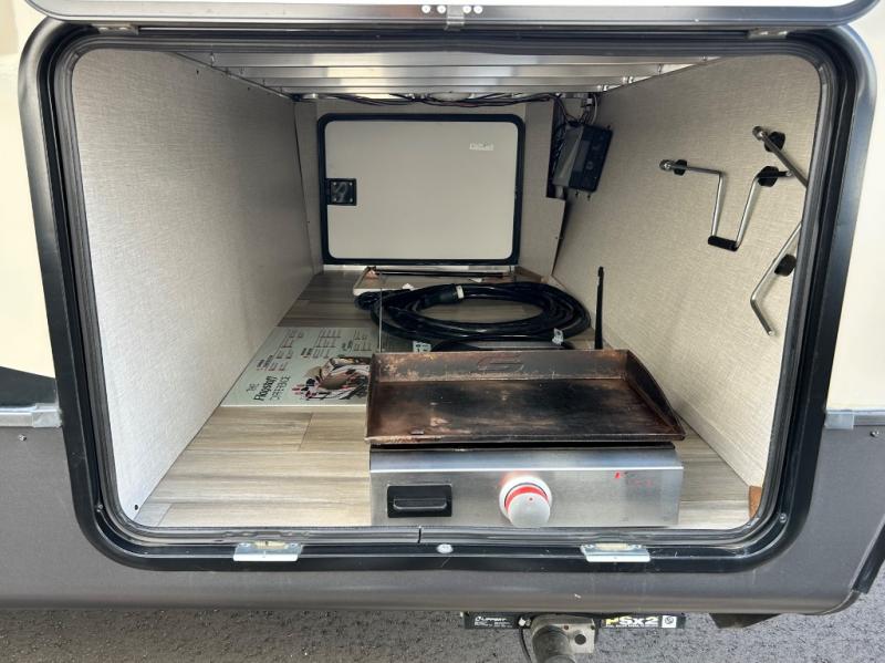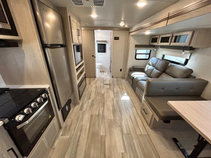 Enjoy inside comforts, and outside conveniences in this trailer. You can relax under the 21' awning which offers an outdoor living area protected from the elements, and a front drop frame pass-through storage allowing you to take camping chairs, tables, fishing poles and such. Enjoy privacy in the rear full bathroom with a space savings sliding door, and a spacious living and kitchen area thanks to the slide out with furniture that also doubles as sleeping space for your kids or guests. The cook will have full amenities to make meals, and when you are ready to sleep, head to the front bedroom with a queen bed and plenty of storage, and a slide out giving you more floor and storage space.