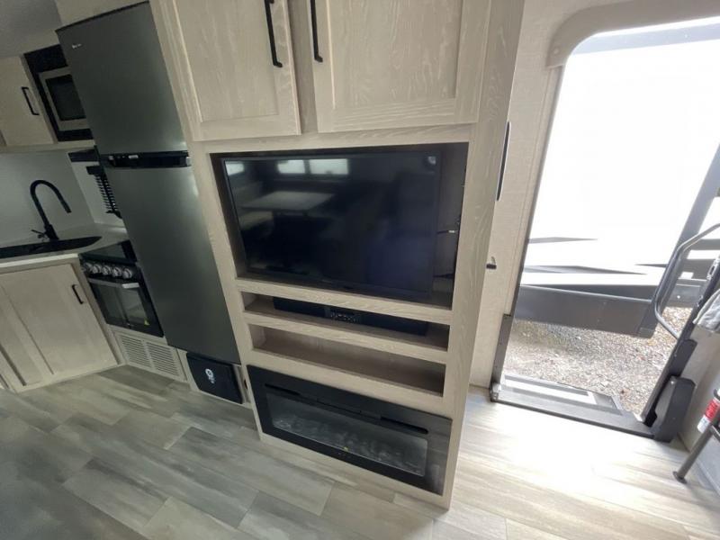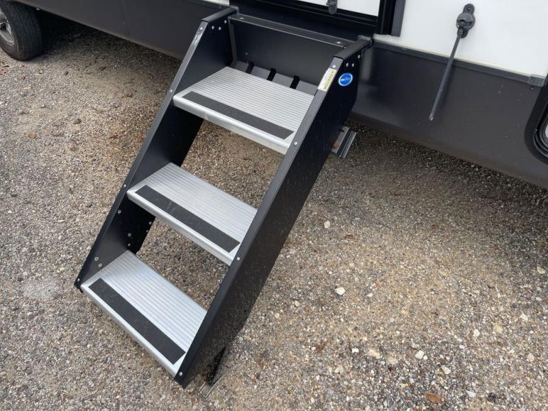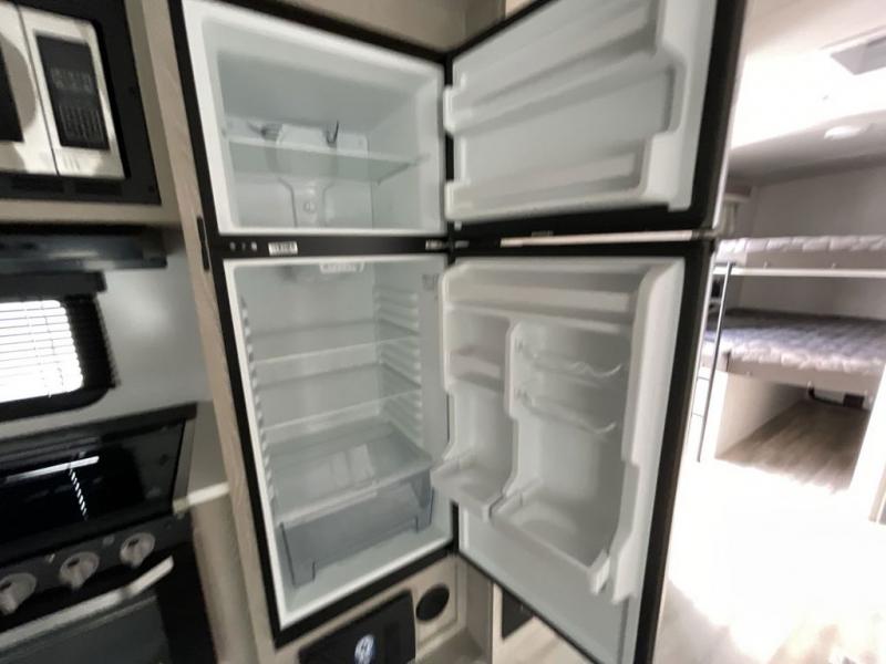 Get ready for a fun camping experience with your family and friends in this trailer that sleeps nine! From the rear double size bunks to the front bedroom's queen bed, and the furniture in the spacious main living area, everyone will find a place to lay their head at night. The cook will have full amenities inside and the choice to make meals on the outside kitchen when feeding everyone, and storage is abundant for your snacks and dry ingredients in the walk-in pantry, your cold items in the double door refrigerator, and throughout the interior and along the exterior. You can load the larger gear in the front drop frame pass-through storage, and other outdoor items in the rear or side storage compartments.