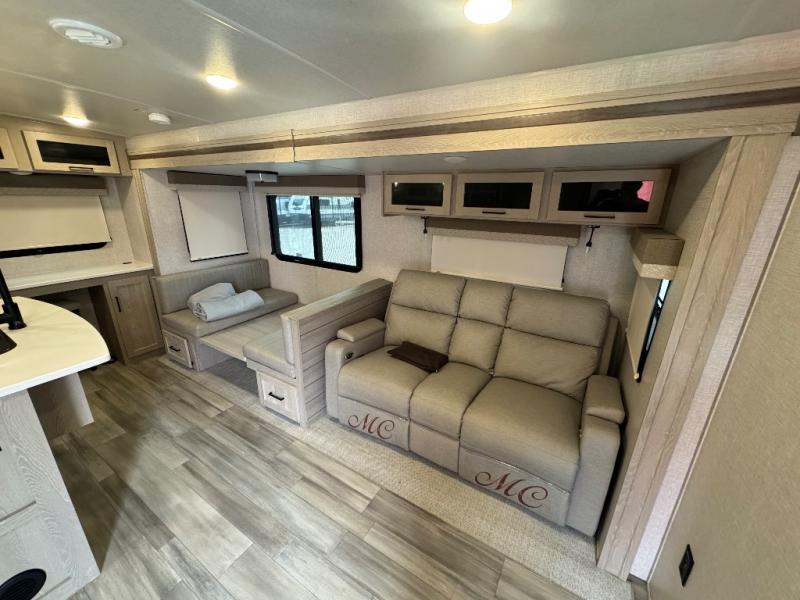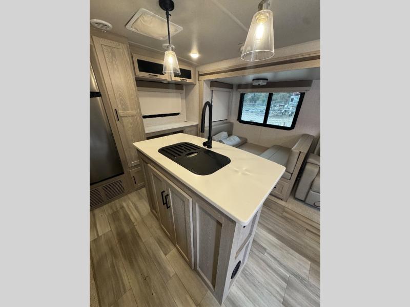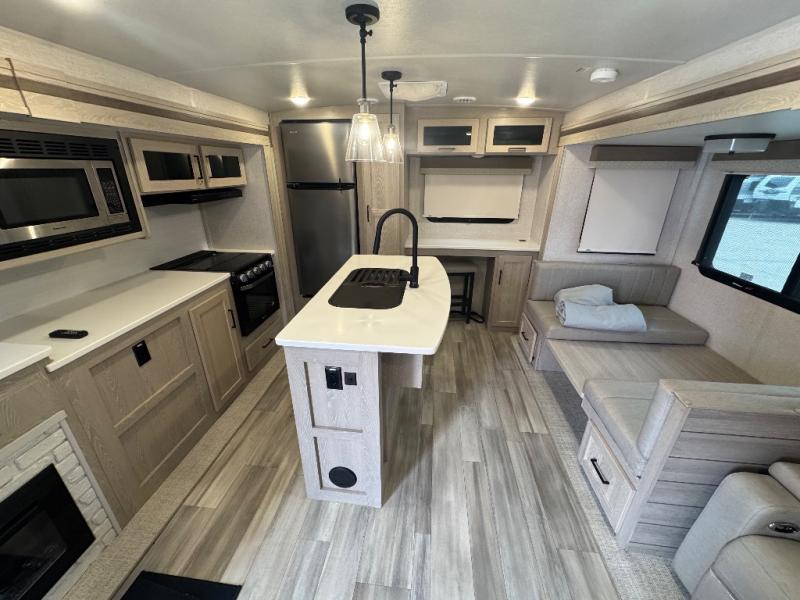 Whether you travel for pleasure, work or both, this trailer offers a rear desk area and a booth dinette that offer the space you will need for your laptop, papers, books and/or your coffee. The main living area is spacious with a slide out and provides more floor space in the kitchen as well. You can relax while on the 67" theater seating while watching the LED TV and enjoying the fireplace while the cook prepares and makes meals in the kitchen which includes an island for more counter space to dry the dishes and serve food. The double entry bath is convenient especially when you have guests sleeping on the furniture, and the bedroom gives you a place to sleep on a queen bed slide, and you will find plenty of storage in the wardrobe, on the countertop, and along the front wall.