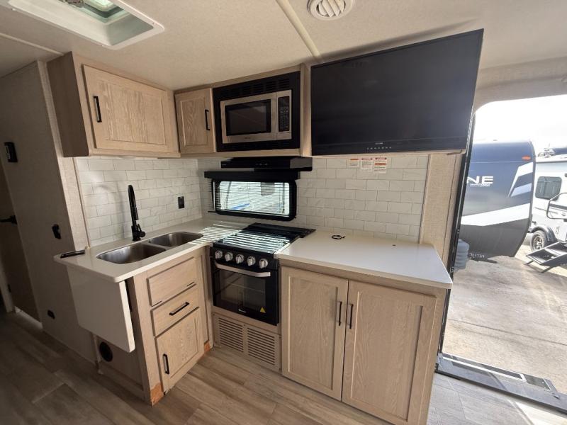 Load up your family and invite some friends to camp for the weekend or maybe a week-long stay at your favorite campground! You will be able to provide sleeping space for nine from having your own queen bed slide in the front bedroom, triple bunk beds plus a Play Cube sofa, and the furniture in the main living area within the slide out. The youngest will love the bunk beds yet your adult friends will also, plus having their own privacy is nice. Everyone can gather in the living area and kitchen to discuss the plans for the day while some start cooking up breakfast using full amenities and someone might even use the outside kitchen to make even more food. The 21' awning offers an outdoor living area protected from the elements, and you will find exterior storage for your outdoor gear, a bike door that allows you to stow items inside the bunkhouse while traveling, and a ladder if you need to check the roof.