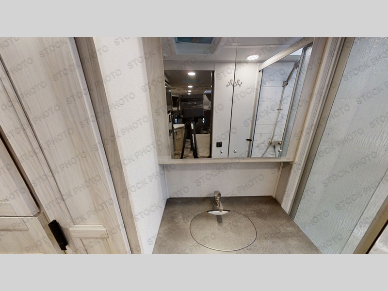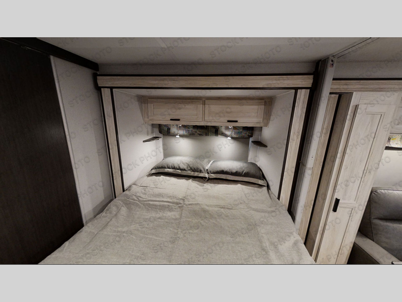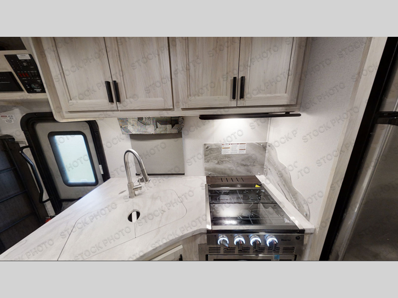 You will feel right at home traveling in this motorhome! The full rear bathroom has a 24" x 36" shower to freshen up in, plus storage space and a private toilet so you both can use this room at once. Inside the bedroom is a 60" x 74" queen bed slide for more space, and a 12V TV for movies in bed. Prepare your best meals with the three burner cooktop and the 10.7 cu. ft. 12V refrigerator or throw some leftovers in the undermount 1.3 cu. ft. convection microwave then enjoy it at the U-shaped dinette slide. The 60" x 80" bunk over cab mat offers a comfortable place to sleep but if you don't need the extra sleeping space, you can switch it out for the optional Trekker cap with a built-in entertainment center, plus there is an optional outside 12V TV to add!