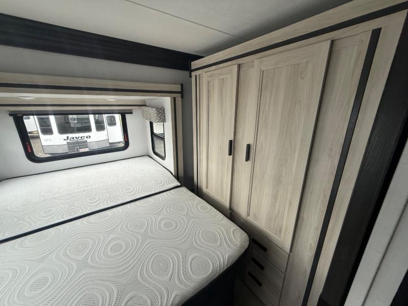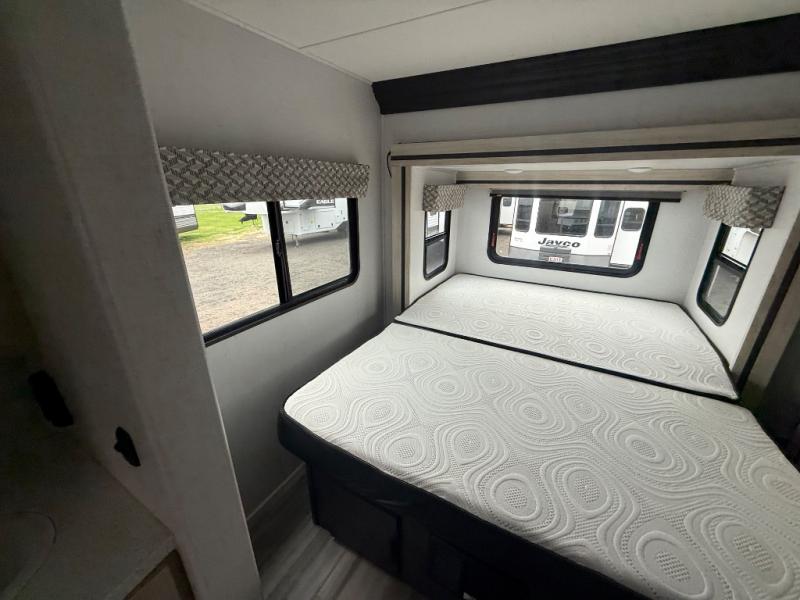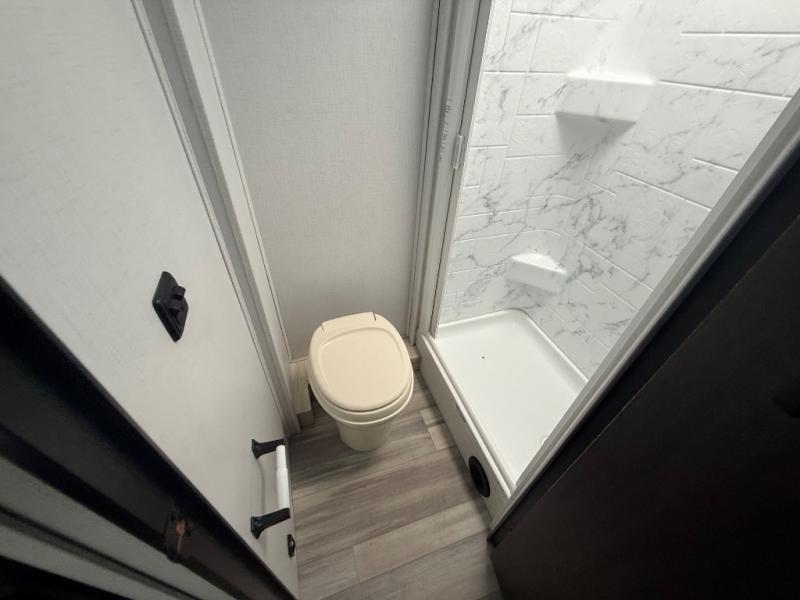 This motorhome has everything you will need for a fun and comfortable road trip! The rear private bedroom has a queen bed slide, a 12V TV, and a wardrobe to keep your clothes looking nice. Plus, it leads into the separated bathroom which has a private shower and a toilet across from a sink with a medicine cabinet. The 10.7 cu. ft. 12V refrigerator is big enough to store your perishables, the flip-up countertop will make meal prepping easier, and the three burner cooktop is just waiting for you to fry up some bacon. Enjoy all of your meals and game nights at the U-shaped dinette slide then transform it into an extra sleeping space if needed. Speaking of sleeping spaces, the 60" x 80" bunk over cab mat is a comfortable place for one to sleep or you can switch it out for an optional Trekker cap with a built-in entertainment center. You can even choose to add an optional outside 12V TV!