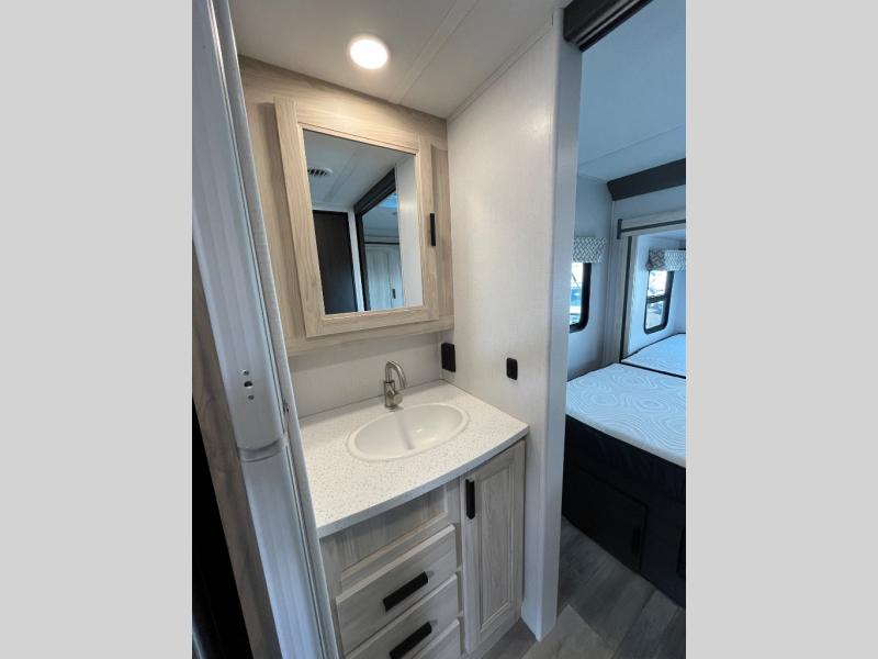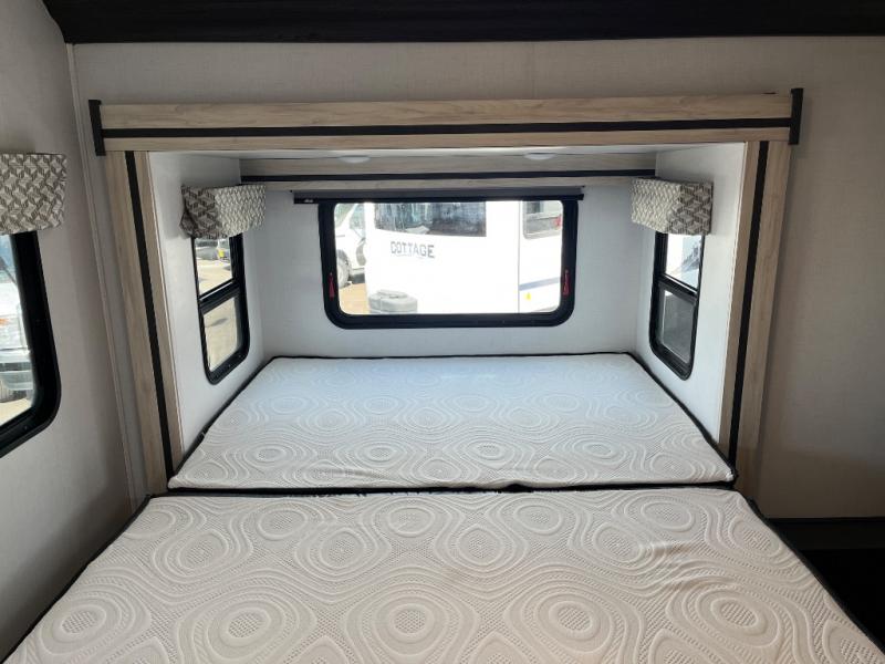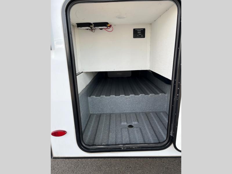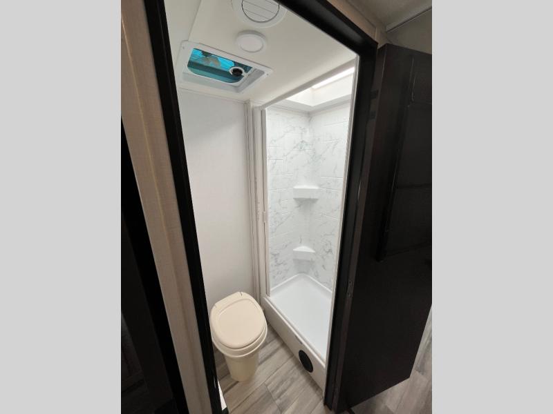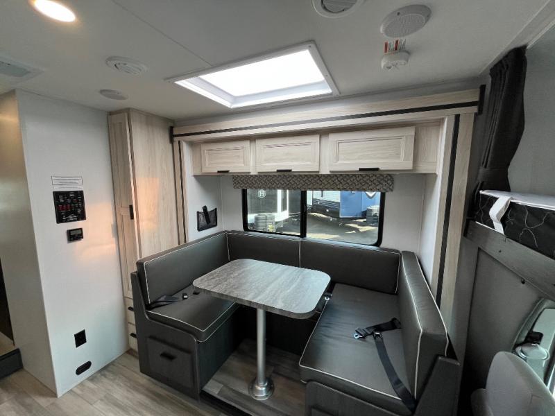 This motorhome has everything you will need for a fun and comfortable road trip! The rear private bedroom has a queen bed slide, a 12V TV, and a wardrobe to keep your clothes looking nice. Plus, it leads into the separated bathroom which has a private shower and a toilet across from a sink with a medicine cabinet. The 10.7 cu. ft. 12V refrigerator is big enough to store your perishables, the flip-up countertop will make meal prepping easier, and the three burner cooktop is just waiting for you to fry up some bacon. Enjoy all of your meals and game nights at the U-shaped dinette slide then transform it into an extra sleeping space if needed. Speaking of sleeping spaces, the 60" x 80" bunk over cab mat is a comfortable place for one to sleep or you can switch it out for an optional Trekker cap with a built-in entertainment center. You can even choose to add an optional outside 12V TV!