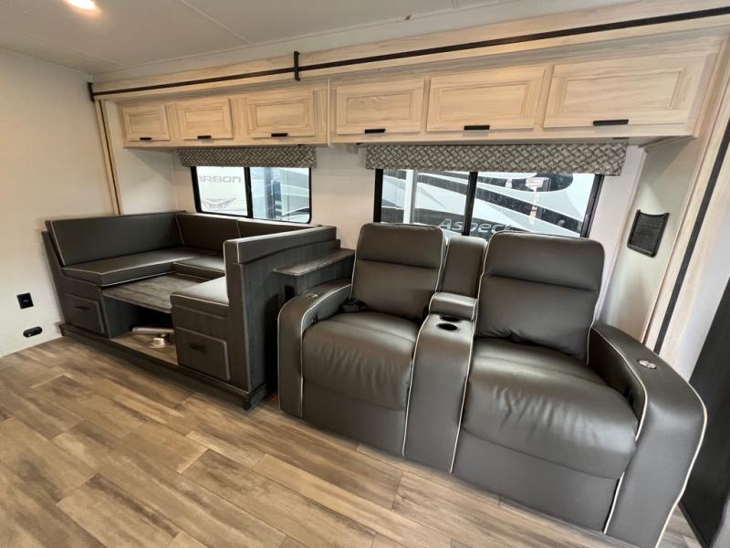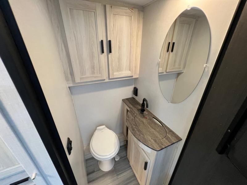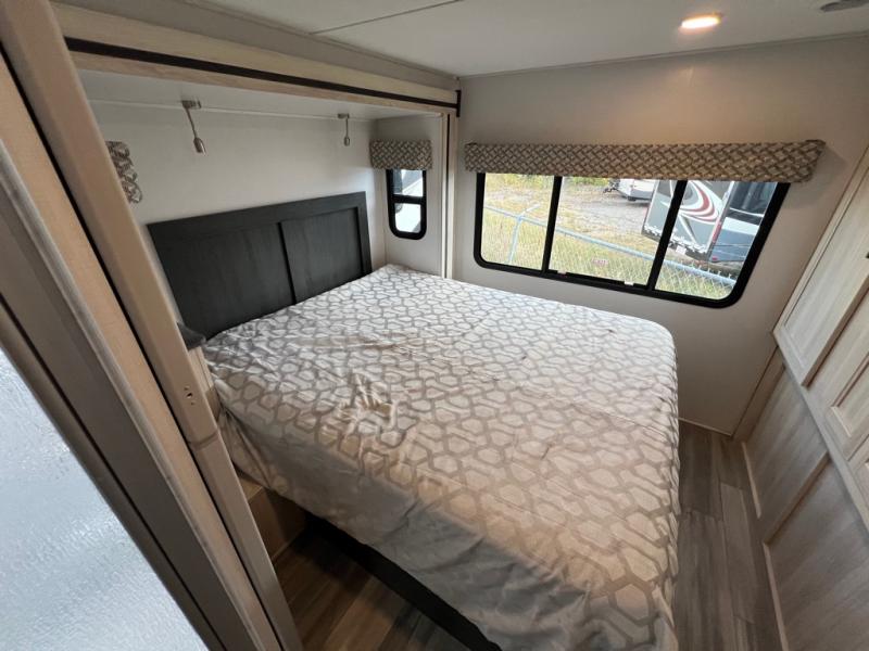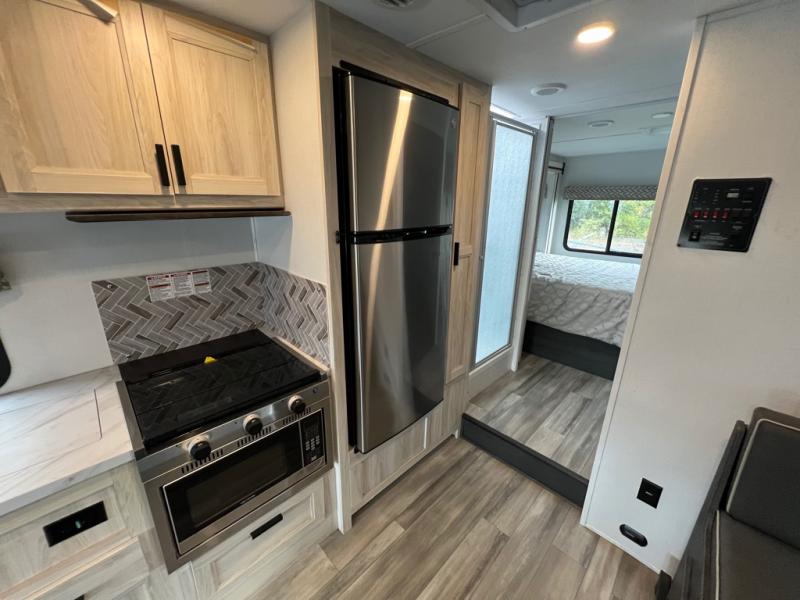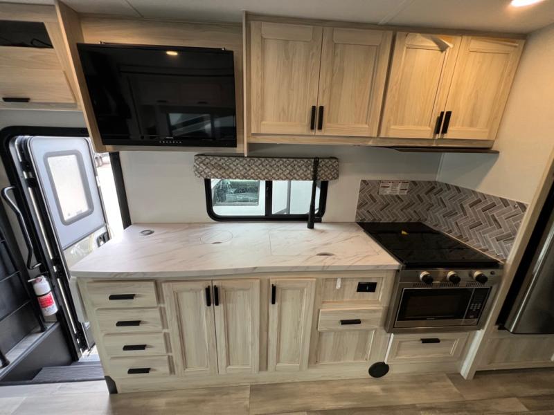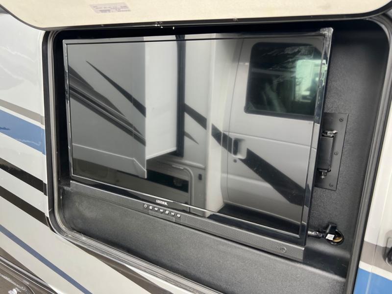 Escape the hustle and bustle of everyday life with this motorhome! It features a 60" x 80" bunk over cab mat which can be switched out for an optional Trekker cap with a built-in entertainment center. The sofa and U-shaped dinette slide offer comfortable places to enjoy meals, socialize, and even sleep once converted. Prepare your best meals with the 10.7 cu. ft. 12V refrigerator, the three burner cooktop, the flip-up countertop, and even the 1.3 cu. ft. undermount convection microwave. The separated bathroom has a 24" x 32" shower across from a toilet with a sink and countertop space, plus it leads directly into the rear private bedroom which has a 60" x 74" queen bed slide across from a linen/12V TV area with wardrobes on either side. You can even add an optional outside 12V TV and stay protected by the 15' 6" power awning!