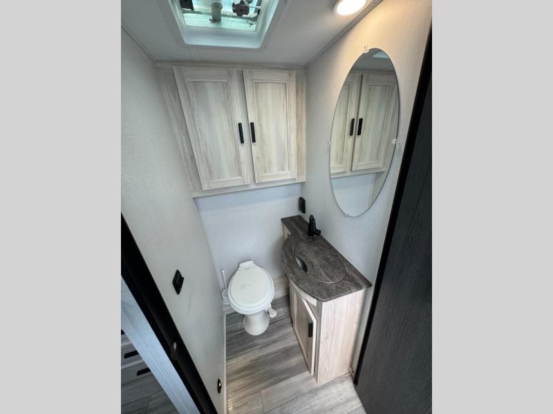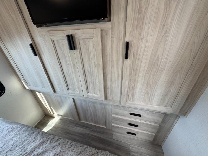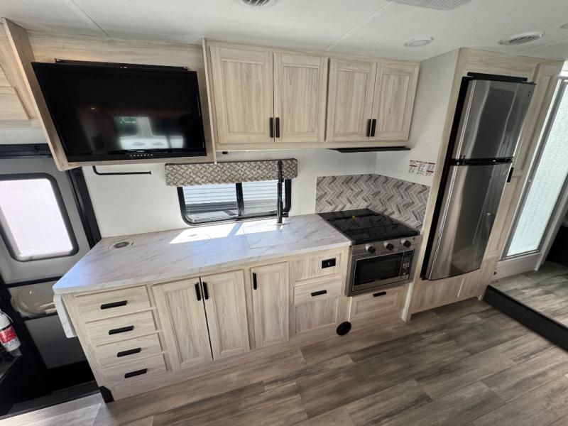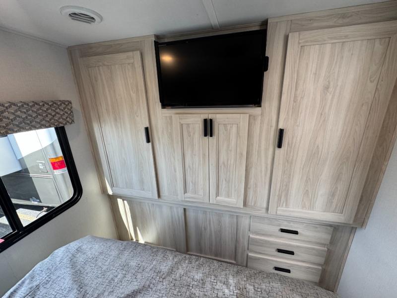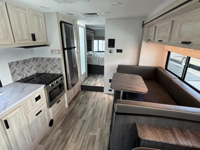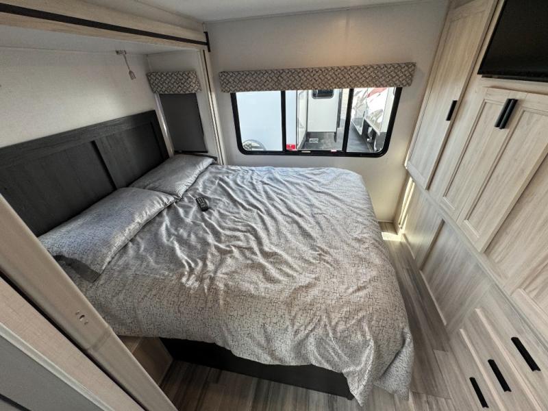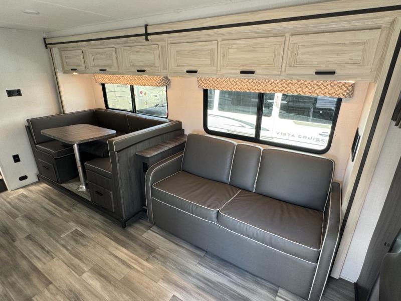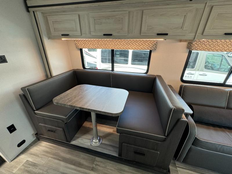 Escape the hustle and bustle of everyday life with this motorhome! It features a 60" x 80" bunk over cab mat which can be switched out for an optional Trekker cap with a built-in entertainment center. The sofa and U-shaped dinette slide offer comfortable places to enjoy meals, socialize, and even sleep once converted. Prepare your best meals with the 10.7 cu. ft. 12V refrigerator, the three burner cooktop, the flip-up countertop, and even the 1.3 cu. ft. undermount convection microwave. The separated bathroom has a 24" x 32" shower across from a toilet with a sink and countertop space, plus it leads directly into the rear private bedroom which has a 60" x 74" queen bed slide across from a linen/12V TV area with wardrobes on either side. You can even add an optional outside 12V TV and stay protected by the 15' 6" power awning!