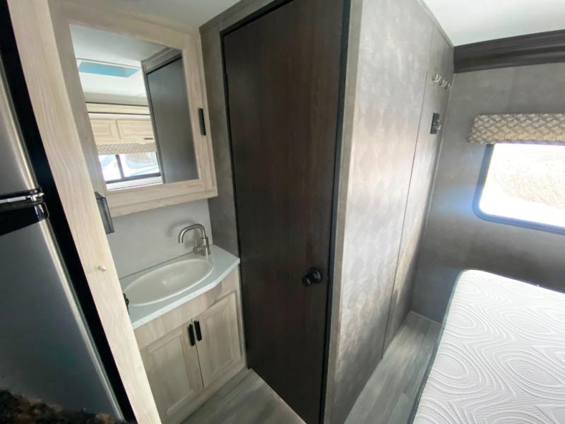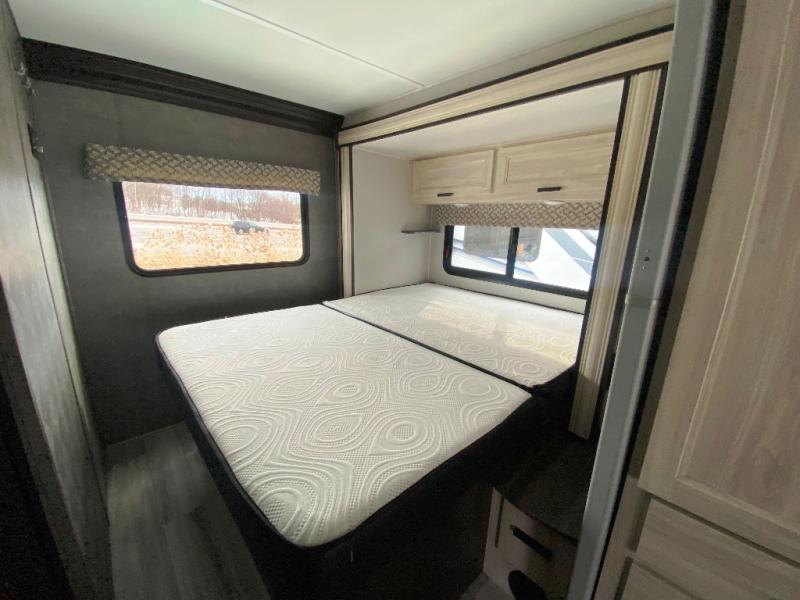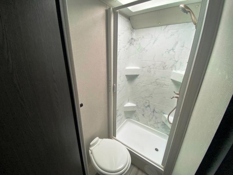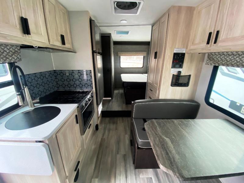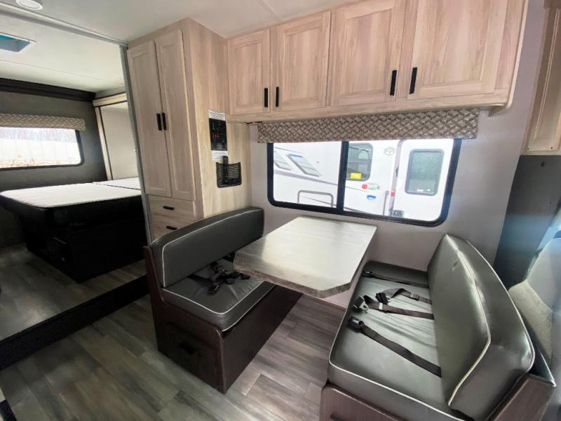 Enjoy trips near and far in this single slide out coach. The kitchen provides a 10.7 cu. ft. 12V refrigerator to store the cold items, a convection microwave and a recessed three-burner range to whip up meals. The private toilet and shower give you a place to get cleaned up, and the bathroom sink is just outside the door. This model includes a queen bed slide out with a wedge mattress, and there is a cab-over bunk for your guests. You can spend your evenings playing cards at the booth dinette, or head outdoors to relax under the 14' power awning with LED lights!