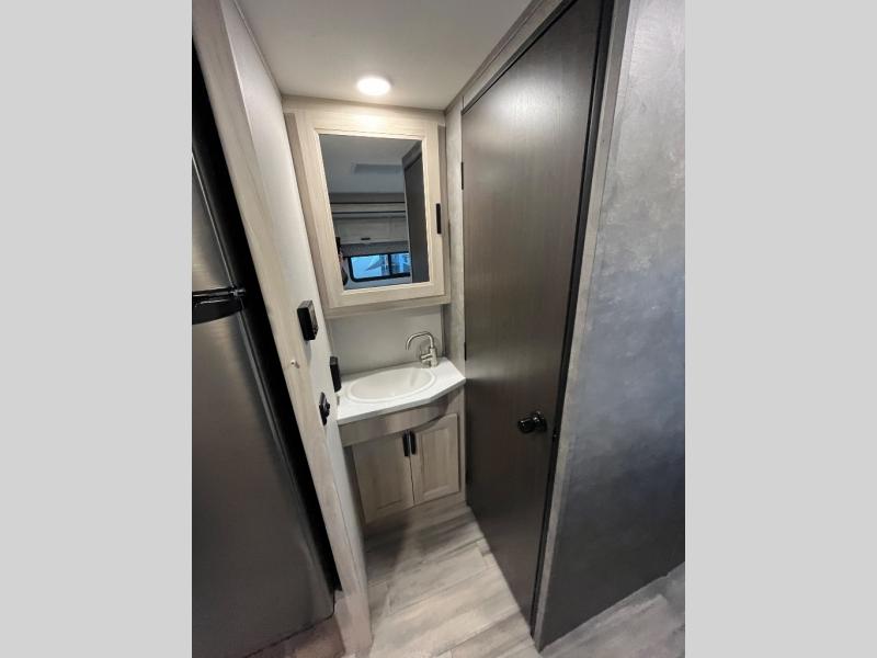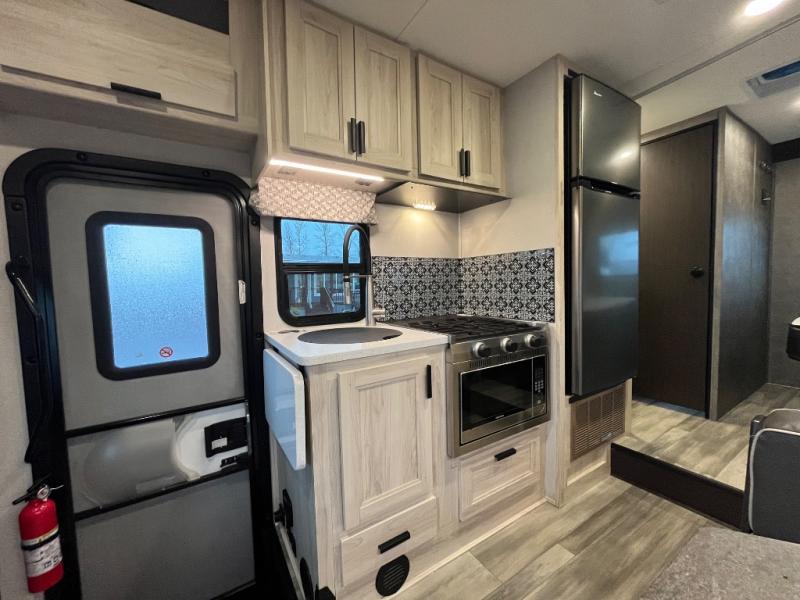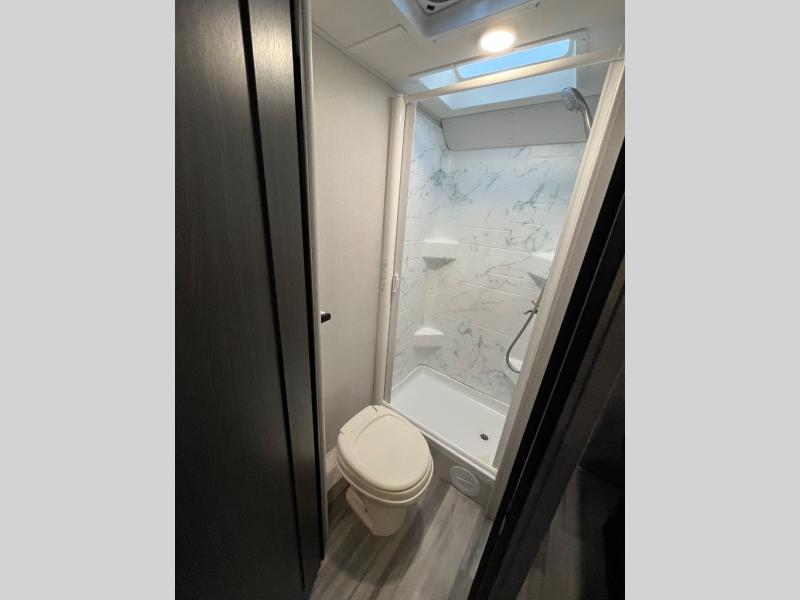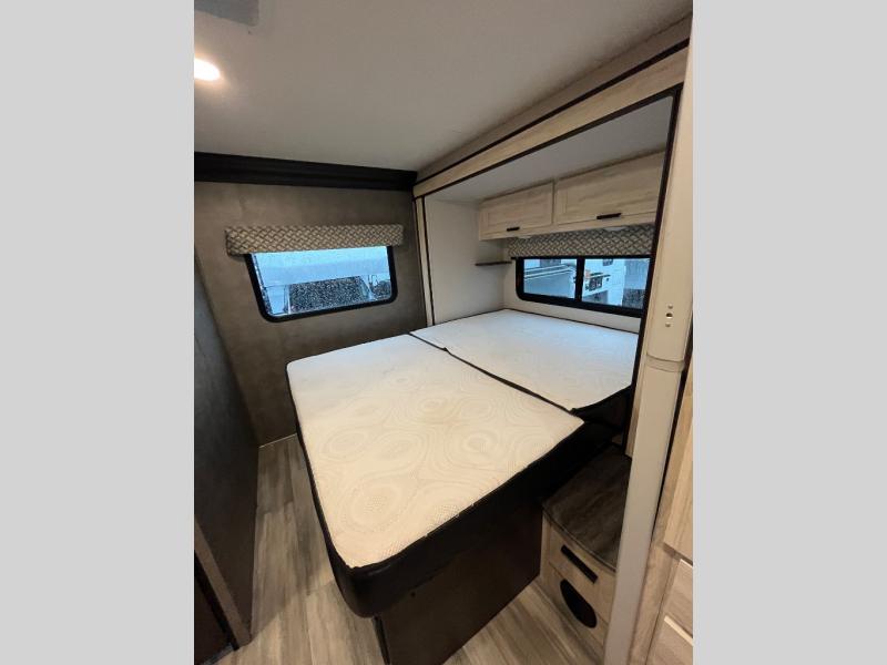 Enjoy trips near and far in this single slide out coach. The kitchen provides a 10.7 cu. ft. 12V refrigerator to store the cold items, a convection microwave and a recessed three-burner range to whip up meals. The private toilet and shower give you a place to get cleaned up, and the bathroom sink is just outside the door. This model includes a queen bed slide out with a wedge mattress, and there is a cab-over bunk for your guests. You can spend your evenings playing cards at the booth dinette, or head outdoors to relax under the 14' power awning with LED lights!