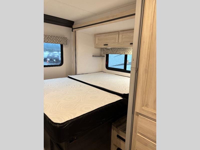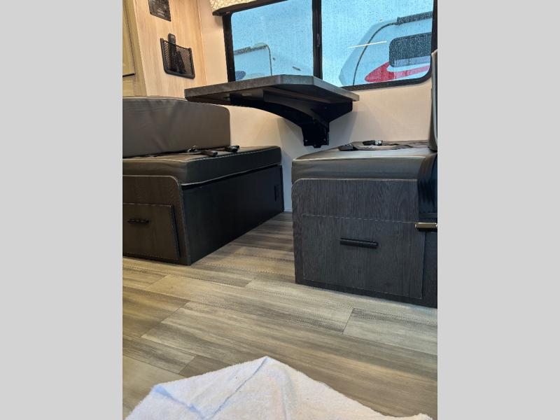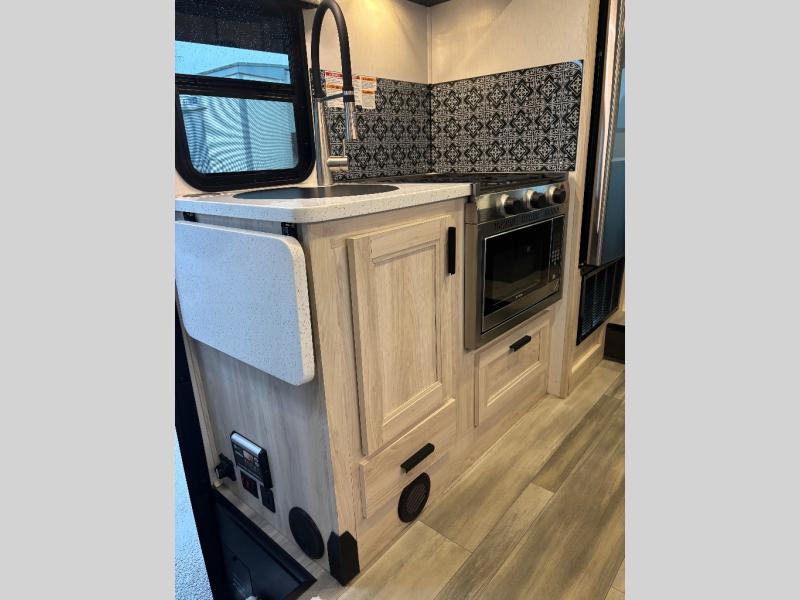 Enjoy trips near and far in this single slide out coach. The kitchen provides a 10.7 cu. ft. 12V refrigerator to store the cold items, a convection microwave and a recessed three-burner range to whip up meals. The private toilet and shower give you a place to get cleaned up, and the bathroom sink is just outside the door. This model includes a queen bed slide out with a wedge mattress. You can spend your evenings playing cards at the booth dinette, or head outdoors to relax under the 14' power awning with LED lights!