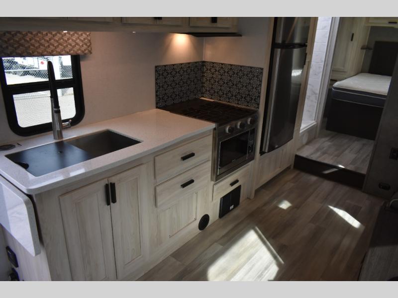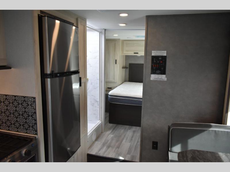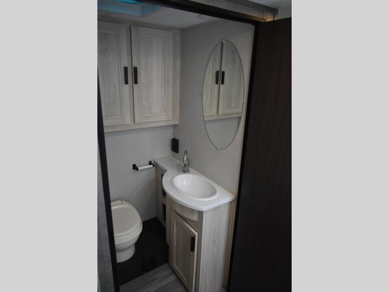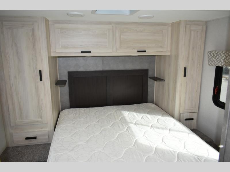 You and your favorite person will love this coach for many reasons including having your own private bedroom with a split bathroom, a walk-around queen bed, plus your own wardrobe. The split bathroom is pretty handy since one person can get ready in the private toilet and sink room while another is taking a shower. The kitchen offers a 10.7 cu. ft. 12V refrigerator, a convection microwave, a recessed three-burner range, soft touch self-closing drawer guides and a cordless 12V charging plate. You will have overhead cabinets and a pantry for storage. The slide out sofa and booth dinette offer a great place to relax and dine plus gives you more floor space. And the queen bunk over the cab will be a popular sleeping space for overnight guests.