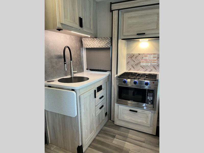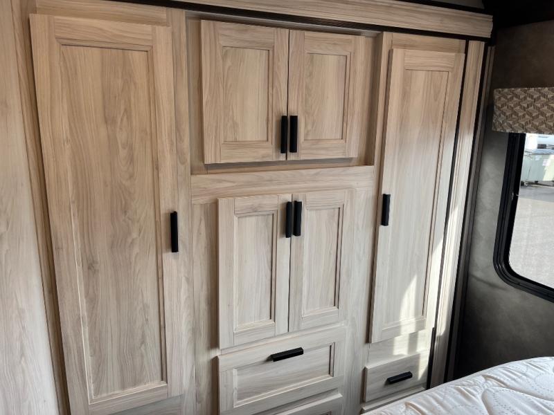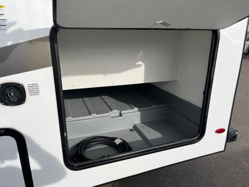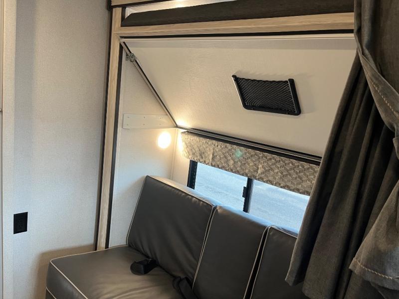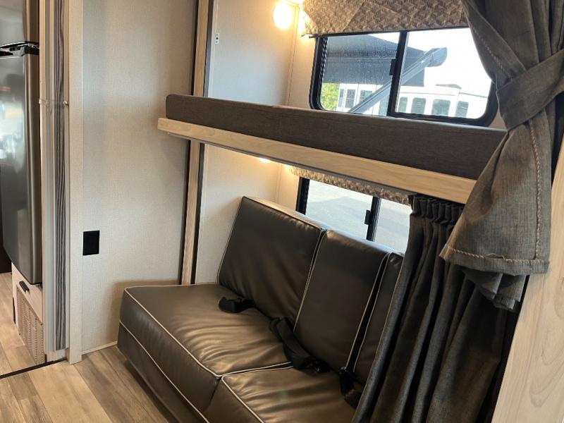 This family friendly coach allows the kids to have their own space either on the flip-down bunk above the kid's sofa sleeper that is across from the full bathroom or on the cab-over bunk. You will have the rear bedroom all to yourselves with a queen bed and a large wardrobe for your things. Everyone can visit while relaxing on the sofa and booth dinette while watching the LED TV or even while sitting under the 11' power awning outside when you add your camping chairs. The kitchen offers a corner area to make meals with a convection microwave and recessed three-burner range, plus a round sink and flip-up counter extension, and you can store cold items in the 10.7 cu. ft. 12V refrigerator near the entry, and the soft touch self-closing drawer guides and cordless 12V charging plate are features you will love.