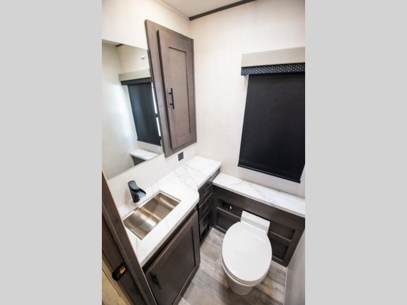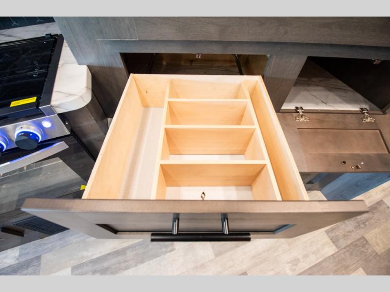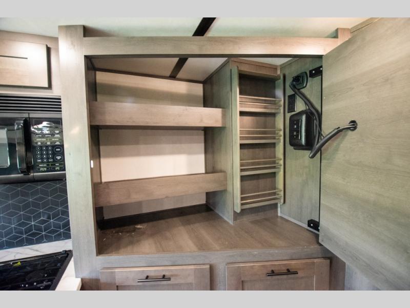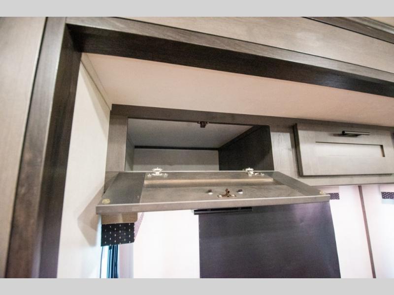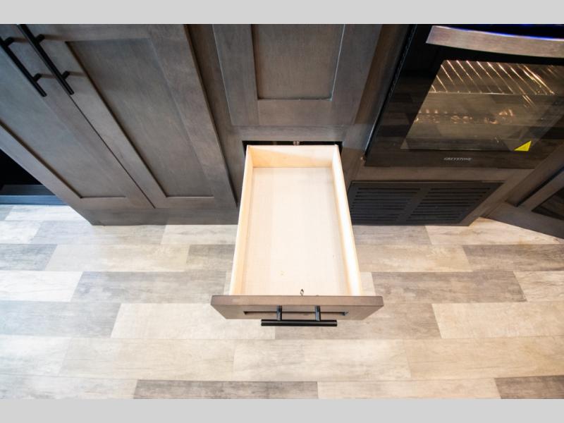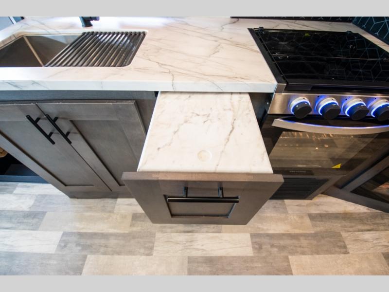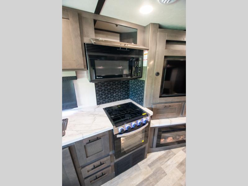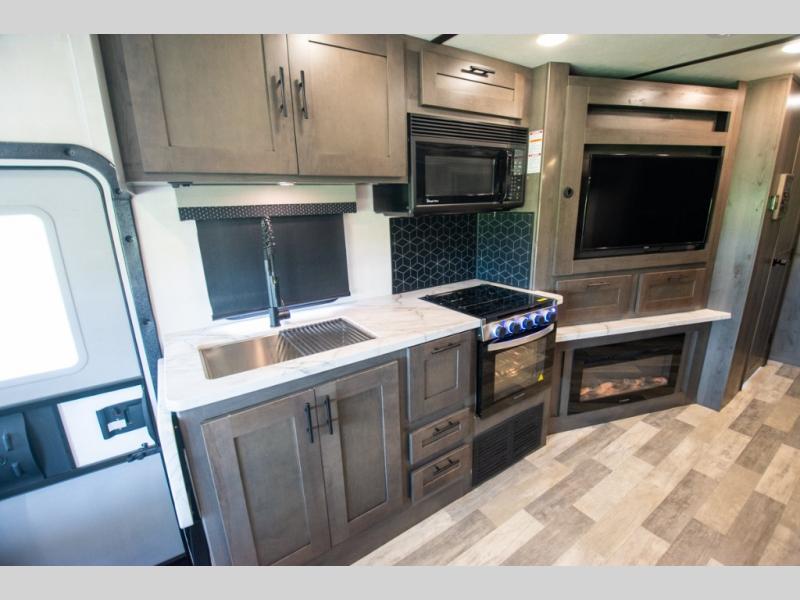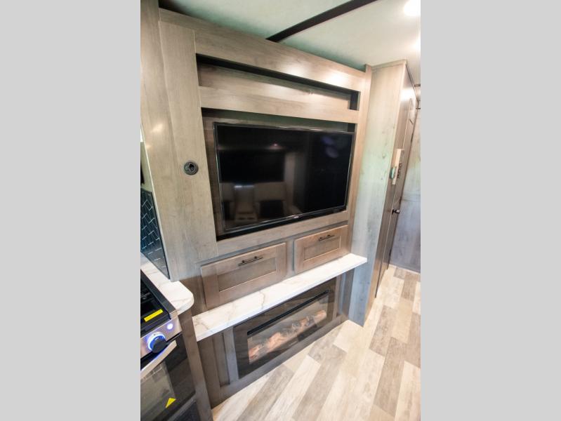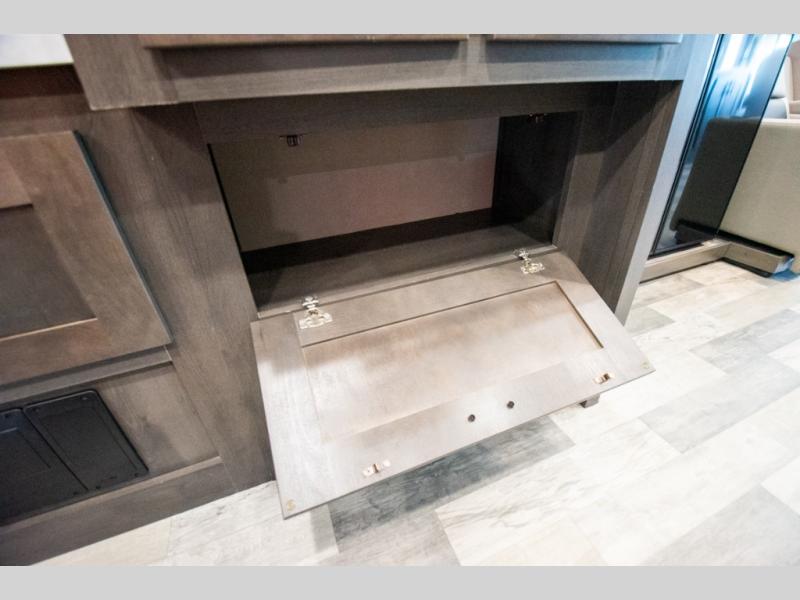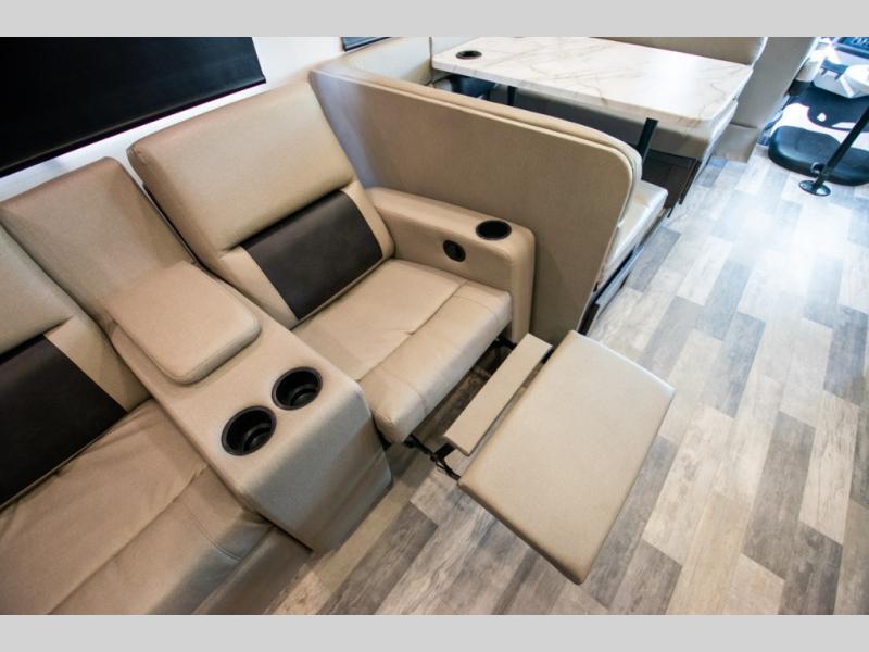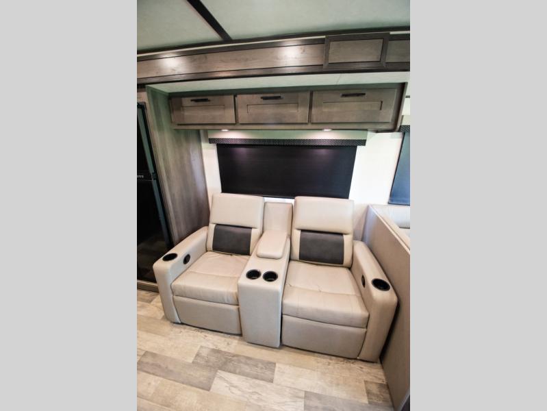 Spacious and inviting for couples or families, this FR3 Class A gas motorhome offers convenience throughout including a half bath for the kids and guests and a full rear bathroom for the owners. This full bathroom is located within the rear master suite where you will also find a king-size bed for relaxing. Once at your destination, you can quickly set up the power awning to relax outside while watching the exterior TV and visiting with other RVers. You might have decided to add the washer and dryer option in the bedroom, so a load of laundry might even get done. Once you are ready to fill your tummy, the full kitchen offers everything you need plus a residential microwave. You might even decide to relax on one of the theater seats after dinner as you watch the big game on the 40" LED 12V TV with a fireplace below.