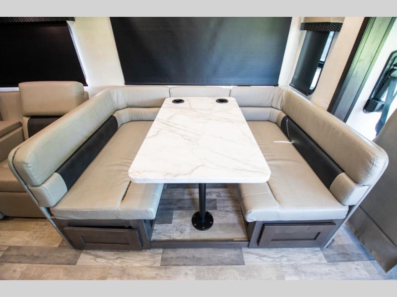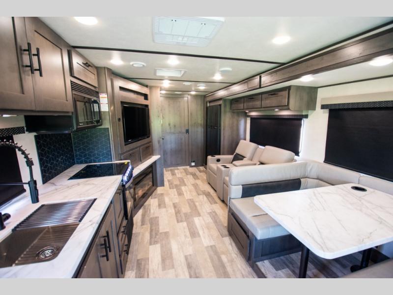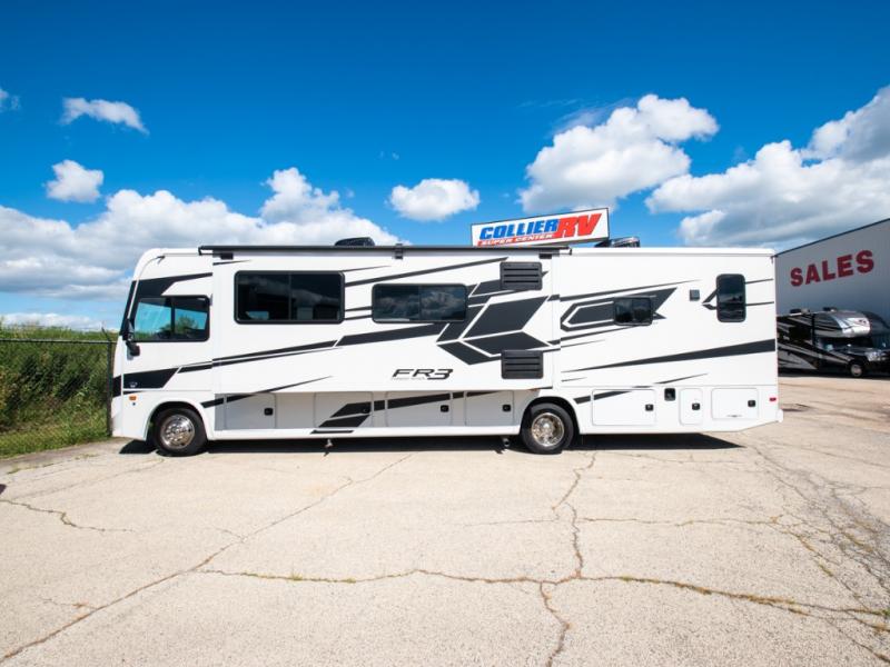 With each FR3 Class A gas motorhome by Forest River, you will find an easy-to-drive coach with a spacious interior allowing you to gather with friends and family with convenience and style found throughout! Each is built with vacuum-bonded construction, a one-piece fiberglass roof with extended rain spouts, a steel firewall and A-pillar extension, Bi-LED headlamps and lower LED fog lights, and grey Rotocast storage boxes with drains. Inside, you will enjoy black hardware, appliances, plumbing fixtures, and a glass shower door frame. You will also find a stainless steel kitchen sink with a bamboo cutting board and roll-up dryer, heavy-duty full-extension ball bearing drawer guides, dual-access dinette storage with doors, and nightstands with charging stations to keep your cellphones ready for whatever is next. Make your selection today!