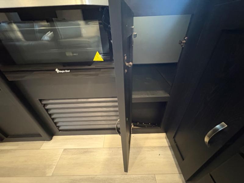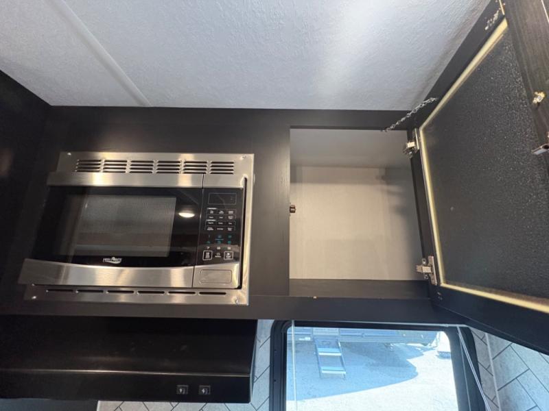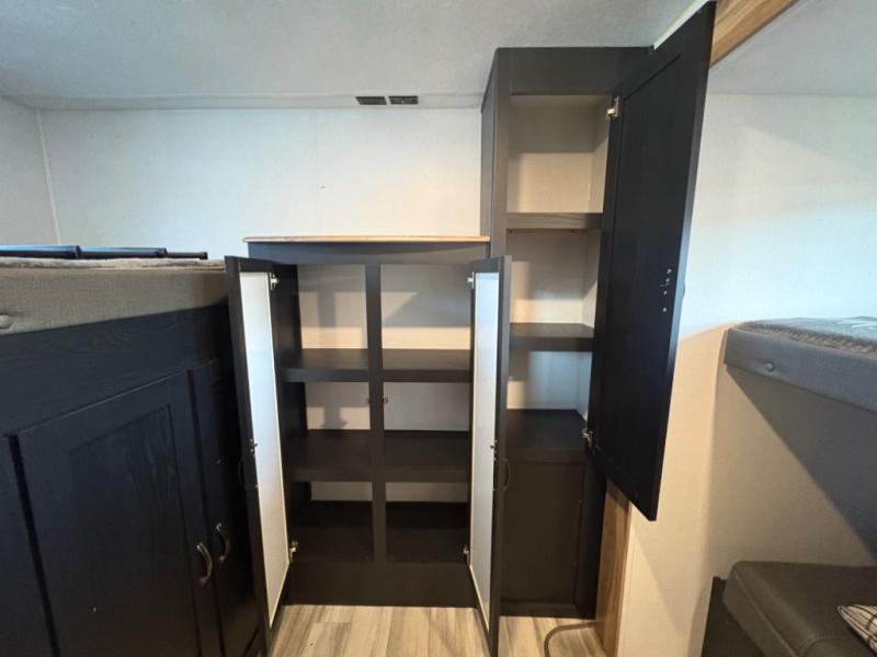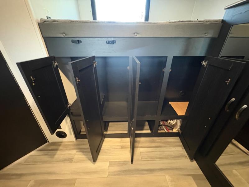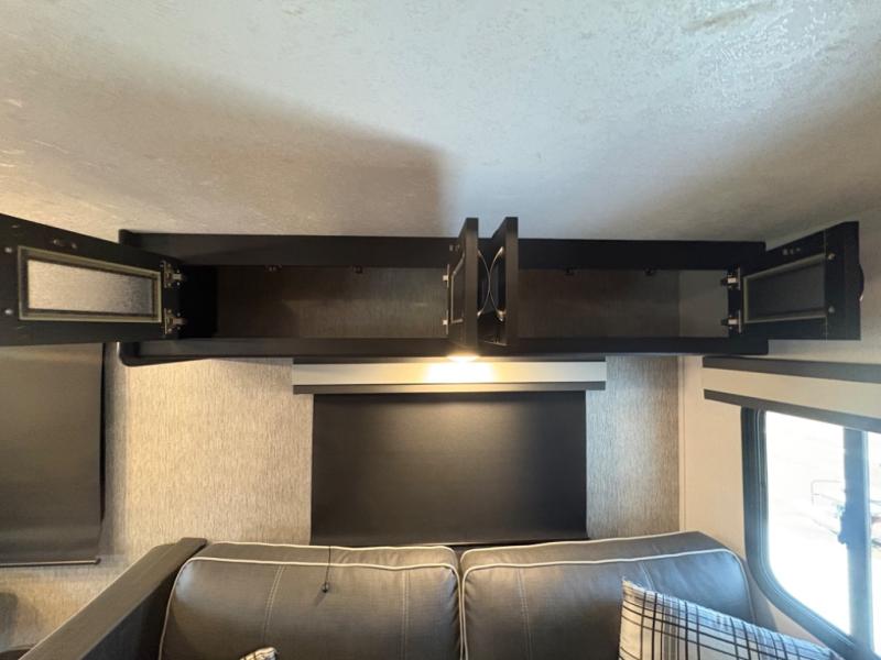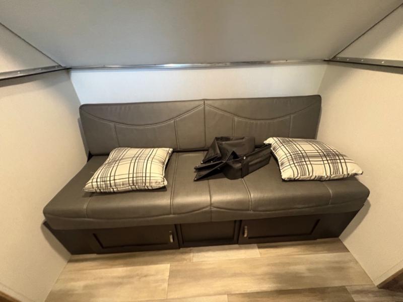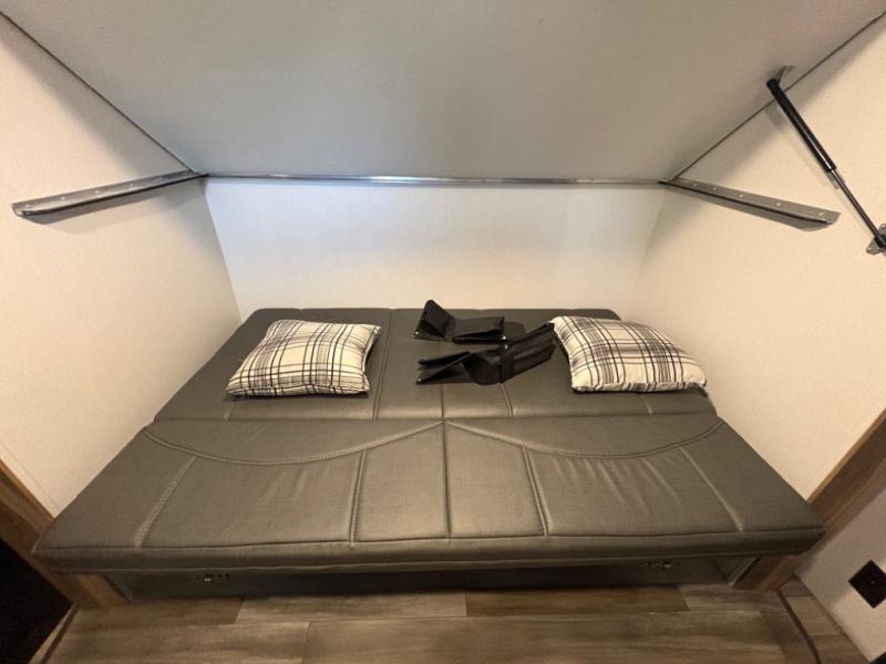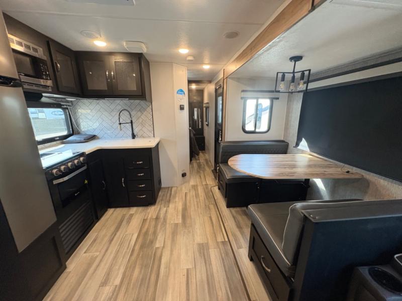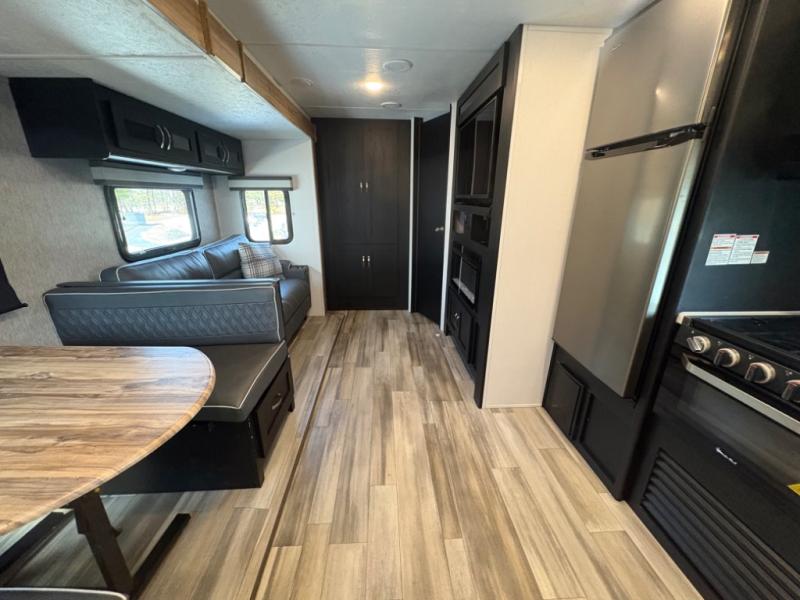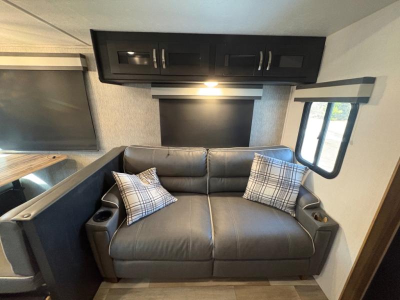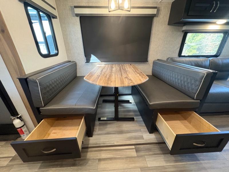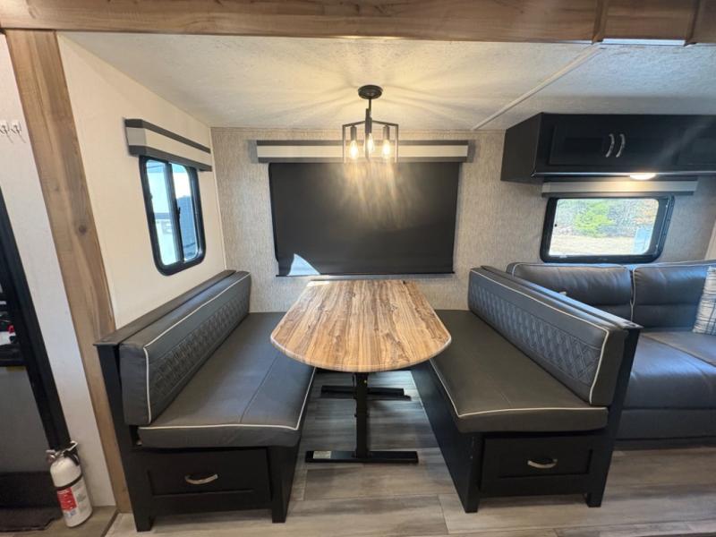 Prepare meals with ease using the three-burner cooktop, oven, microwave, refrigerator, and generous counter space. Ample cabinetry keeps everything organized. The convertible dinette and comfortable seating provide room for meals, game nights, or additional sleeping space.