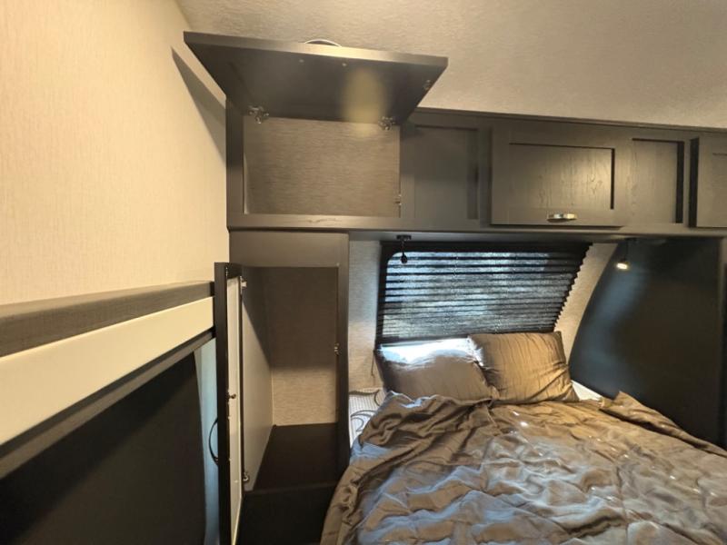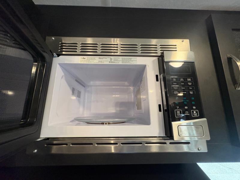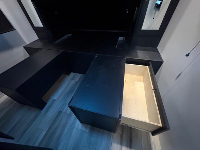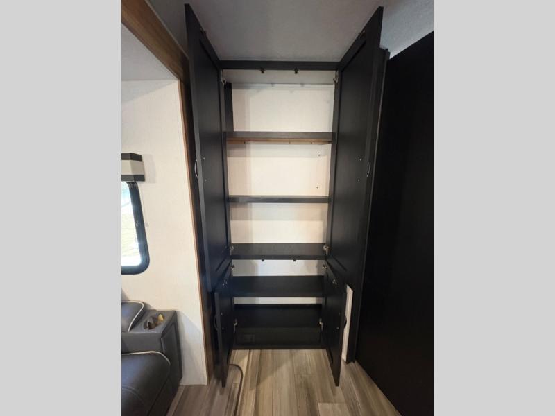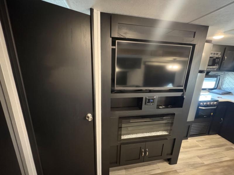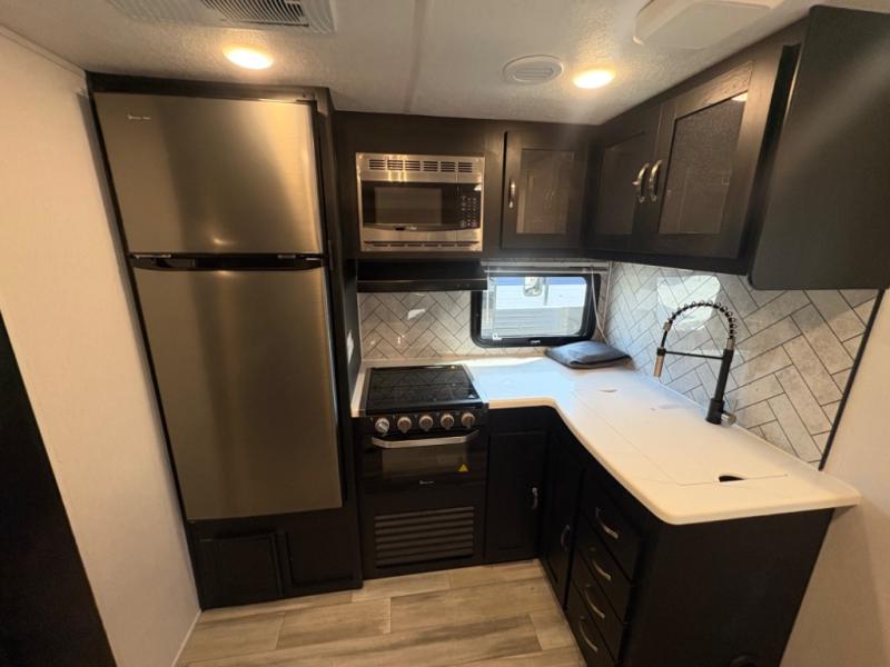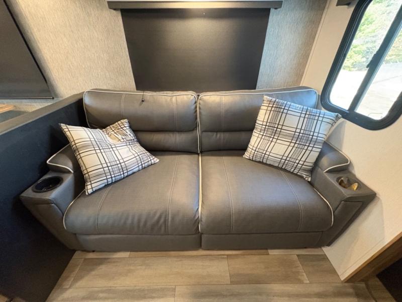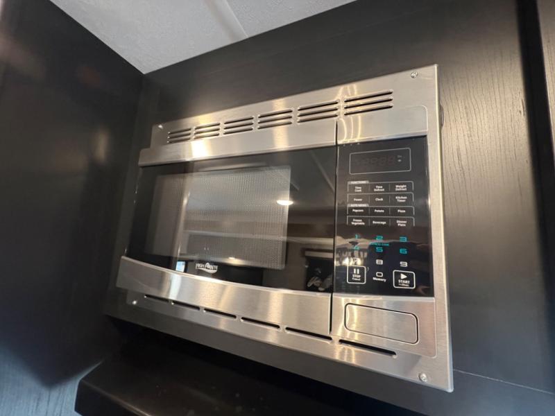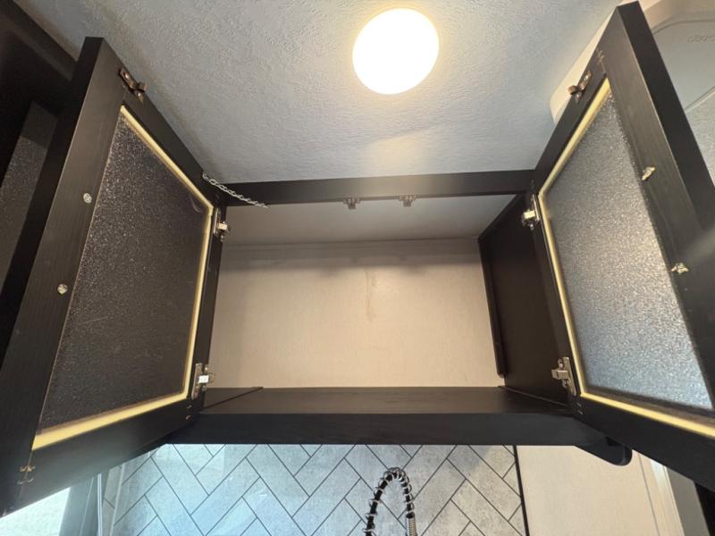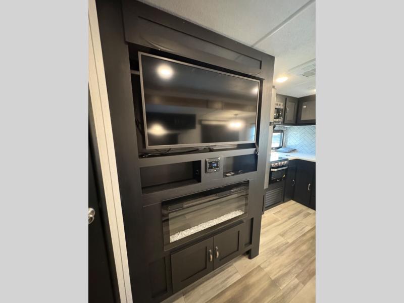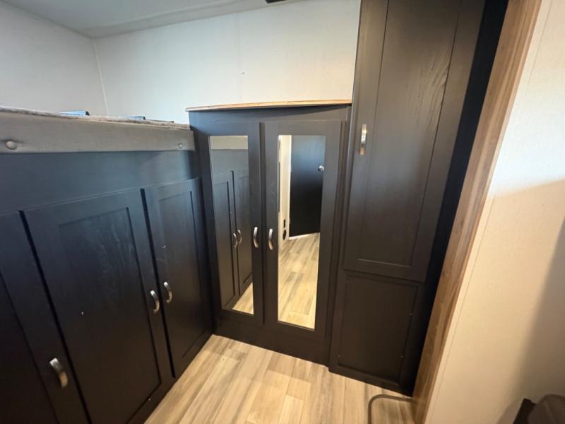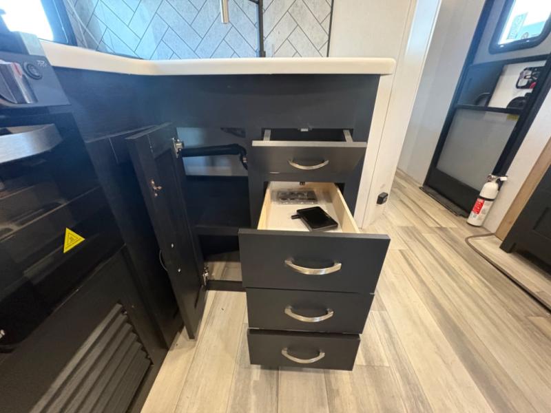 Prepare meals with ease using the three-burner cooktop, oven, microwave, refrigerator, and generous counter space. Ample cabinetry keeps everything organized. The convertible dinette and comfortable seating provide room for meals, game nights, or additional sleeping space.