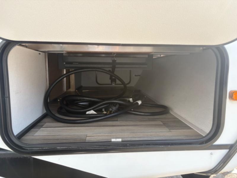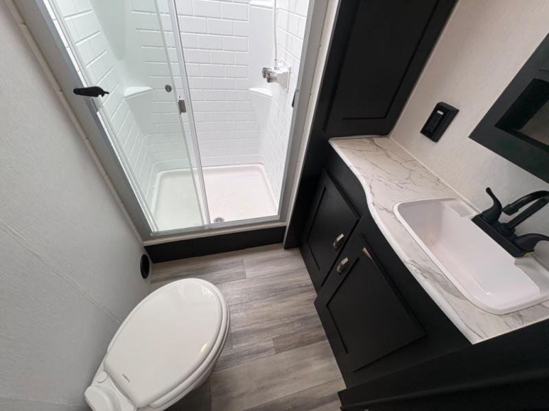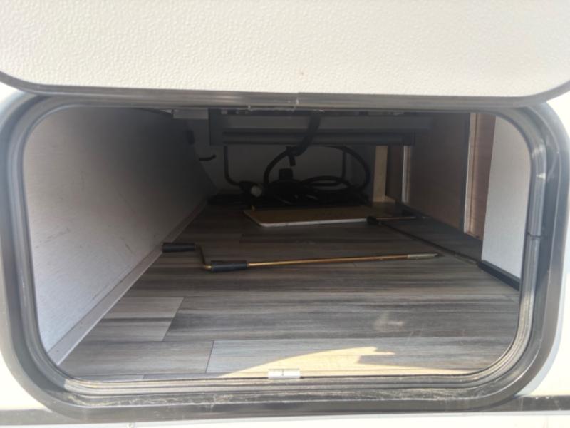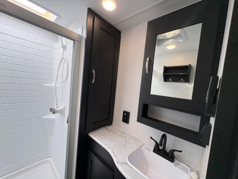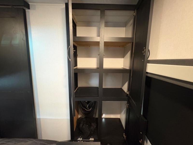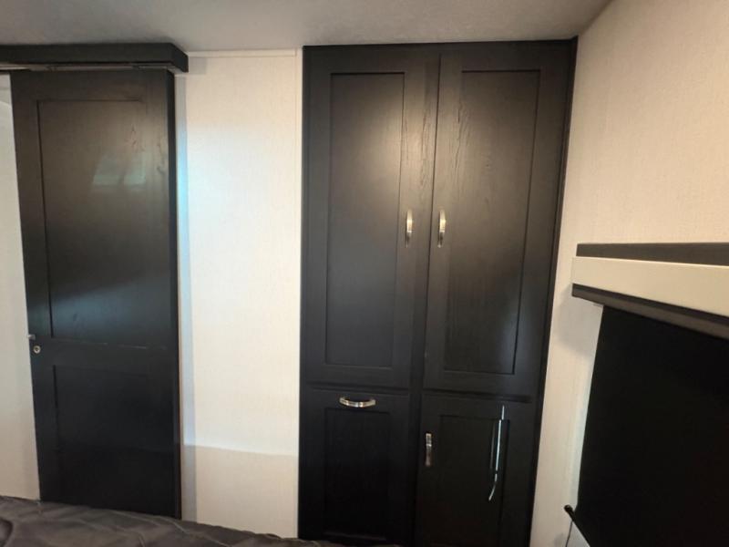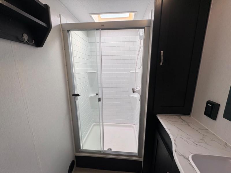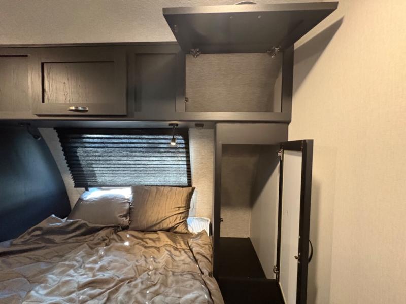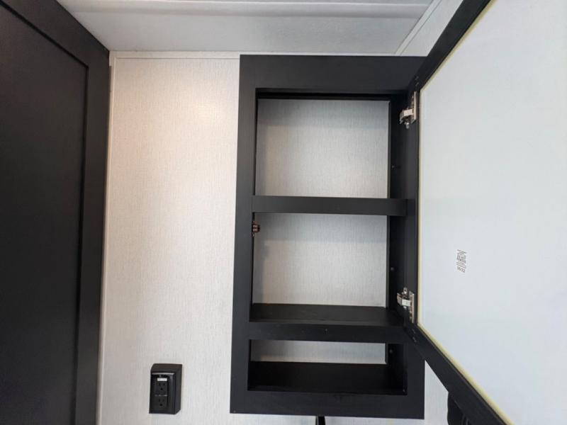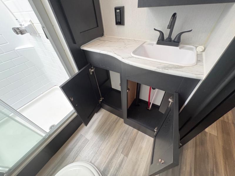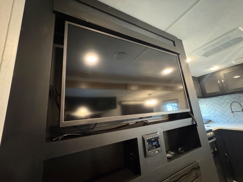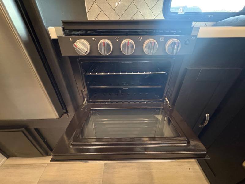 Prepare meals with ease using the three-burner cooktop, oven, microwave, refrigerator, and generous counter space. Ample cabinetry keeps everything organized. The convertible dinette and comfortable seating provide room for meals, game nights, or additional sleeping space.