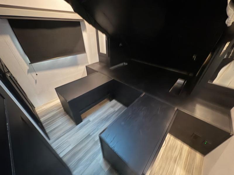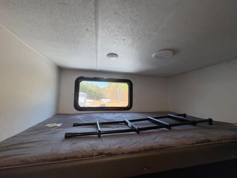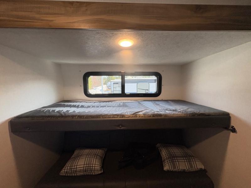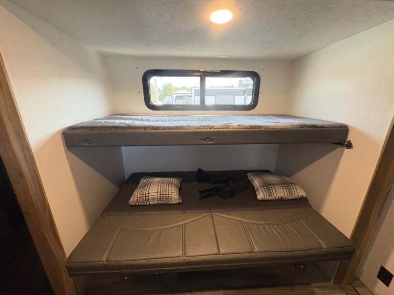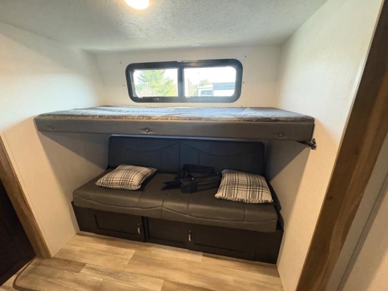 The private rear bunkhouse provides dedicated sleeping space for kids or guests, while the large slide-out expands the main living area for added comfort. The open design, large windows, and flexible seating create a bright, welcoming space for relaxing, dining, or entertaining.