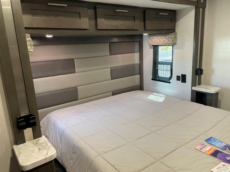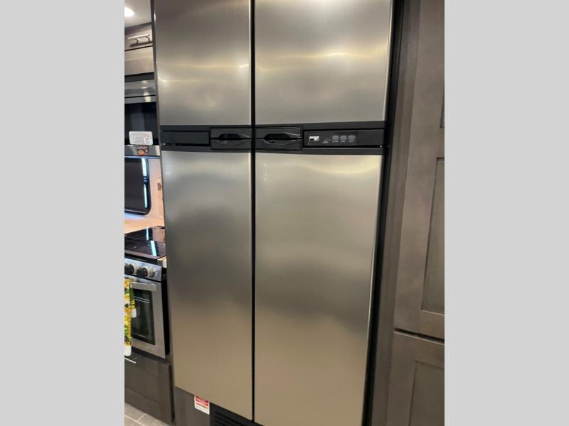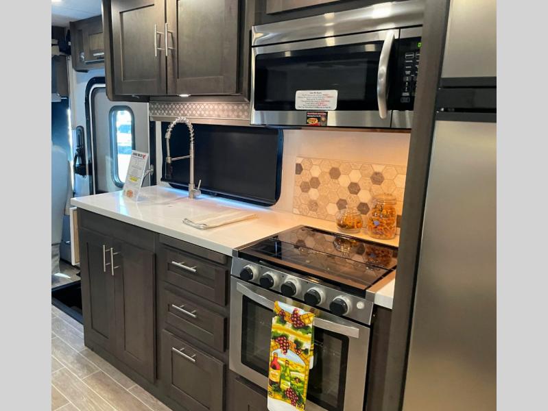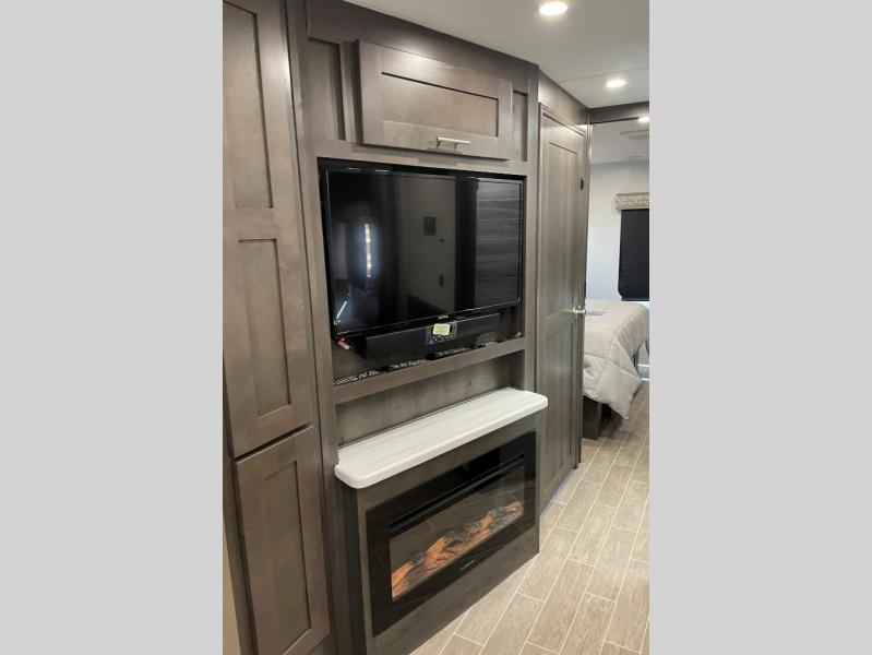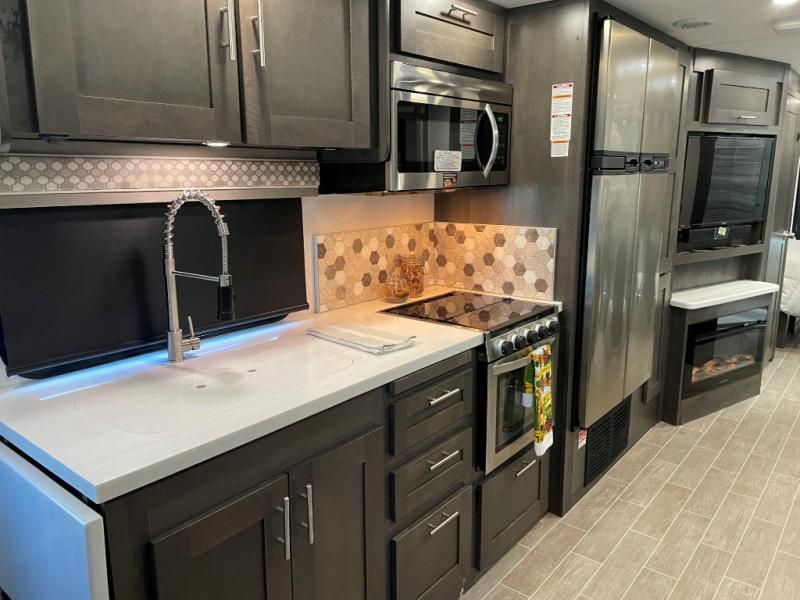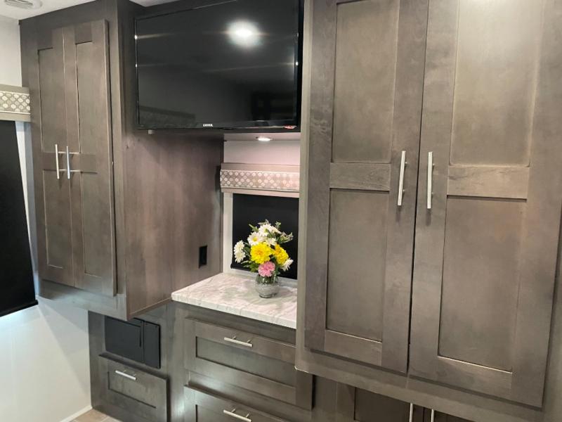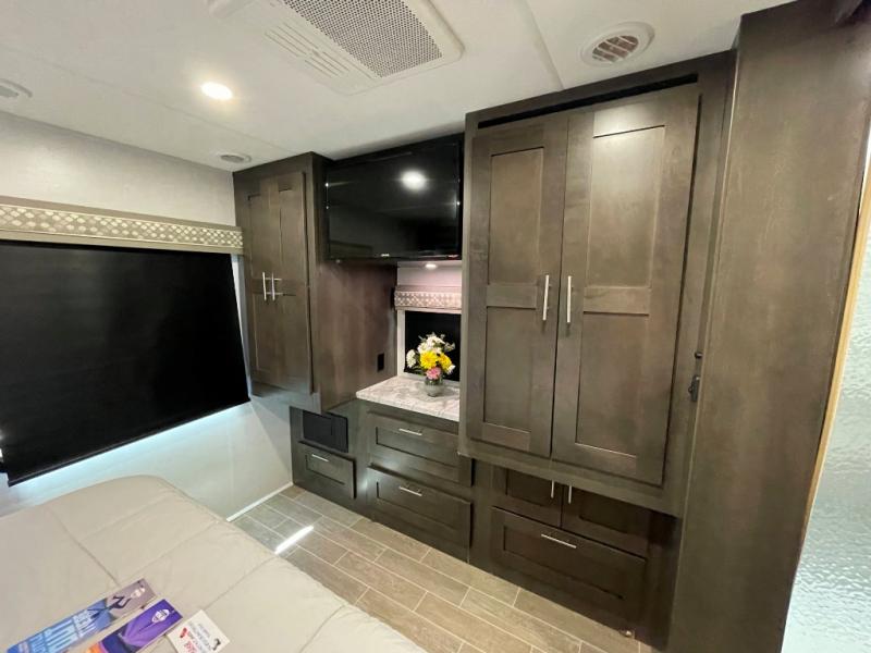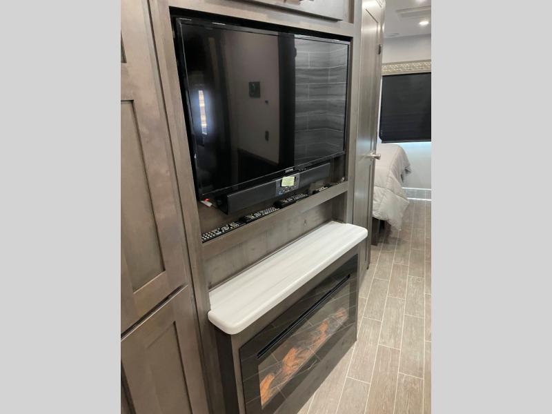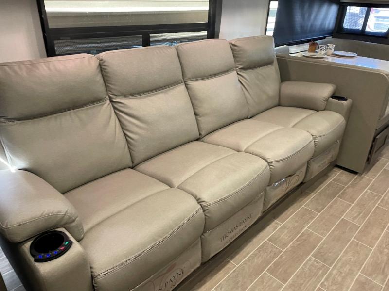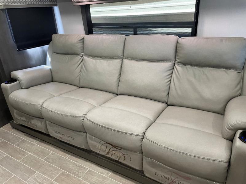You will love the spacious living entertainment in this motorhome! There is a Thomas Payne 4-person theater seating that reclines with adjustable headrests, heat, massage and has pop-up 110V outlets across from the 5,000 BTU fireplace with a 40" LED TV to watch your favorite movies in true comfort. The kitchen has everything you need to prepare your best home cooked meals including a brush nickel designer faucet with pull out spray wand for easy clean up, and you can enjoy all of your meals at the Dream Dinette. You will appreciate having your own private retreat with the rear bedroom which has a 72" x 80" king bed slide across from a dresser with a 32" LED TV, a wardrobe on one side, and another wardrobe on the other that is prepped to add an optional washer and dryer. There is also a 42" x 80" P2K Euro loft power bunk over cab for extra sleeping space!