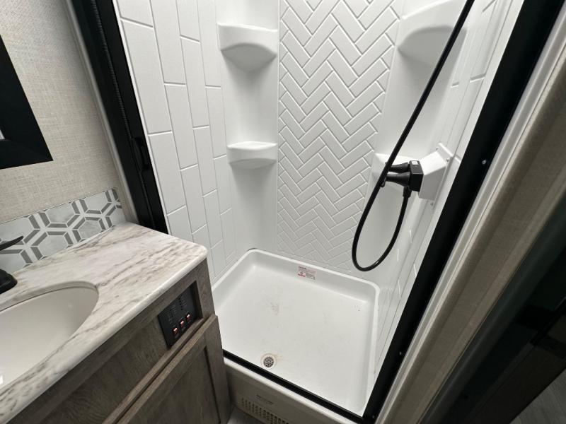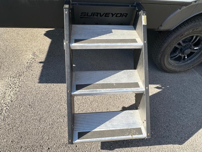 With any Grand Surveyor travel trailer by Forest River you will enjoy turn-key ready-to-go features and quality construction! Each model includes Azdel composite walls and a gel coated fiberglass front cap with an automotive style tinted windshield for a sleek look. There are friction hinge black glass entry door(s), an adjustable platform step with a night light, a power tongue jack, plus many more exterior conveniences. The interior will have you feeling right at home with blackout slow close roller shades, residential faucets, sinks, and bathroom vanity, plus Surf(x) seamless countertops throughout. You can also plan for adventure with a rear bike/utility rack included and there is a Bluetooth soundbar with speakers to listen to your favorite tunes while you're at the campground!